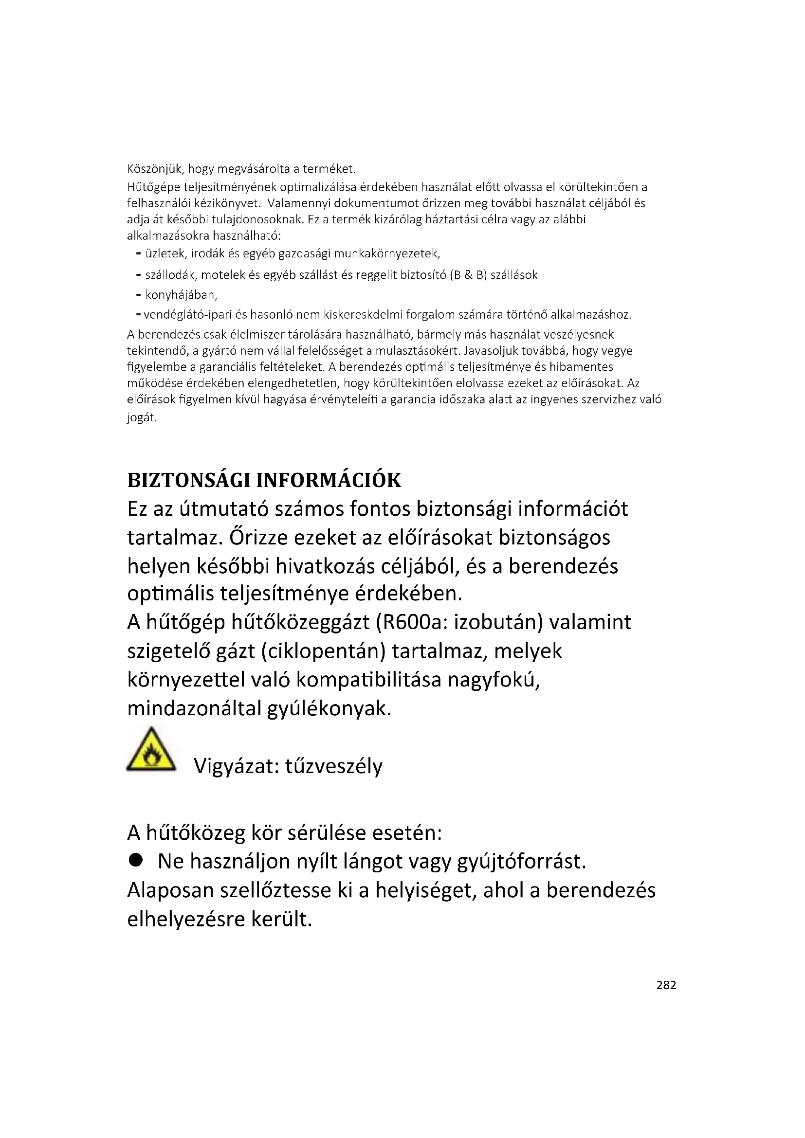 Ez az útmutató számos fontos biztonsági információt tartalmaz. Őrizze ezeket az előírásokat biztonságos helyen későbbi hivatkozás céljából, és a berendezés optimális teljesítménye érdekében. A hűtőgép hűtőközeggázt (R600a: izobután) valamint szigetelő gázt (ciklopentán) tartalmaz, melyek környezettel való kompatibilitása nagyfokú, mindazonáltal gyúlékonyak. Vigyázat: tűzveszély A hűtőközeg kör sérülése esetén: Ne használjon nyílt lángot vagy gyújtóforrást. Alaposan szellőztesse ki a helyiséget, ahol a berendezés elhelyezésre került. Átlagos üzemidő:8℃:Üzemelés11perc,leállás 20perc283