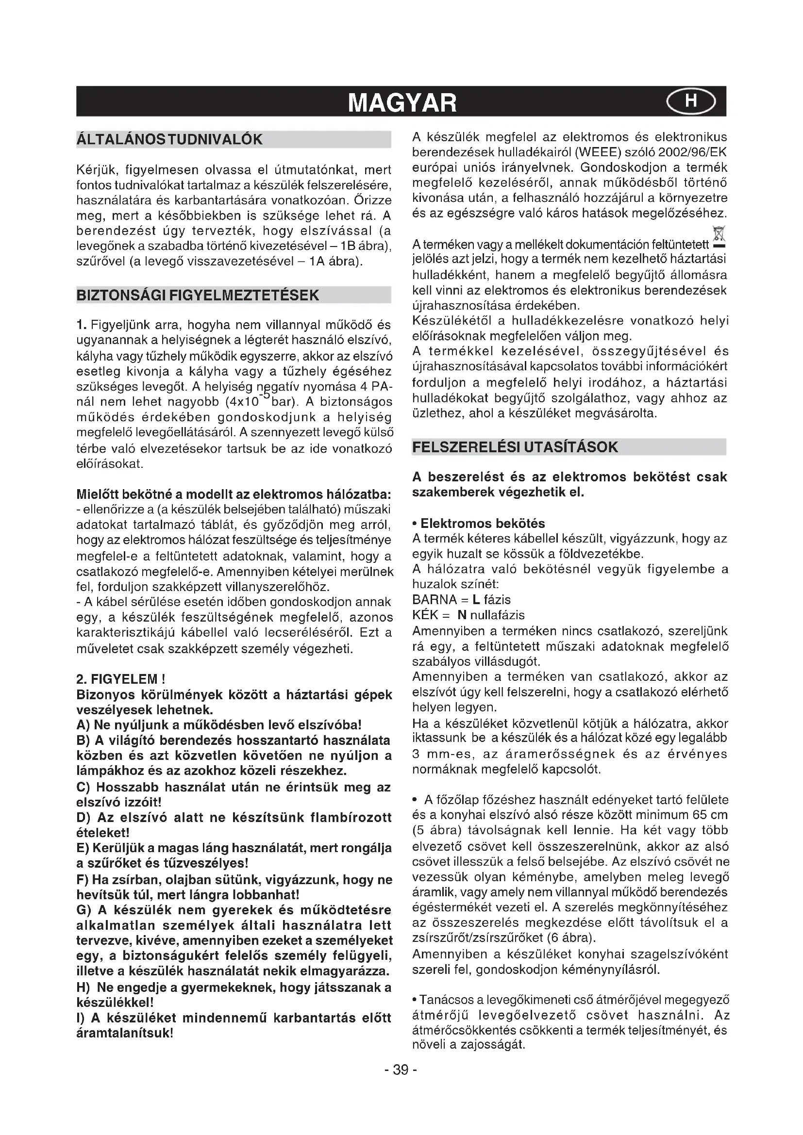 Bizonyos körülmények között a háztartási gépek veszélyesek lehetnek. A) Ne nyúljunk a működésben levő elszívóba! B) A világító berendezés hosszantartó használata közben és azt közvetlen követően ne nyúljon a lámpákhoz és az azokhoz közeli részekhez. C) Hosszabb használat után ne érintsük meg az elszívó izzóit! D) Az elszívó alatt ne készítsünk flambírozott ételeket! E) Kerüljük a magas láng használatát, mert rongálja a szűrőket és tűzveszélyes! F) Ha zsírban, olajban sütünk, vigyázzunk, hogy ne hevítsük túl, mert lángra lobbanhat! G) A készülék nem gyerekek és működtetésre alkalmatlan személyek általi használatra lett tervezve, kivéve, amennyiben ezeket a személyeket egy, a biztonságukért felelős személy felügyeli, illetve a készülék használatát nekik elmagyarázza. H) Ne engedje a gyermekeknek, hogy játsszanak a készülékkel!