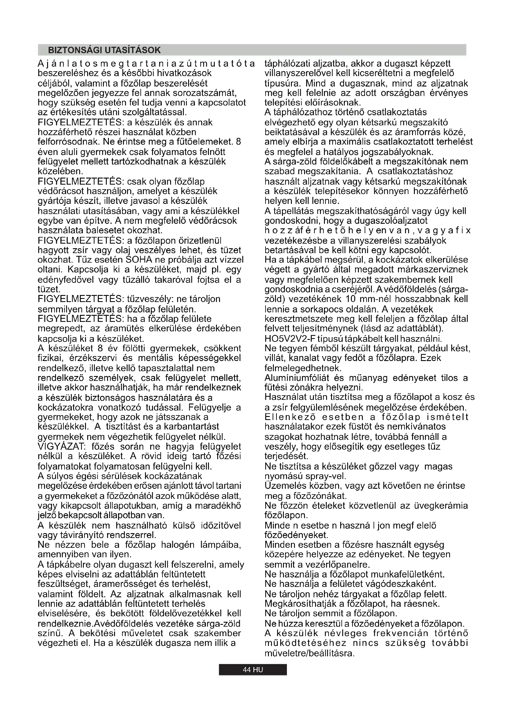 44 HU Ne használja a felületet vágódeszkaként. A tápellátás megszakíthatóságáról vagy úgy kell gondoskodni, hogy a dugaszolóaljzatot h o z z áf é r h e t ő h e l y en v a n , v a g y a f i x vezetékezésbe a villanyszerelési szabályok betartásával be kell kötni egy kapcsolót. Minden esetben a főzésre használt egység közepére helyezze az edényeket. Ne tegyen semmit a vezérlőpanelre. Ne főzzön ételeket közvetlenül az üvegkerámia főzőlapon. A készülék névleges frekvenc$án történő mű ködtetéséhez n$ncs szükség tovább$ műveletre/beállításra. Ne tároljon nehéz tárgyakat a főzőlap felett. Megkárosíthatják a főzőlapot, ha ráesnek. Minde n esetbe n haszná l jon megf elelő főzőedényeket. Ha a tápkábel megsérül, a kockázatok elkerülése végett a gyártó által megadott márkaszerviznek vagy megfelelően képzett szakembernek kell gondoskodnia a cseréjéről.Avédőföldelés (sárga- zöld) vezetékének 10 mm-nél hosszabbnak kell lennie a sorkapocs oldalán. A vezetékek keresztmetszete meg kell feleljen a főzőlap által felvett teljesítménynek (lásd az adattáblát). HO5V2V2-F típusú tápkábelt kell használni. Ne tisztítsa a készüléket gőzzel vagy magas nyomású spray-vel. Üzemelés közben, vagy azt követően ne érintse meg a főzőzónákat. táphálózati aljzatba, akkor a dugaszt képzett villanyszerelővel kell kicseréltetni a megfelelő típusúra. Mind a dugasznak, mind az aljzatnak meg kell felelnie az adott országban érvényes telepítési előírásoknak. A sárga-zöld földelőkábelt a megszakítónak nem szabad megszakítania. A csatlakoztatáshoz használt aljzatnak vagy kétsarkú megszakítónak a készülék telepítésekor könnyen hozzáférhető helyen kell lennie. Ne tegyen fémből készült tárgyakat, például kést, villát, kanalat vagy fedőt a főzőlapra. Ezek felmelegedhetnek. Alumíniumfóliát és műanyag edényeket tilos a fűtési zónákra helyezni. A táphálózathoz történő csatlakoztatás elvégezhető egy olyan kétsarkú megszakító beiktatásával a készülék és az áramforrás közé, amely elbírja a maximális csatlakoztatott terhelést és megfelel a hatályos jogszabályoknak. Ne használja a főzőlapot munkafelületként. Ne húzza keresztül a főzőedényeket a főzőlapon. Ne tároljon semmit a főzőlapon. Használat után tisztítsa meg a főzőlapot a kosz és a zsír felgyülemlésének megelőzése érdekében. El len ke ző e set be n a f ő z őla p i smé tel t használatakor ezek füstöt és nemkívánatos szagokat hozhatnak létre, továbbá fennáll a veszély, hogy elősegítik egy esetleges tűz terjedését.Hagyjon legalább 55 mm távolságot a fal és a főzőlap között, valamint legalább 150 mm távolságot oldalt a főzőlap és a függőleges bútorok vagy fal között. Amennyiben a főzőlap fölé bútort szerelnek, legalább 700 mm távolságot kell hagyni közöttük. Ha elszívót szerelnek a főzőlap fölé, ellenőrizze az elszívóra meghatározott beszerelési előírásokat, de a főzőlap és az elszívó közötti távolság nem lehet kevesebb, mint 700 mm.