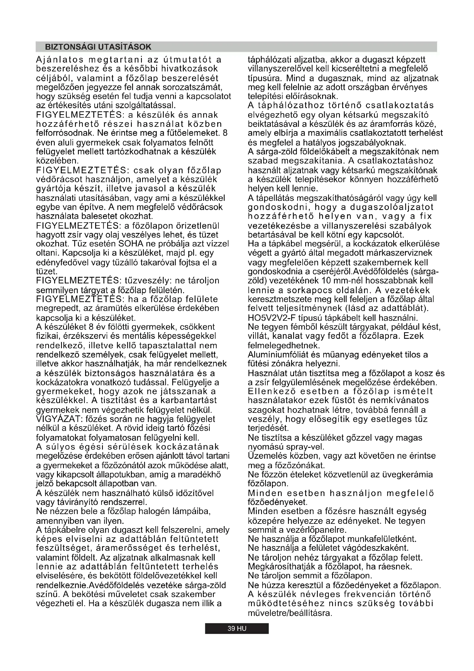 39 HU táphálózati aljzatba, akkor a dugaszt képzett villanyszerelővel kell kicseréltetni a megfelelő típusúra. Mind a dugasznak, mind az aljzatnak meg kell felelnie az adott országban érvényes telepítési előírásoknak. A táphálózathoz történő csatlakoztatás elvégezhető egy olyan kétsarkú megszakító beiktatásával a készülék és az áramforrás közé, amely elbírja a maximális csatlakoztatott terhelést és megfelel a hatályos jogszabályoknak. A sárga-zöld földelőkábelt a megszakítónak nem szabad megszakítania. A csatlakoztatáshoz használt aljzatnak vagy kétsarkú megszakítónak a készülék telepítésekor könnyen hozzáférhető helyen kell lennie. A tápellátás megszakíthatóságáról vagy úgy kell gondoskodni, hogy a dugaszolóaljzatot hozzáférhető helyen van, vagy a fix vezetékezésbe a villanyszerelési szabályok betartásával be kell kötni egy kapcsolót. Ha a tápkábel megsérül, a kockázatok elkerülése végett a gyártó által megadott márkaszerviznek vagy megfelelően képzett szakembernek kell gondoskodnia a cseréjéről.Avédőföldelés (sárga- zöld) vezetékének 10 mm-nél hosszabbnak kell lennie a sorkapocs oldalán. A vezetékek keresztmetszete meg kell feleljen a főzőlap által felvett teljesítménynek (lásd az adattáblát). HO5V2V2-F típusú tápkábelt kell használni. Ne tegyen fémből készült tárgyakat, például kést, villát, kanalat vagy fedőt a főzőlapra. Ezek felmelegedhetnek. Alumíniumfóliát és műanyag edényeket tilos a fűtési zónákra helyezni. Használat után tisztítsa meg a főzőlapot a kosz és a zsír felgyülemlésének megelőzése érdekében. Ellenkező esetben a főzőlap ismételt használatakor ezek füstöt és nemkívánatos szagokat hozhatnak létre, továbbá fennáll a veszély, hogy elősegítik egy esetleges tűz terjedését. Ne tisztítsa a készüléket gőzzel vagy magas nyomású spray-vel. Üzemelés közben, vagy azt követően ne érintse meg a főzőzónákat. Ne főzzön ételeket közvetlenül az üvegkerámia főzőlapon. Minden esetben használjon megfelelő főzőedényeket. Minden esetben a főzésre használt egység közepére helyezze az edényeket. Ne tegyen semmit a vezérlőpanelre. Ne használja a főzőlapot munkafelületként. Ne használja a felületet vágódeszkaként. Ne tároljon nehéz tárgyakat a főzőlap felett. Megkárosíthatják a főzőlapot, ha ráesnek. Ne tároljon semmit a főzőlapon. Ne húzza keresztül a főzőedényeket a főzőlapon. A készülék névleges frekvencºán történő működtetéséhez nºncs szükség továbbº műveletre/beállításra.T TERMÉKKÓD Azonosító tábla (a főzőlap burkolatának alsó felén)