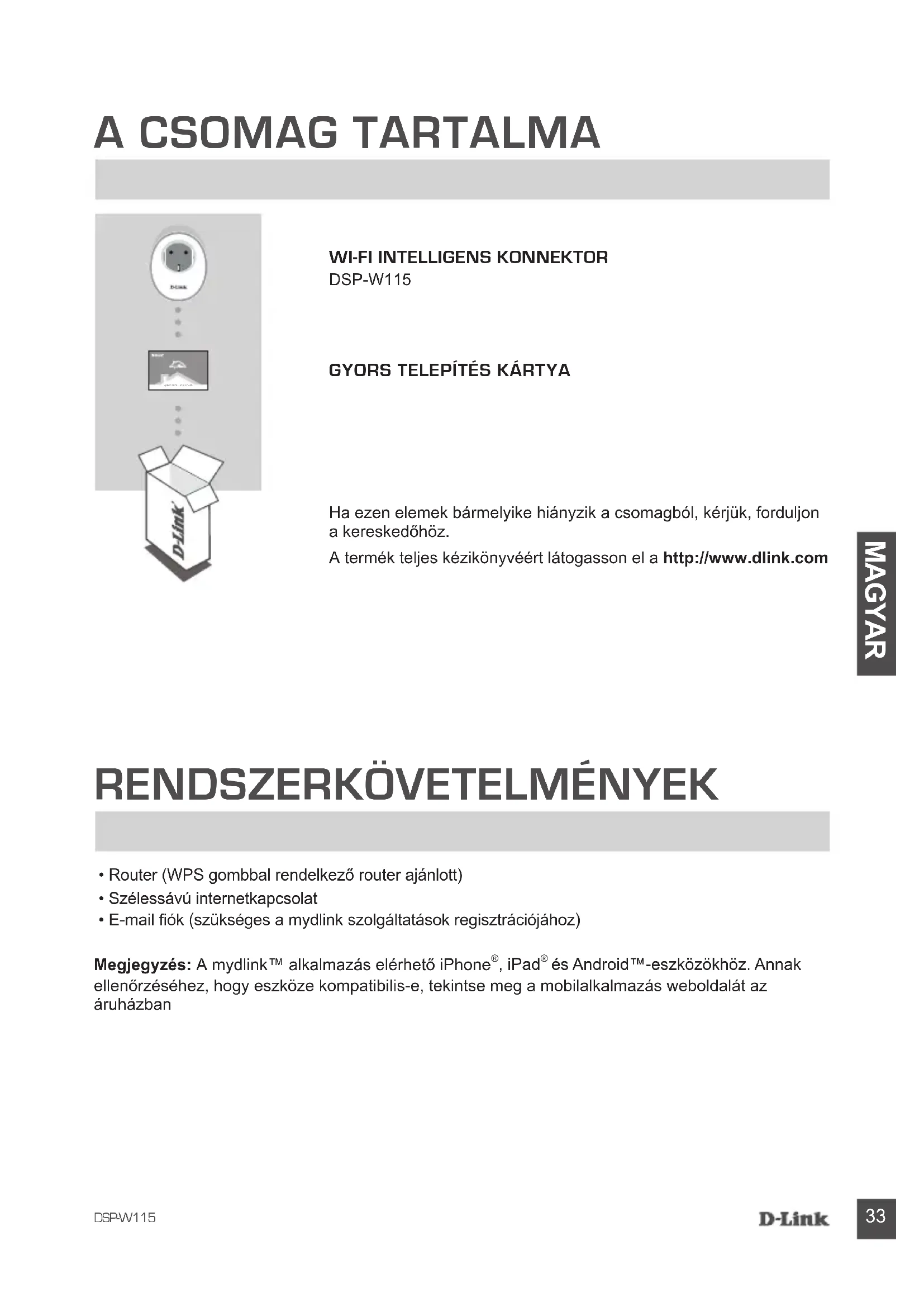 és Android™-eszközökhöz. Annak ellenőrzéséhez, hogy eszköze kompatibilis-e, tekintse meg a mobilalkalmazás weboldalát az áruházban Ha ezen elemek bármelyike hiányzik a csomagból, kérjük, forduljon a kereskedőhöz. A termék teljes kézikönyvéért látogasson el a http://www.dlink.com