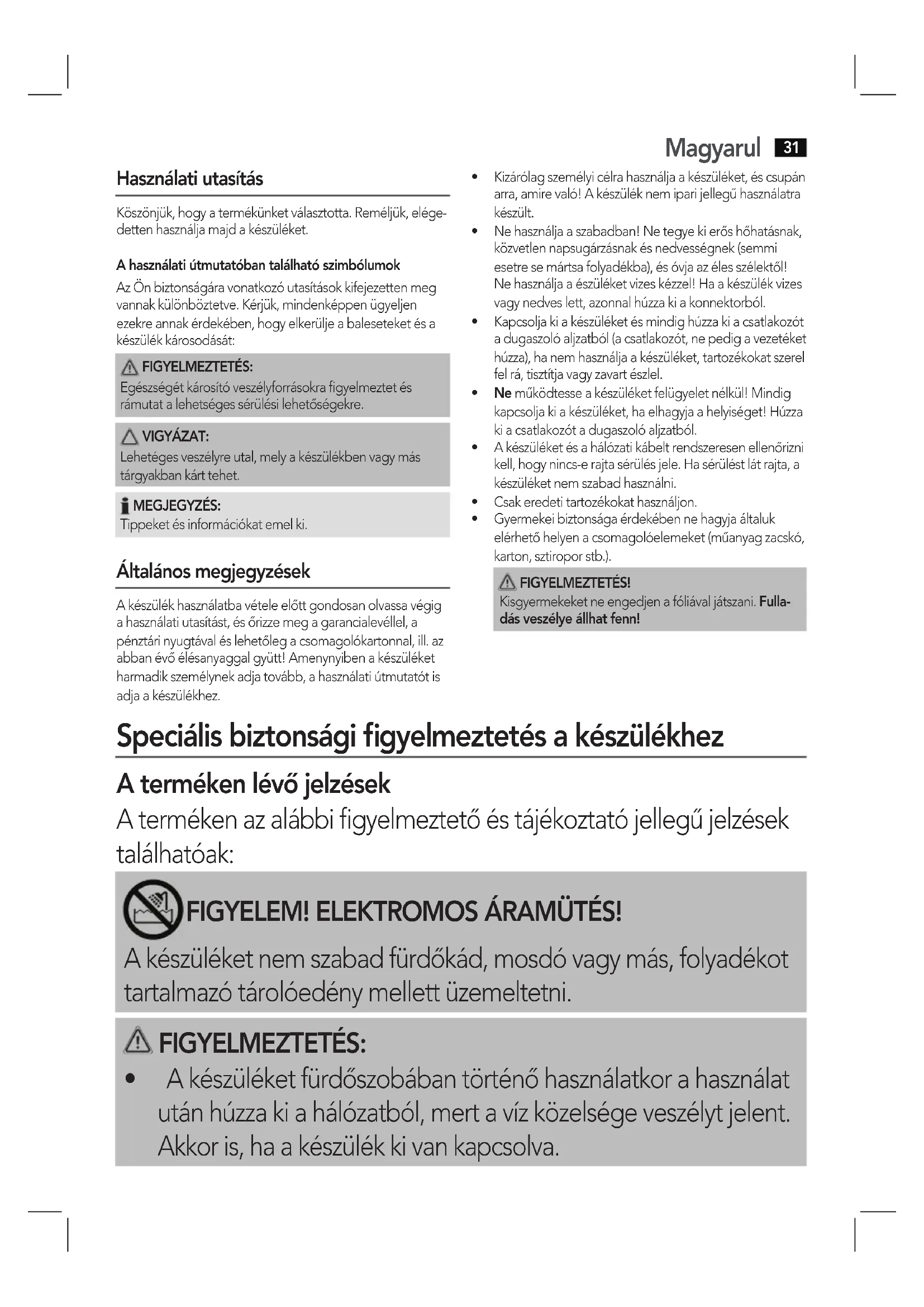 - Akészüléketfürdőszobábantörténőhasználatkorahasználat utánhúzzakiahálózatból,mertavízközelségeveszélytjelent. Akkoris,haakészülékkivankapcsolva.Magyarul
