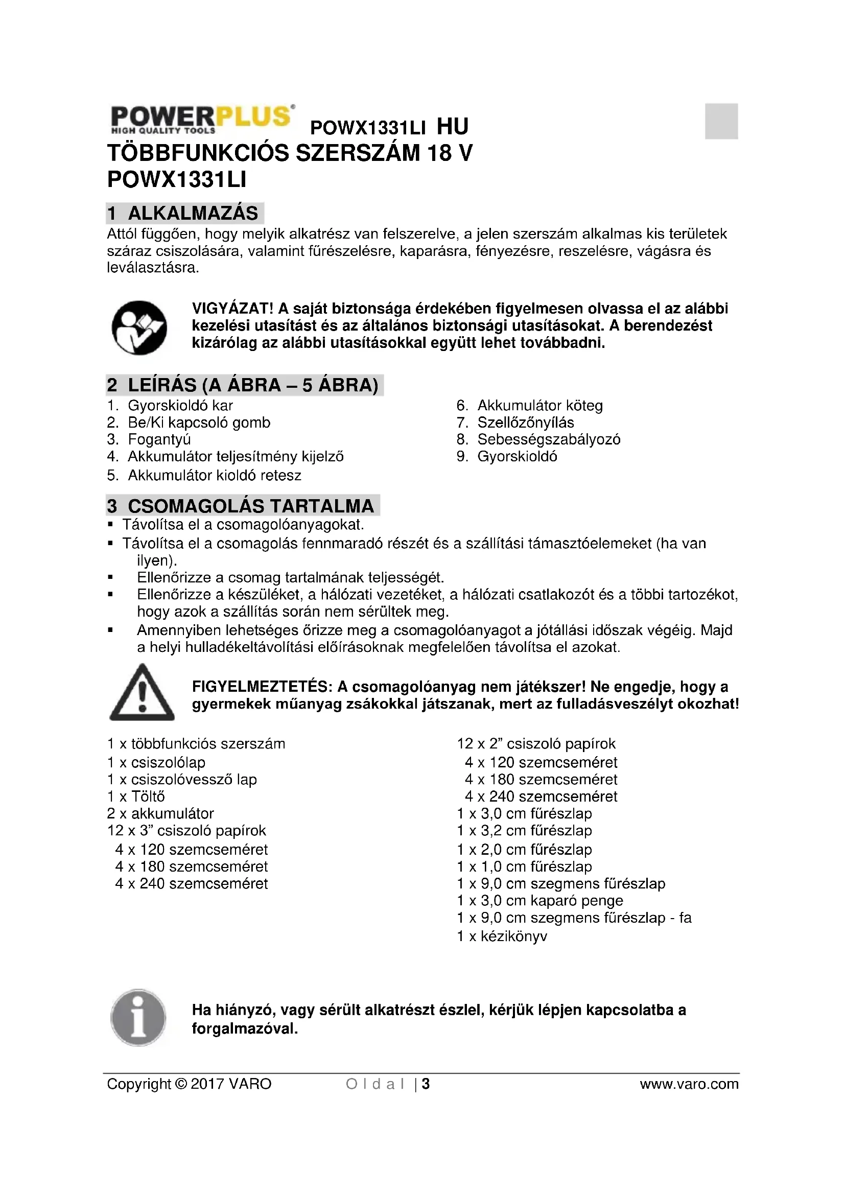 12 x 2” csiszoló papírok 4 x 120 szemcseméret 4 x 180 szemcseméret 4 x 240 szemcseméret 1 x 3,0 cm fűrészlap 1 x 3,2 cm fűrészlap 1 x 2,0 cm fűrészlap 1 x 1,0 cm fűrészlap 1 x 9,0 cm szegmens fűrészlap 1 x 3,0 cm kaparó penge 1 x 9,0 cm szegmens fűrészlap - fa 1 x kézikönyv Ha hiányzó, vagy sérült alkatrészt észlel, kérjük lépjen kapcsolatba a forgalmazóval.POWX1331LI HU Copyright © 2017 VARO O l d a l | 4 www.varo.com 4 JELZÉSEK A jelen kézikönyvben és/vagy a gépen az alábbi jelzéseket használtuk:
