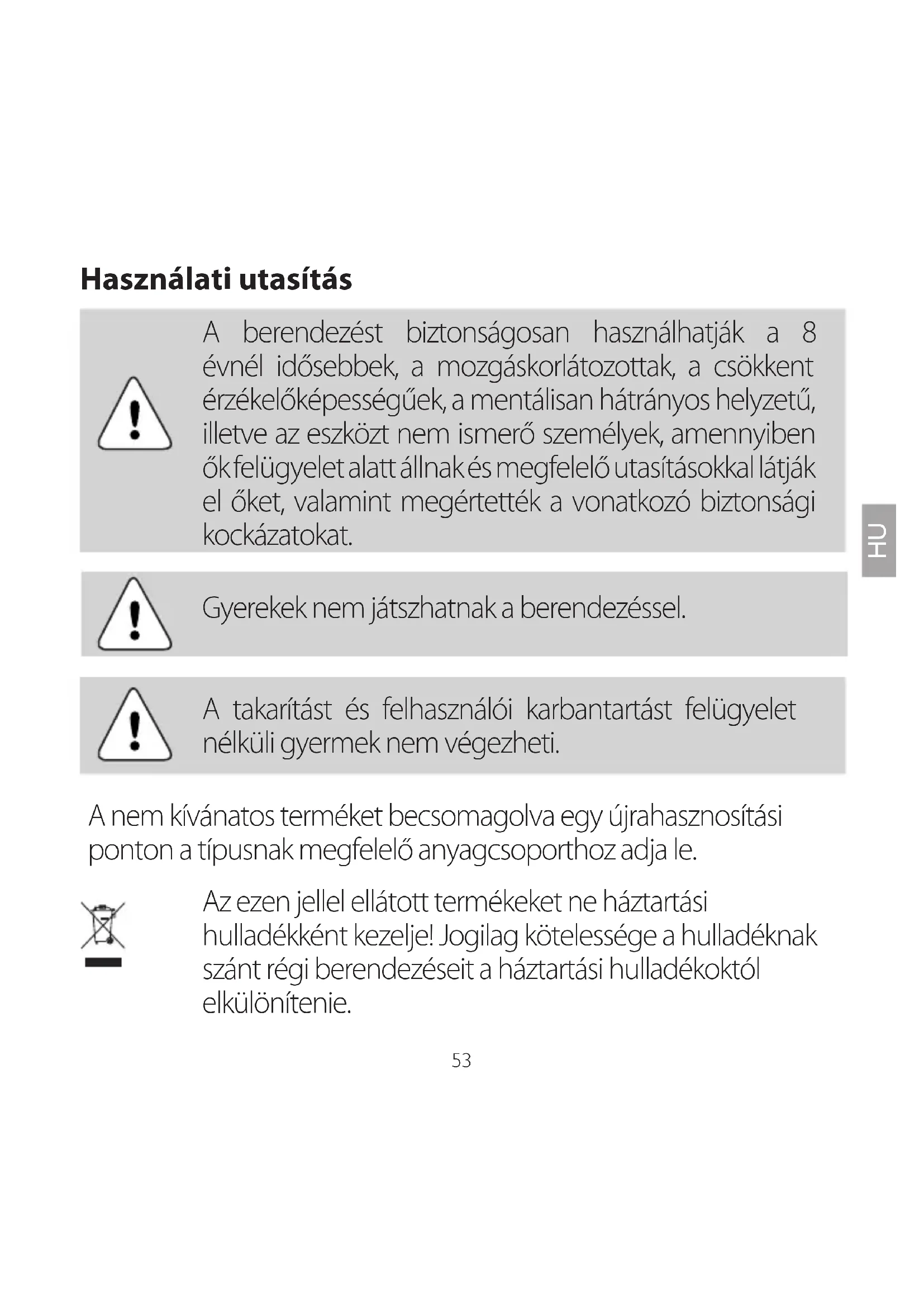A berendezést biztonságosan használhatják a 8 évnél idősebbek, a mozgáskorlátozottak, a csökkent érzékelőképességűek, a mentálisan hátrányos helyzetű, illetve az eszközt nem ismerő személyek, amennyiben ők felügyelet alatt állnak és megfelelő utasításokkal látják el őket, valamint megértették a vonatkozó biztonsági kockázatokat.