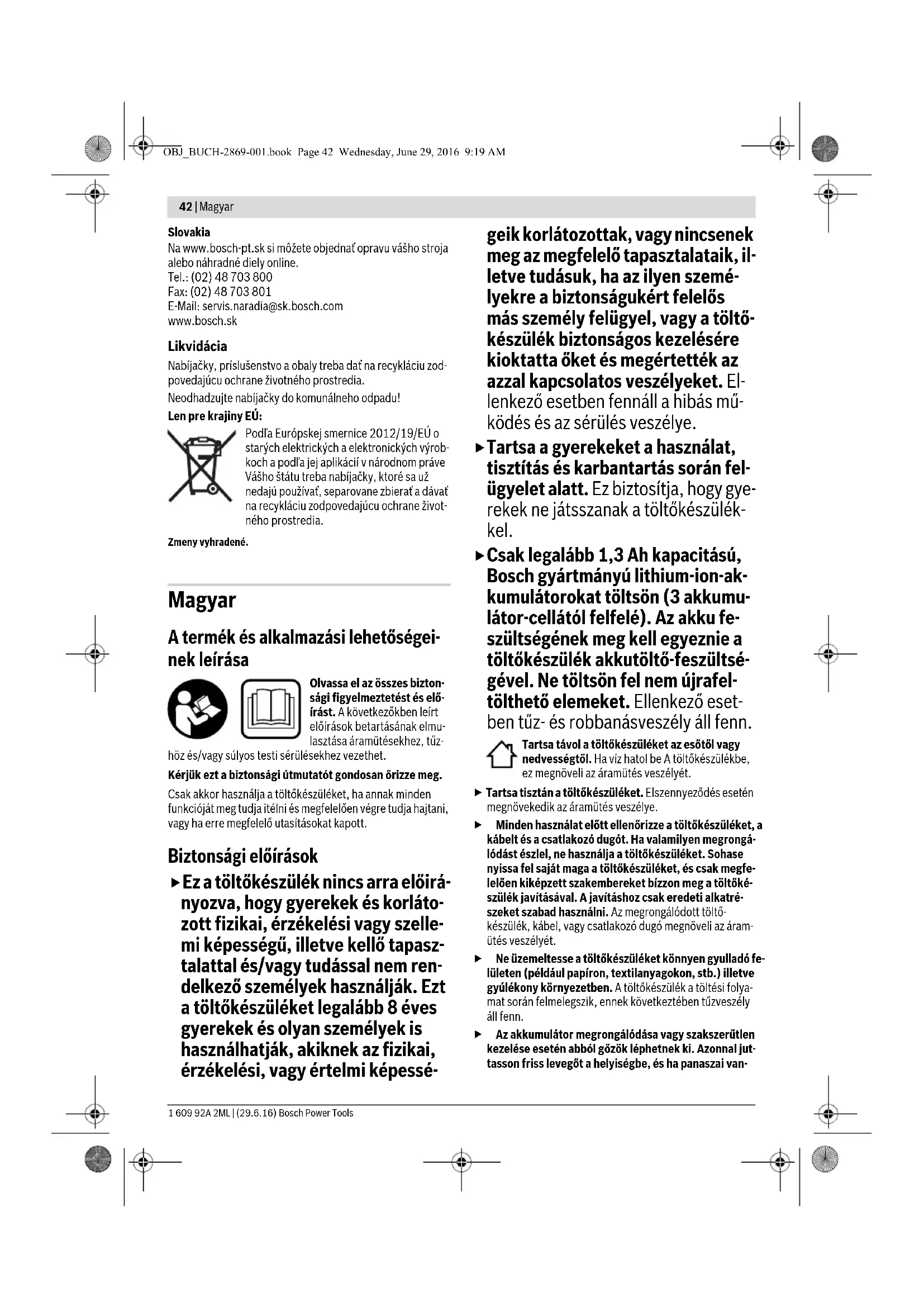 Hmotnosť podľa EPTA-Procedure 01:2014 kg 0,46 Trieda ochrany / II Nabíjačka GAL 1230 CV Príčina Odstránenie Červená indikácia nabíjania akumulátora 3 bliká Nabíjanie nie je možné Akumulátor nie je zasunutý (alebo nie je zasunutý správne) Vložte akumulátor do nabíjač- ky správne Kontakty akumulátora sú znečistené Vyčistite kontakty aku- mulátora; napríklad viacná- sobným zasunutím a vysunu- tím akumulátora, prípadne akumulátor vymeniť za nový Akumulátor je pokazený Akumulátor vymeniť za nový Indikácie nabíjania akumulátora 4 resp. 3 nesvietia Zástrčka nabíjačky nie je (nie je správne) zasunutá do zásuvky Zástrčku zasuňte do zásuvky (zasuňte ju celkom) Zásuvka, sieťová šnúra alebo nabíjačka je poškodená Skontrolujte sieťové napätie, nabíjačku dajte prípadne pre- skúšať v autorizovanej servis- nej opravovni ručného elek- trického náradia Bosch OBJ_BUCH-2869-001.book Page 41 Wednesday, June 29, 2016 9:19 AM42 | Magyar 1 609 92A 2ML | (29.6.16) Bosch Power Tools Slovakia Na www.bosch-pt.sk si môžete objednať opravu vášho stroja alebo náhradné diely online. Tel.: (02) 48 703 800 Fax: (02) 48 703 801 E-Mail: servis.naradia@sk.bosch.com www.bosch.sk Likvidácia Nabíjačky, príslušenstvo a obaly treba dať na recykláciu zod- povedajúcu ochrane životného prostredia. Neodhadzujte nabíjačky do komunálneho odpadu! Len pre krajiny EÚ: Podľa Európskej smernice 2012/19/EÚ o starých elektrických a elektronických výrob- koch a podľa jej aplikácií v národnom práve Vášho štátu treba nabíjačky, ktoré sa už nedajú používať, separovane zbierať a dávať na recykláciu zodpovedajúcu ochrane život- ného prostredia. Zmeny vyhradené. Magyar A termék és alkalmazási lehetőségei- nek leírása Olvassa el az összes bizton- sági figyelmeztetést és elő- írást. A következőkben leírt előírások betartásának elmu- lasztása áramütésekhez, tűz- höz és/vagy súlyos testi sérülésekhez vezethet. Kérjük ezt a biztonsági útmutatót gondosan őrizze meg. Csak akkor használja a töltőkészüléket, ha annak minden funkcióját meg tudja itélni és megfelelően végre tudja hajtani, vagy ha erre megfelelő utasításokat kapott. Biztonsági előírások Ez a töltőkészülék nincs arra előirá- nyozva, hogy gyerekek és korláto- zott fizikai, érzékelési vagy szelle- mi képességű, illetve kellő tapasz- talattal és/vagy tudással nem ren- delkező személyek használják. Ezt a töltőkészüléket legalább 8 éves gyerekek és olyan személyek is használhatják, akiknek az fizikai, érzékelési, vagy értelmi képessé- geik korlátozottak, vagy nincsenek meg az megfelelő tapasztalataik, il- letve tudásuk, ha az ilyen szemé- lyekre a biztonságukért felelős más személy felügyel, vagy a töltő- készülék biztonságos kezelésére kioktatta őket és megértették az azzal kapcsolatos veszélyeket. El- lenkező esetben fennáll a hibás mű- ködés és az sérülés veszélye. Tartsa a gyerekeket a használat, tisztítás és karbantartás során fel- ügyelet alatt. Ez biztosítja, hogy gye- rekek ne játsszanak a töltőkészülék- kel. Csak legalább 1,3 Ah kapacitású, Bosch gyártmányú lithium-ion-ak- kumulátorokat töltsön (3 akkumu- látor-cellától felfelé). Az akku fe- szültségének meg kell egyeznie a töltőkészülék akkutöltő-feszültsé- gével. Ne töltsön fel nem újrafel- tölthető elemeket. Ellenkező eset- ben tűz- és robbanásveszély áll fenn. Tartsa távol a töltőkészüléket az esőtől vagy nedvességtől. Ha víz hatol be A töltőkészülékbe, ez megnöveli az áramütés veszélyét. Tartsa tisztán a töltőkészüléket. Elszennyeződés esetén megnövekedik az áramütés veszélye. Minden használat előtt ellenőrizze a töltőkészüléket, a kábelt és a csatlakozó dugót. Ha valamilyen megrongá- lódást észlel, ne használja a töltőkészüléket. Sohase nyissa fel saját maga a töltőkészüléket, és csak megfe- lelően kiképzett szakembereket bízzon meg a töltőké- szülék javításával. A javításhoz csak eredeti alkatré- szeket szabad használni. Az megrongálódott töltő- készülék, kábel, vagy csatlakozó dugó megnöveli az áram- ütés veszélyét. Ne üzemeltesse a töltőkészüléket könnyen gyulladó fe- lületen (például papíron, textilanyagokon, stb.) illetve gyúlékony környezetben. A töltőkészülék a töltési folya- mat során felmelegszik, ennek következtében tűzveszély áll fenn. Az akkumulátor megrongálódása vagy szakszerűtlen kezelése esetén abból gőzök léphetnek ki. Azonnal jut- tasson friss levegőt a helyiségbe, és ha panaszai van- OBJ_BUCH-2869-001.book Page 42 Wednesday, June 29, 2016 9:19 AMMagyar | 43 Bosch Power Tools 1 609 92A 2ML | (29.6.16) nak, keressen fel egy orvost. A gőzök ingerelhetik a légutakat. Ne takarja le a töltőkészülék szellőzőnyílását. A töltőké- szülék ellenkező esetben túlmelegedhet és ekkor nem mű- ködik megfelelően. Az ábrázolásra kerülő komponensek A készülék ábrázolásra kerülő komponenseinek sorszámozá- sa a töltőkészüléknek az ábra-oldalon található képére vonat- kozik. 1 Akkumulátor* 2 Töltőkosár 3 Piros akkumulátor töltéskijelző 4 Zöld akkumulátor töltéskijelző *A képeken látható vagy a szövegben leírt tartozékok részben nem tartoznak az standard szállítmányhoz. Tartozékprogramunkban valamennyi tartozék megtalálható. Műszaki adatok Üzemeltetés Üzembe helyezés Ügyeljen a helyes hálózati feszültségre! Az áramforrás feszültségének meg kell egyeznie a töltőkészülék típustáb- láján található adatokkal. A 230 V-os töltőkészülékeket 220 V hálózati feszültségről is szabad üzemeltetni. A töltési folyamat A töltési folyamat azonnal megkezdődik, mihelyt bedugja a töltőkészülé
