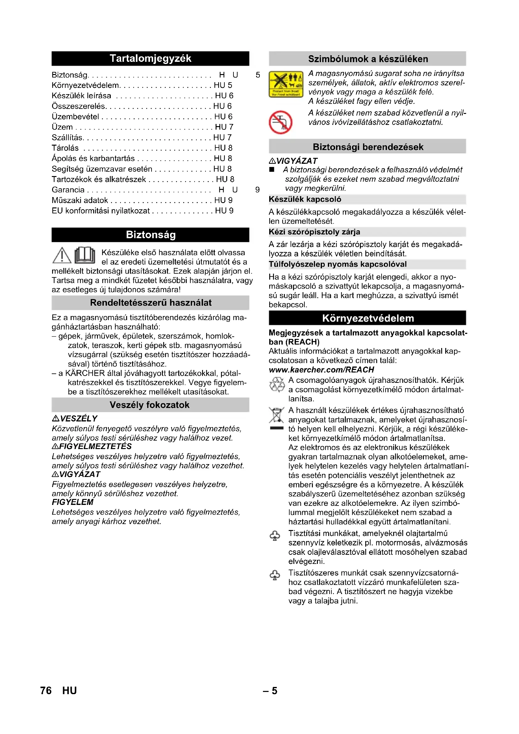 Нижеподписавшиеся лица действуют по поручению и по доверенности руководства предприятия. уполномоченный по документации: S. Reiser Alfred Kaercher GmbH & Co. KG Alfred-Kaercher-Str. 28 - 40 71364 Winnenden (Germany) Тел.: +49 7195 14-0 Факс: +49 7195 14-2212 Заявление о соответствии ЕU Продукт высоконапорный моющий прибор Тип: 1.676-xxx Основные директивы ЕU 2000/14/ЕС 2014/30/EU 2006/42/EC (+2009/127/EC) 2011/65/ЕC Примененные гармонизированные нормы EN 50581 EN 55014–1: 2006+A1: 2009+A2: 2011 EN 55014–2: 2015 EN 60335–1 EN 60335–2–79 EN 61000–3–2: 2014 EN 61000–3–3: 2013 EN 62233: 2008 Примененный порядок оценки соответствия 2000/14/ЕС: Приложение V Уровень мощности звука dB(A) Измерено: 88 Гарантировано: 90 Winnenden, 2016/04/01 CEO Head of Approbation 75RU– 5 Készüléke első használata előtt olvassa el az eredeti üzemeltetési útmutatót és a mellékelt biztonsági utasításokat. Ezek alapján járjon el. Tartsa meg a mindkét füzetet későbbi használatra, vagy az esetleges új tulajdonos számára! Ez a magasnyomású tisztítóberendezés kizárólag ma- gánháztartásban használható: – gépek, járművek, épületek, szerszámok, homlok- zatok, teraszok, kerti gépek stb. magasnyomású vízsugárral (szükség esetén tisztítószer hozzáadá- sával) történő tisztításához. – a KÄRCHER által jóváhagyott tartozékokkal, pótal- katrészekkel és tisztítószerekkel. Vegye figyelem- be a tisztítószerekhez mellékelt utasításokat. VESZÉLY Közvetlenül fenyegető veszélyre való figyelmeztetés, amely súlyos testi sérüléshez vagy halálhoz vezet. 몇 FIGYELMEZTETÉS Lehetséges veszélyes helyzetre való figyelmeztetés, amely súlyos testi sérüléshez vagy halálhoz vezethet. 몇 VIGYÁZAT Figyelmeztetés esetlegesen veszélyes helyzetre, amely könnyű sérüléshez vezethet. FIGYELEM Lehetséges veszélyes helyzetre való figyelmeztetés, amely anyagi kárhoz vezethet. 몇 VIGYÁZAT A biztonsági berendezések a felhasználó védelmét szolgálják és ezeket nem szabad megváltoztatni vagy megkerülni. A készülékkapcsoló megakadályozza a készülék vélet- len üzemeltetését. A zár lezárja a kézi szórópisztoly karját és megakadá- lyozza a készülék véletlen beindítását. Ha a kézi szórópisztoly karját elengedi, akkor a nyo- máskapcsoló a szivattyút lekapcsolja, a magasnyomá- sú sugár leáll. Ha a kart meghúzza, a szivattyú ismét bekapcsol. Megjegyzések a tartalmazott anyagokkal kapcsolat- ban (REACH) Aktuális információkat a tartalmazott anyagokkal kap- csolatosan a következő címen talál: www.kaercher.com/REACH Tartalomjegyzék Biztonság. . . . . . . . . . . . . . . . . . . . . . . . . . . .HU 5 Környezetvédelem. . . . . . . . . . . . . . . . . . . . . HU 5 Készülék leírása . . . . . . . . . . . . . . . . . . . . . . HU 6 Összeszerelés. . . . . . . . . . . . . . . . . . . . . . . . HU 6 Üzembevétel . . . . . . . . . . . . . . . . . . . . . . . . . HU 6 Üzem . . . . . . . . . . . . . . . . . . . . . . . . . . . . . . . HU 7 Szállítás. . . . . . . . . . . . . . . . . . . . . . . . . . . . . HU 7 Tárolás . . . . . . . . . . . . . . . . . . . . . . . . . . . . . HU 8 Ápolás és karbantartás . . . . . . . . . . . . . . . . . HU 8 Segítség üzemzavar esetén . . . . . . . . . . . . . HU 8 Tartozékok és alkatrészek . . . . . . . . . . . . . . . HU 8 Garancia . . . . . . . . . . . . . . . . . . . . . . . . . . . .HU 9 Műszaki adatok . . . . . . . . . . . . . . . . . . . . . . . HU 9 EU konformitási nyilatkozat . . . . . . . . . . . . . . HU 9 Biztonság Rendeltetésszerű használat Veszély fokozatok Szimbólumok a készüléken A magasnyomású sugarat soha ne irányítsa személyek, állatok, aktív elektromos szerel- vények vagy maga a készülék felé. A készüléket fagy ellen védje. A készüléket nem szabad közvetlenül a nyil- vános ivóvízellátáshoz csatlakoztatni. Biztonsági berendezések Készülék kapcsoló Kézi szórópisztoly zárja Túlfolyószelep nyomás kapcsolóval Környezetvédelem A csomagolóanyagok újrahasznosíthatók. Kérjük a csomagolást környezetkímélő módon ártalmat- lanítsa. A használt készülékek értékes újrahasznosítható anyagokat tartalmaznak, amelyeket újrahasznosí- tó helyen kell elhelyezni. Kérjük, a régi készüléke- ket környezetkímélő módon ártalmatlanítsa. Az elektromos és az elektronikus készülékek gyakran tartalmaznak olyan alkotóelemeket, ame- lyek helytelen kezelés vagy helytelen ártalmatlaní- tás esetén potenciális veszélyt jelenthetnek az emberi egészségre és a környezetre. A készülék szabályszerű üzemeltetéséhez azonban szükség van ezekre az alkotóelemekre. Az ilyen szimbó- lummal megjelölt készülékeket nem szabad a háztartási hulladékkal együtt ártalmatlanítani. Tisztítási munkákat, amelyeknél olajtartalmú szennyvíz keletkezik pl. motormosás, alvázmosás csak olajleválasztóval ellátott mosóhelyen szabad elvégezni. Tisztítószeres munkát csak szennyvízcsatorná- hoz csatlakoztatott vízzáró munkafelületen sza- bad végezni. A tisztítószert ne hagyja vizekbe vagy a talajba jutni. 76 HU– 6 Jelen használati útmutatóban a maximális felszereltség van leírva. A szállítási terjedelem modellenként eltérő (lásd a csomagoláson). A készülék szállítási terjedelme fel van tüntetve a cso- magoláson. Kicsomagoláskor ellenőrizze a csomagolás tartalmát, hogy megvan-e minden alkatrész. Hiányzó tartozék vagy szállítási sérülés esetén kérem, értesítse a kereskedőt. Az ábrá
