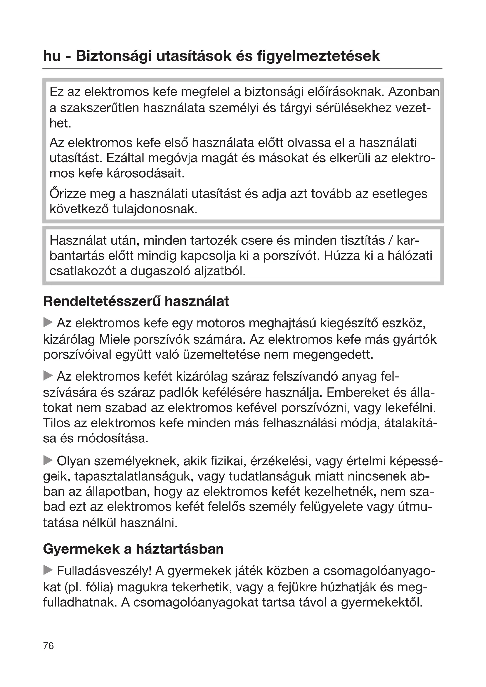 Ez az elektromos kefe megfelel a biztonsági előírásoknak. Azonban a szakszerűtlen használata személyi és tárgyi sérülésekhez vezet- het. Az elektromos kefe első használata előtt olvassa el a használati utasítást. Ezáltal megóvja magát és másokat és elkerüli az elektro- mos kefe károsodásait. Őrizze meg a használati utasítást és adja azt tovább az esetleges következő tulajdonosnak. Használat után, minden tartozék csere és minden tisztítás / kar- bantartás előtt mindig kapcsolja ki a porszívót. Húzza ki a hálózati csatlakozót a dugaszoló aljzatból. Rendeltetésszerű használat Az elektromos kefe egy motoros meghajtású kiegészítő eszköz, kizárólag Miele porszívók számára. Az elektromos kefe más gyártók porszívóival együtt való üzemeltetése nem megengedett. Az elektromos kefét kizárólag száraz felszívandó anyag fel- szívására és száraz padlók kefélésére használja. Embereket és álla- tokat nem szabad az elektromos kefével porszívózni, vagy lekefélni. Tilos az elektromos kefe minden más felhasználási módja, átalakítá- sa és módosítása. Olyan személyeknek, akik fizikai, érzékelési, vagy értelmi képessé- geik, tapasztalatlanságuk, vagy tudatlanságuk miatt nincsenek ab- ban az állapotban, hogy az elektromos kefét kezelhetnék, nem sza- bad ezt az elektromos kefét felelős személy felügyelete vagy útmu- tatása nélkül használni. Gyermekek a háztartásban Fulladásveszély! A gyermekek játék közben a csomagolóanyago- kat (pl. fólia) magukra tekerhetik, vagy a fejükre húzhatják és meg- fulladhatnak. A csomagolóanyagokat tartsa távol a gyermekektől.hu - Biztonsági utasítások és figyelmeztetések