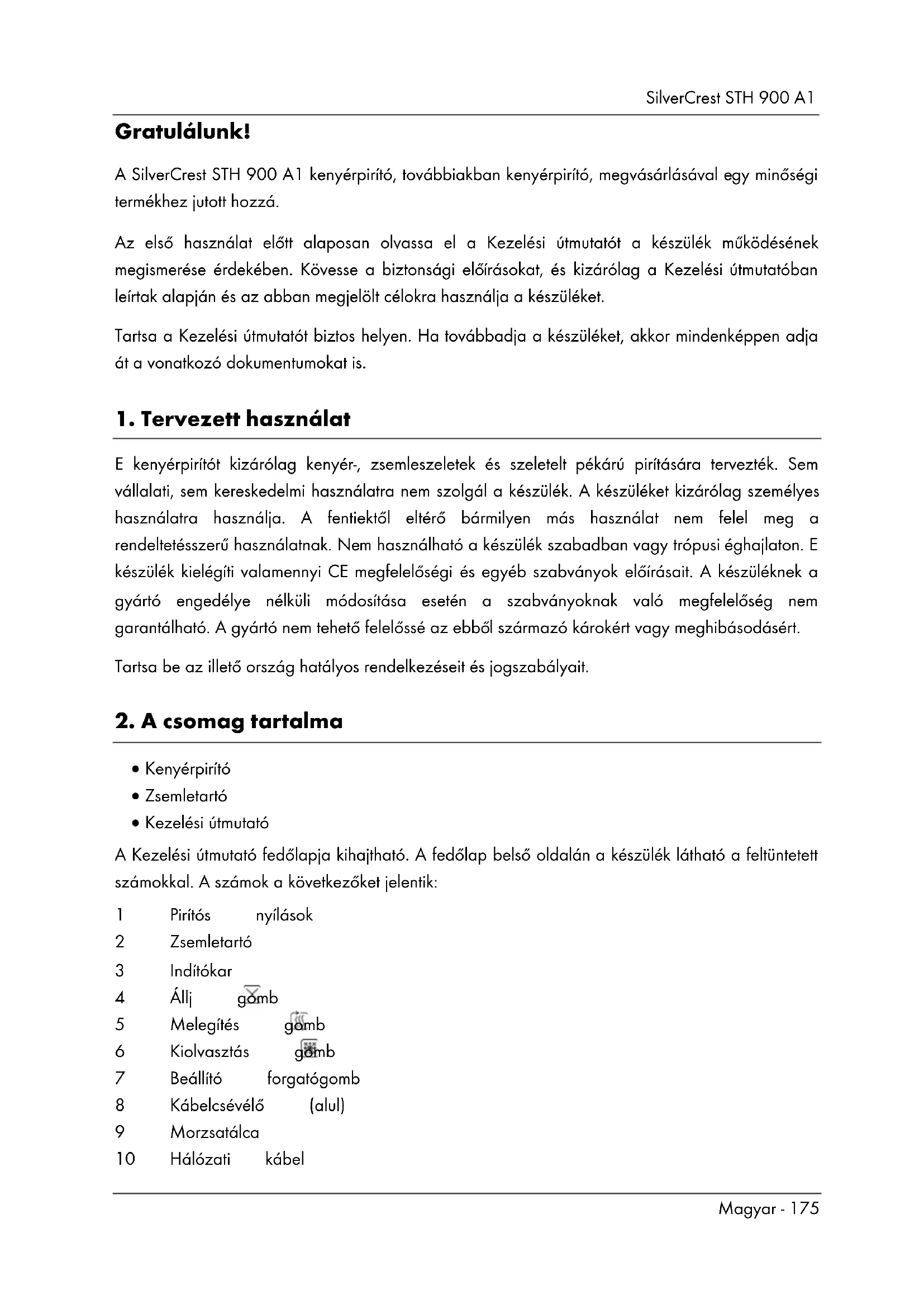 14. Garanciális és szerviz tájékoztatás ........................................................... 189SilverCrest STH 900 A1 Magyar - 175 Gratulálunk! A SilverCrest STH 900 A1 kenyérpirító, továbbiakban kenyérpirító, megvásárlásával egy minőségi termékhez jutott hozzá. Az első használat előtt alaposan olvassa el a Kezelési útmutatót a készülék működésének megismerése érdekében. Kövesse a biztonsági előírásokat, és kizárólag a Kezelési útmutatóban leírtak alapján és az abban megjelölt célokra használja a készüléket. Tartsa a Kezelési útmutatót biztos helyen. Ha továbbadja a készüléket, akkor mindenképpen adja át a vonatkozó dokumentumokat is.