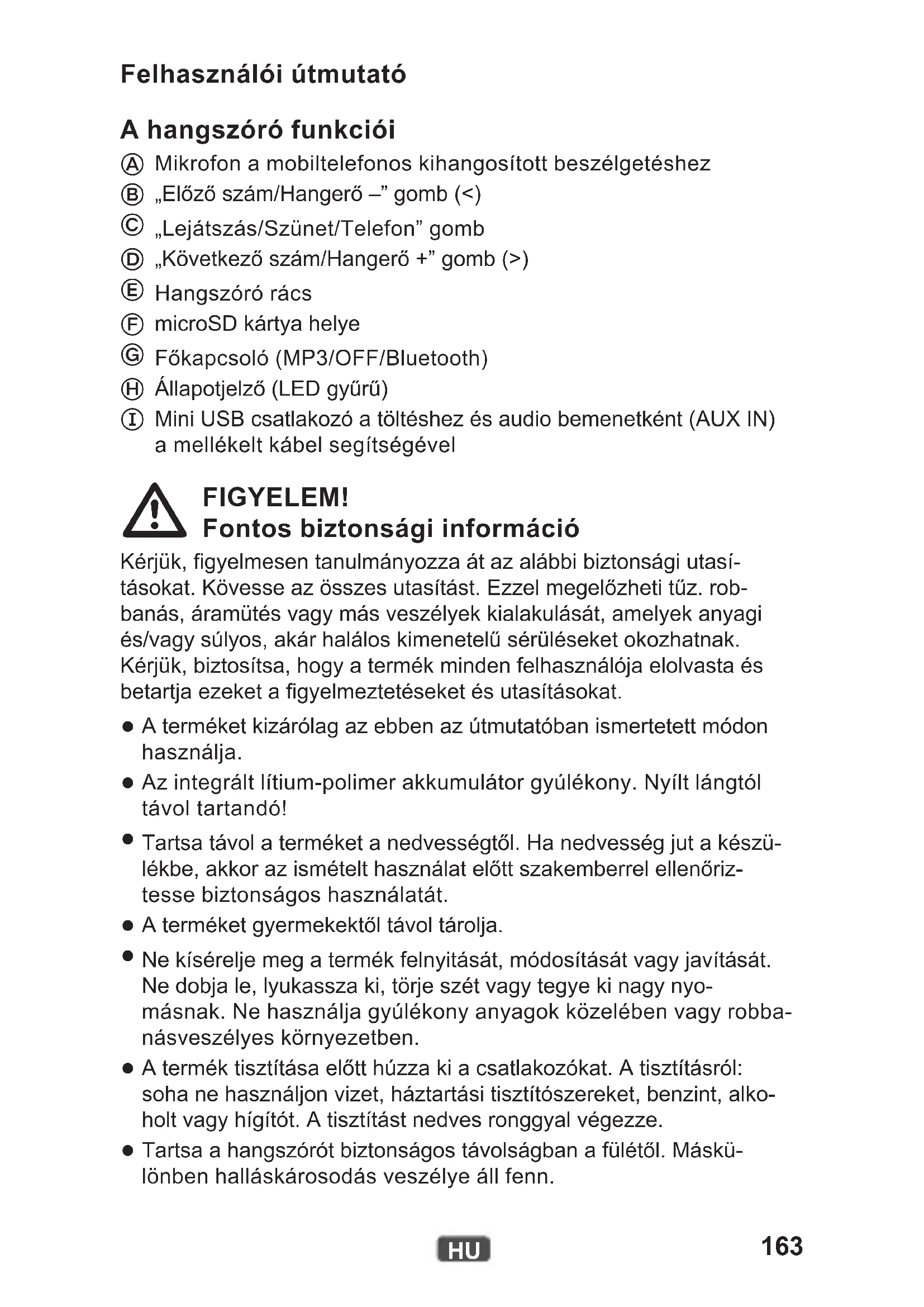 Mini USB csatlakozó a töltéshez és audio bemenetként (AUX IN) a mellékelt kábel segítségével FIGYELEM! Fontos biztonsági információ Kérjük, gyelmesen tanulmányozza át az alábbi biztonsági utasí- tásokat. Kövesse az összes utasítást. Ezzel megelőzheti tűz. rob- banás, áramütés vagy más veszélyek kialakulását, amelyek anyagi és/vagy súlyos, akár halálos kimenetelű sérüléseket okozhatnak. Kérjük, biztosítsa, hogy a termék minden felhasználója elolvasta és betartja ezeket a gyelmeztetéseket és utasításokat.