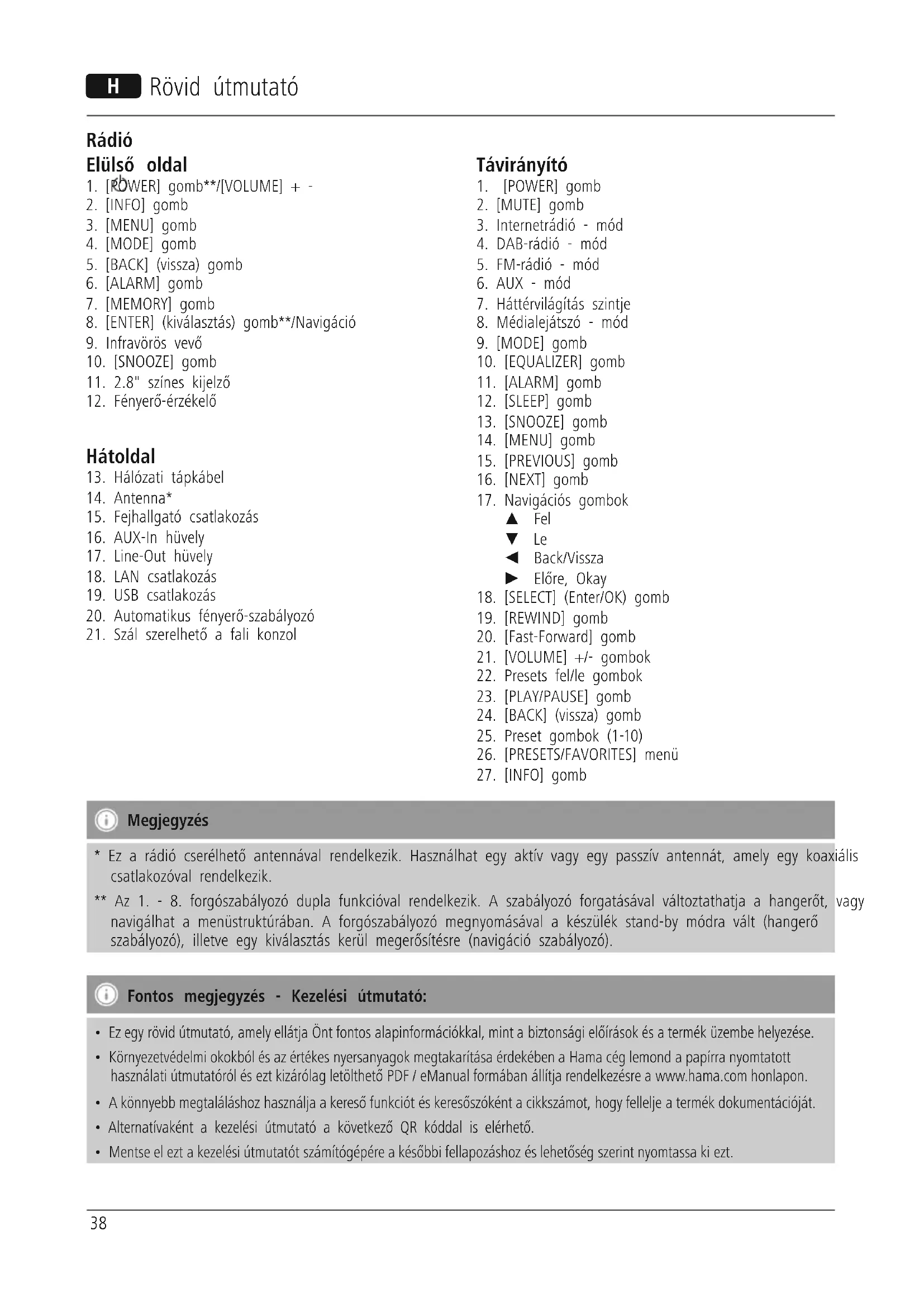 Töltse le az útmutatót a következőhöz Rádió PDF formátumban ingyenesen! Találja meg kézikönyvét DIR3115MS - HAMA és vegye vissza elektronikus eszközét a kezébe. Ezen az oldalon közzé van téve az eszköze használatához szükséges összes dokumentum. DIR3115MS márka HAMA.