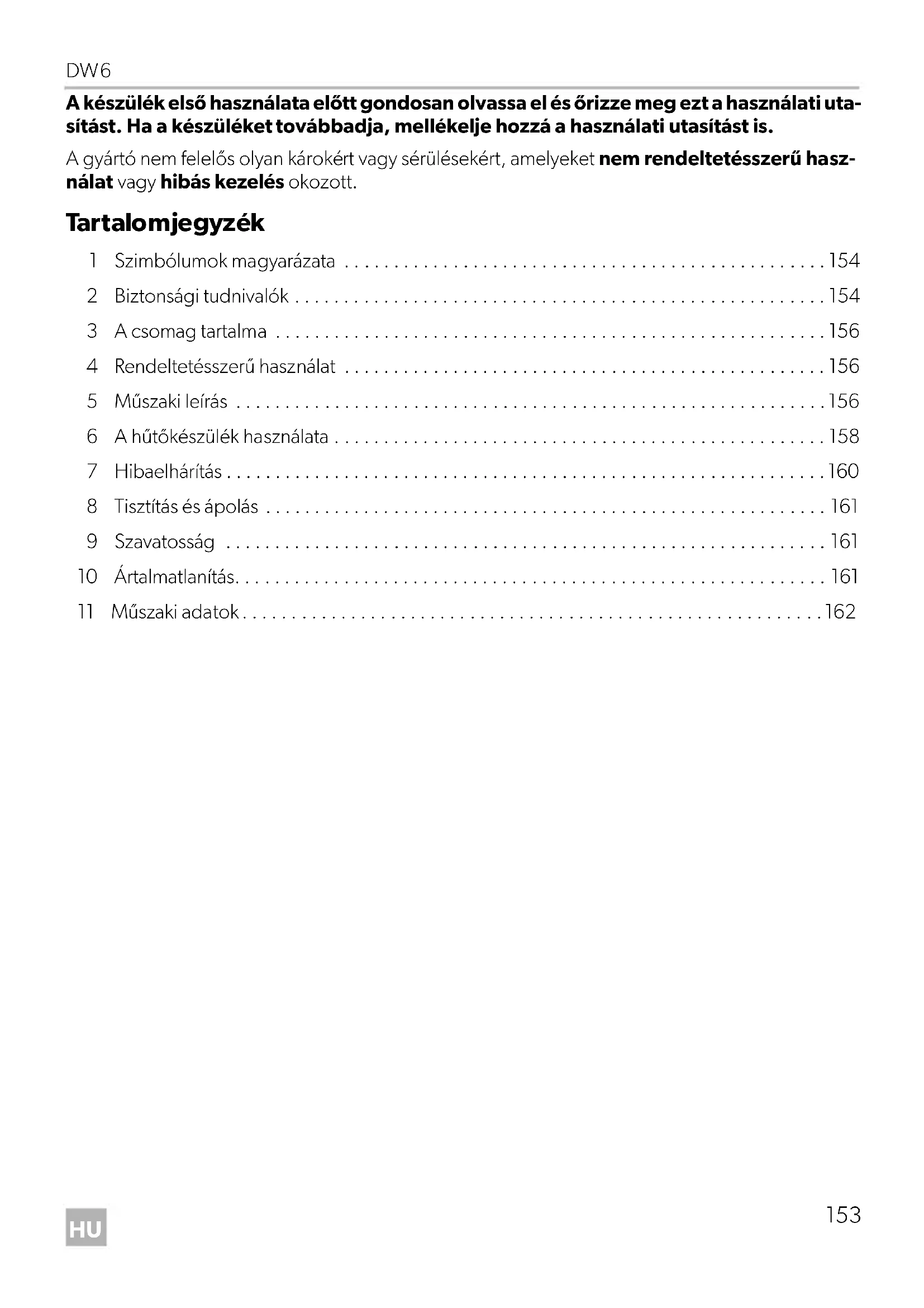 - 11 Műszaki adatok DW6-O-16s.book Seite 153 Montag, 3. April 2017 4:04 16Szimbólumok magyarázata DW6 p. 162