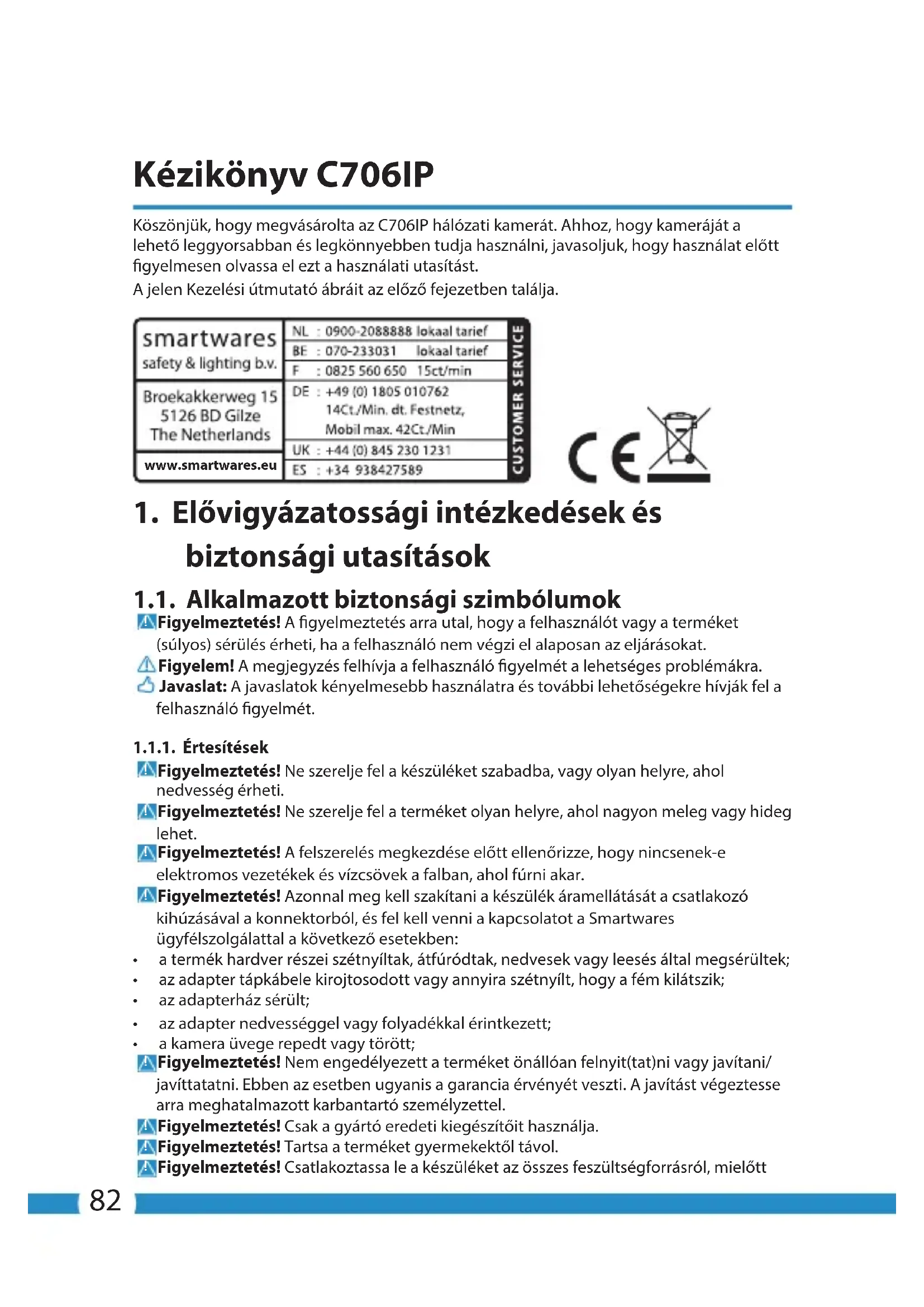 Na tento přístroj se vztahuje záruční lhůta 3 roky. Více o záručních podmínkách na: www. smartwares.eu.82 Kézikönyv C706IP Köszönjük, hogy megvásárolta az C706IP hálózati kamerát. Ahhoz, hogy kameráját a lehető leggyorsabban és legkönnyebben tudja használni, javasoljuk, hogy használat előtt gyelmesen olvassa el ezt a használati utasítást. A jelen Kezelési útmutató ábráit az előző fejezetben találja. www.smartwares.eu