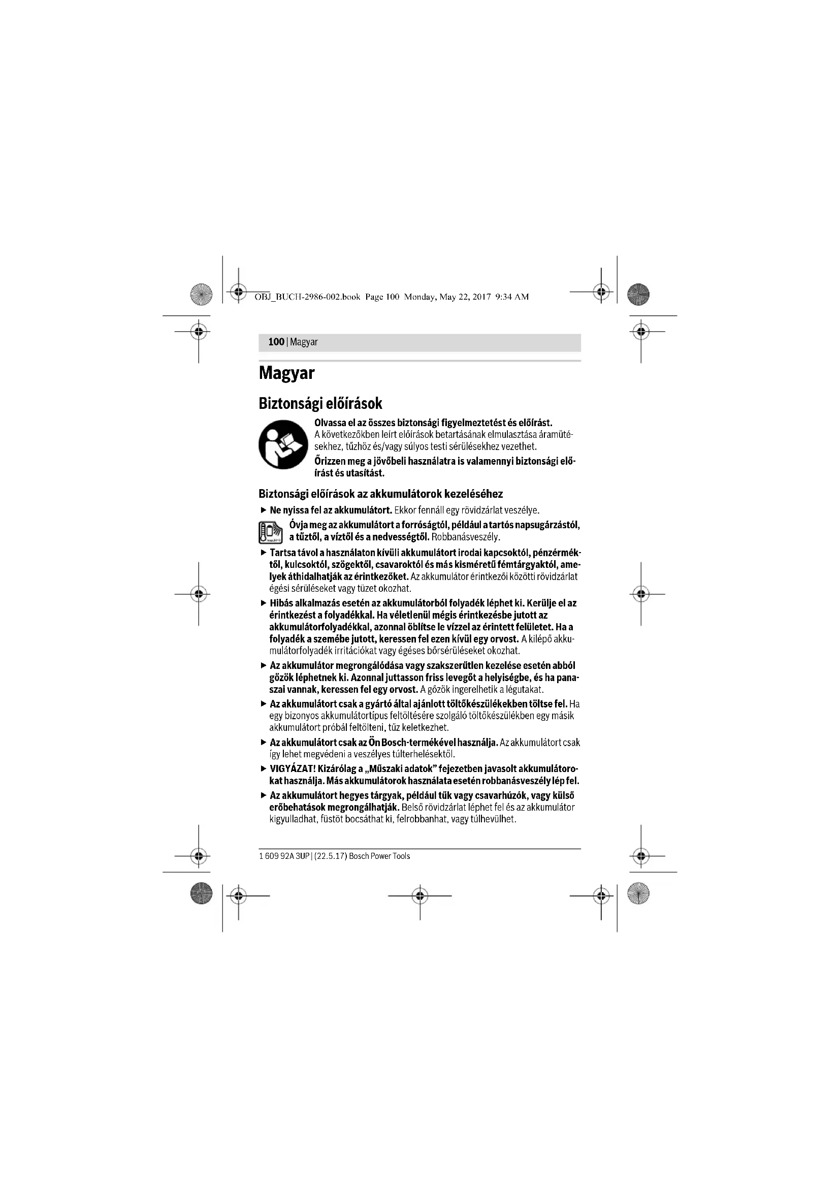 - Egyes külső USB-berendezéseket a műszaki adatok megegyezése ellenére sem lehet ezzel az ak- kumulátor adapterrel felölteni. Probléma Elhárítás módja OBJ_BUCH-2986-002.book Page 104 Monday, May 22, 2017 9:34 AMMagyar | 105 Bosch Power Tools 1 609 92A 3UP | (22.5.17) Szállítás A termékben található lithium-ion-akkumulátorokra a veszélyes árukra vonatkozó elő- írások érvényesek. A felhasználók az akkumulátorokat a közúti szállításban minden további nélkül szállíthatják. Ha az akkumulátorok szállításával harmadik személyt (például: légi vagy egyéb szállító vállalatot) bíznak meg, akkor figyelembe kell venni a csomagolásra és a megjelölésre vonatkozó különleges követelményeket. Ebben az esetben a küldemény előkészítésé- be be kell vonni egy veszélyes áru szakembert. Csak akkor küldje el az akkumulátort, ha a háza nincs megrongálódva. Ragassza le a nyitott érintkezőket és csomagolja be úgy az akkumulátort, hogy az a csomagoláson belül ne mozoghasson. Vegye figyelembe az adott országon belüli, az előbbieknél esetleg szigorúbb helyi elő- írásokat. Hulladékkezelés Az akkumulátor-adaptert, az akkumulátorokat, a tartozékokat és csomagoló- anyagokat a környezetvédelmi szempontoknak megfelelően kell újrafelhasz- nálásra leadni. Sohase dobja ki az akkumulátor-adaptert és az akkumulátorokat/elemeket a háztartási szemétbe! Akkumulátorok/elemek: Li-ion: Kérjük vegye figyelembe az „Szállítás” fejezetben, a 105 oldalon leírtakat. A változtatások joga fenntartva. OBJ_BUCH-2986-002.book Page 105 Monday, May 22, 2017 9:34 AM106 | Русский 1 609 92A 3UP | (22.5.17) Bosch Power Tools