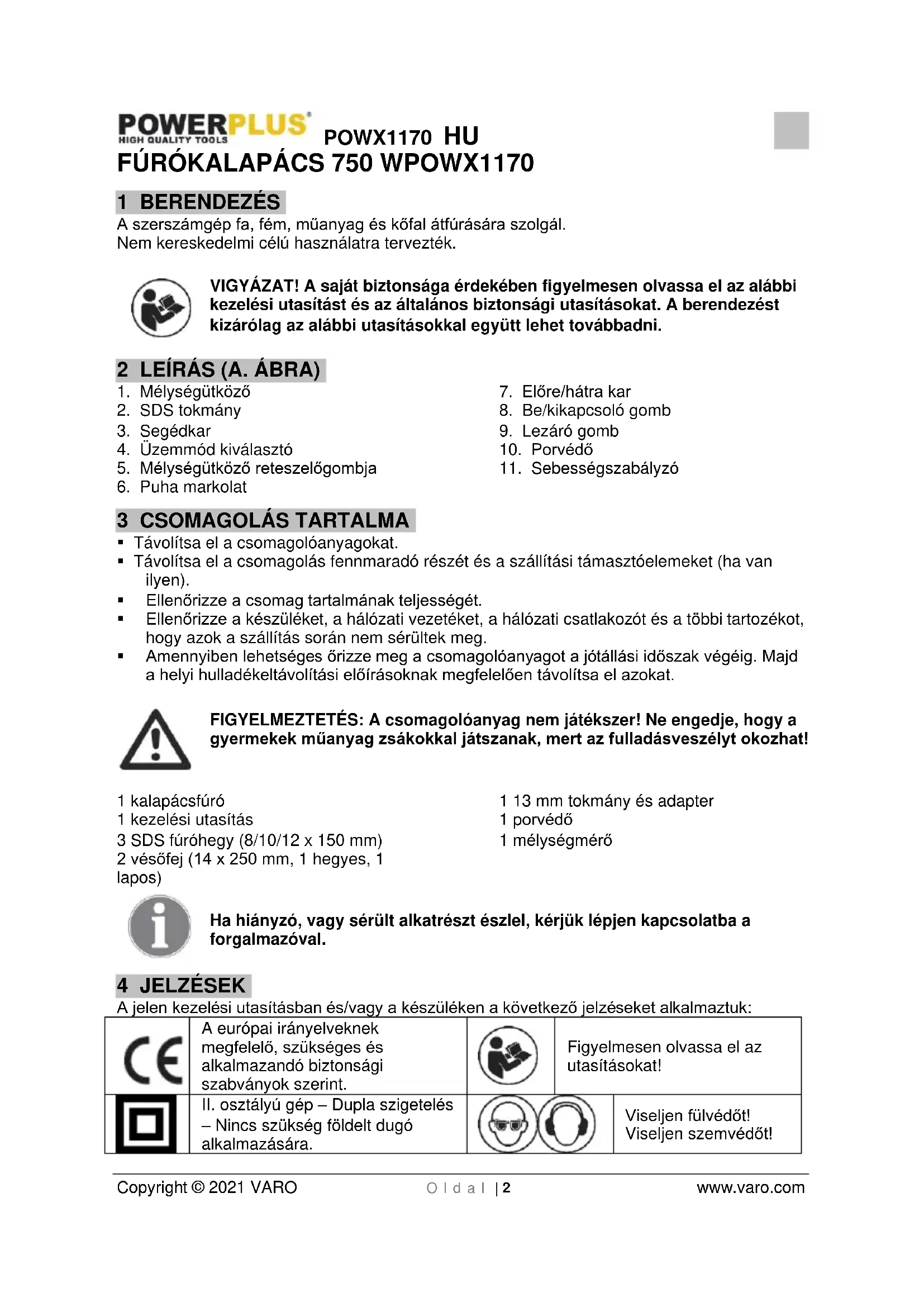 Az alábbi termékre 36 hónapos jótállási idõszak érvényes, mely azon a napon lép életbe, amikor az elsõ felhasználó megvásárolja a terméket. Ez a jótállás fedez minden anyagi vagy gyártási hibát, de nem tartalmazza: az akkumulátorokat, a töltőket, az elhasználódás következtében meghibásodott alkatrészeket, például a csapágyakat, keféket, vezetékeket, csatlakozókat, vagy más egyéb tartozékokat, mint például a fúrókat, fúrófejeket, fűrészlapokat stb.; a nem megfelelő felhasználásból, balesetből vagy a módosításból eredő sérüléseket és meghibásodásokat; sem pedig a szállítási díjat. A nem rendeltetésszerű használatból eredő károsodásokra és meghibásodásokra szintén nem vonatkozik a jótállás. A készülék nem rendeltetésszerű használatából eredő sérülésekért sem vállalunk felelősséget. A javításokat csak a Powerplus szerszámgépek javításához engedéllyel rendelkező ügyfélszolgálati központ végezheti el. Ha további információra van szüksége, hívja a 00 32 3 292 92 90 telefonszámot. A szállítási költségeket mindig az ügyfél viseli, kivéve, ha arról írásban másképp nem állapodnak meg. Ugyanakkor, ha a készülék sérülése a karbantartás elmulasztásának vagy túlterhelésnek a következménye, akkor a jótállásra nem lehet kárigényt benyújtani. Határozottan kizárja a jótállást az, ha a sérülés folyadék beszivárgásának, túl sok por bejutásának, szándékos rongálásnak (szándékos vagy túlzott gondatlanság), nem megfelelő használatnak (a készülék rendeltetésétől eltérő célra történő használat), illetéktelen használatnak (pl. a használati utasításban foglaltaknak figyelmen kívül hagyása), szakértelem nélküli összeszerelésnek, villámcsapásnak, hibás hálózati feszültségnek a következménye. Ez a lista nem korlátozó. A reklamáció elfogadása semmi esetben sem jelenti a jótállási időszak meghosszabbítását, sem pedig egy új jótállási időszak kezdetét a készülék cseréje esetén. Azok az eszközök és alkatrészek, melyek a jótállás keretében kerülnek kicserélésre, a Varo NV tulajdonát képezik.POWX1170 HU Copyright © 2021 VARO O l d a l | 9 www.varo.com Fenntartjuk a reklamáció visszautasításának jogát, amikor a vásárlást nem tudja igazolni, vagy amikor világos, hogy a termék karbantartását nem megfelelõen végezte. (tiszta szellõzõnyílások, rendszeresen ellenõrzött szénkefék,...) A vásárlási szelvényt a vásárlás idõpontjának bizonyításához meg kell õrizni. A szerszámot szétszerelés nélkül és elfogadhatóan tiszta állapotban kell visszaküldeni a forgalmazóhoz, az eredeti formakövetõ dobozban (ha tartozik ilyen az egységhez) és a vásárlási szelvénnyel együtt.