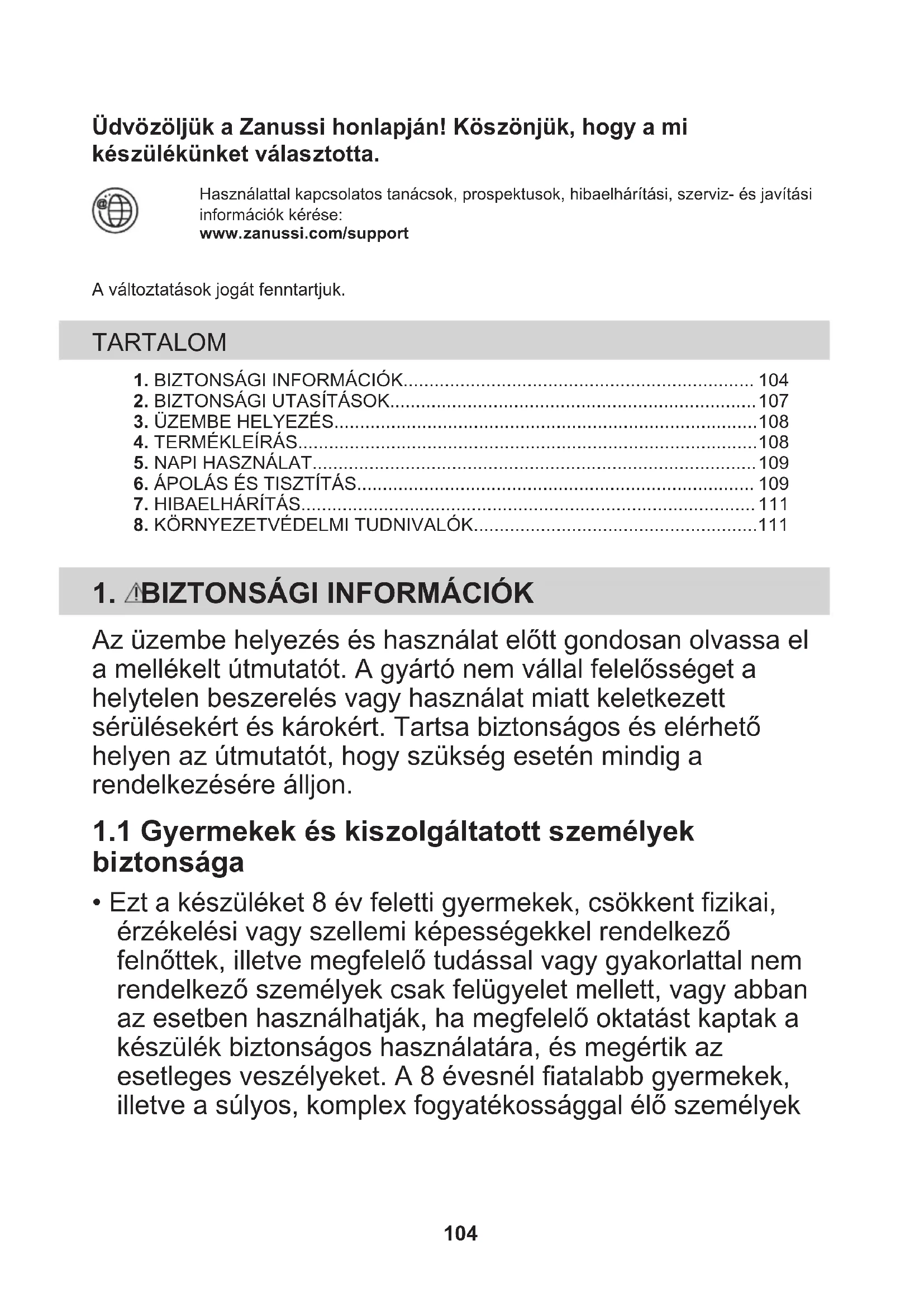 A következő jelzéssel ellátott anyagokat hasznosítsa újra. Újrahasznosításhoz tegye a megfelelő konténerekbe a csomagolást. Járuljon hozzá környezetünk és egészségünk védelméhez, és hasznosítsa újra az elektromos és elektronikus hulladékot. A 111tiltó szimbólummal ellátott készüléket ne dobja a háztartási hulladék közé. Juttassa el a készüléket a helyi újrahasznosító telepre, vagy lépjen kapcsolatba a hulladékkezelésért felelős hivatallal. 112Benvenuto in Zanussi! Grazie per aver scelto di acquistare questo prodotto. Ricevere consigli, scaricare i nostri opuscoli, eliminare eventuali anomalie, ottenereinformazioni sull'assistenza e la riparazione:www.zanussi.com/supportCon riserva di modifiche. INDICE