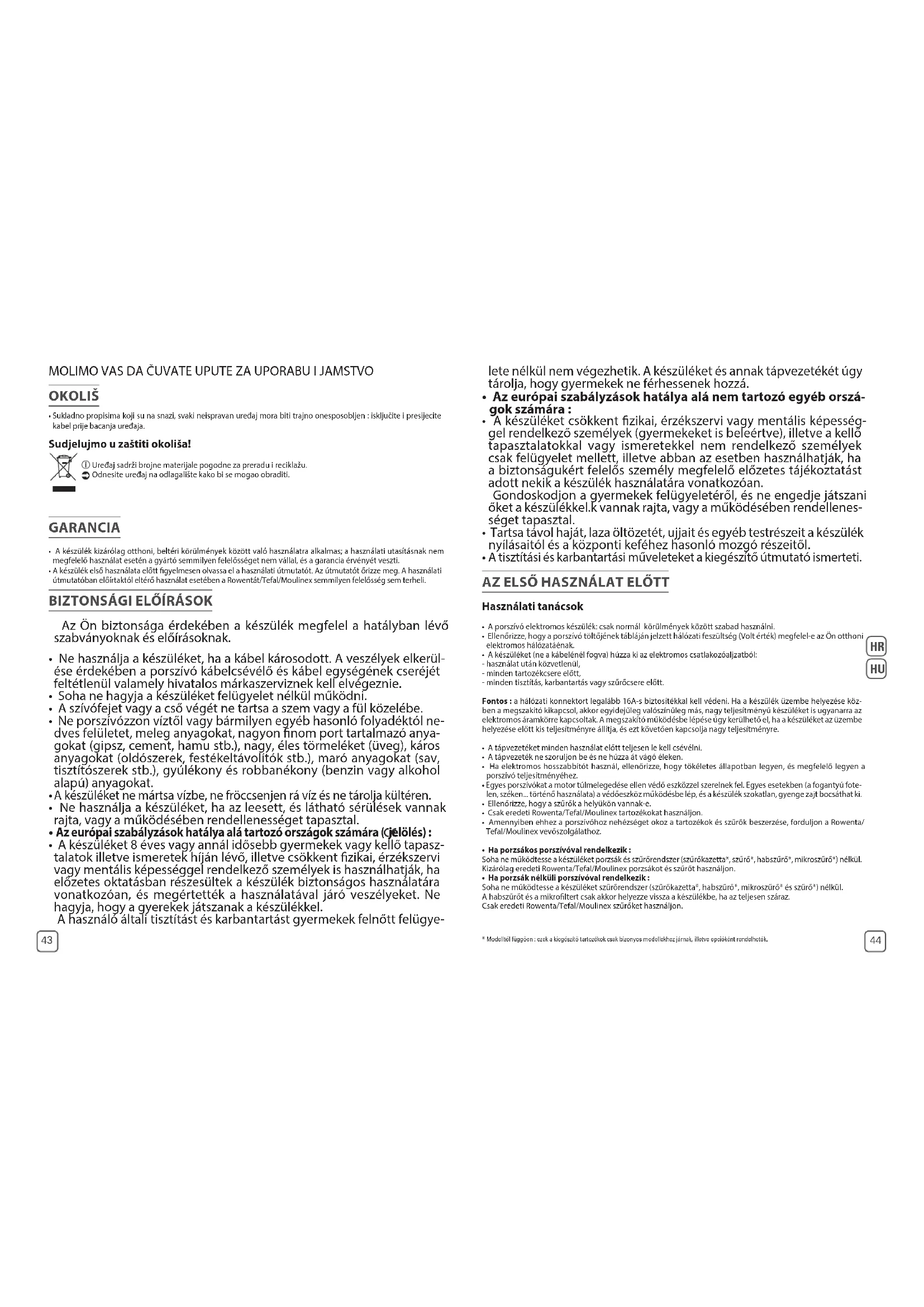 - Egyes porszívókat a motor túlmelegedése ellen védő eszközzel szerelnek fel. Egyes esetekben (a fogantyú fote- len, széken... történő használata) a védőeszköz működésbe lép, és a készülék szokatlan, gyenge zajt bocsáthat ki. • Ellenőrizze, hogy a szűrők a helyükön vannak-e. • Csak eredeti Rowenta/Tefal/Moulinex tartozékokat használjon. • Amennyiben ehhez a porszívóhoz nehézséget okoz a tartozékok és szűrők beszerzése, forduljon a Rowenta/Tefal/Moulinex vevőszolgálathoz. • Ha porzsákos porszívóval rendelkezik : Soha ne működtesse a készüléket porzsák és szűrőrendszer (szűrőkazetta*, szűrő*, habszűrő*, mikroszűrő*) nélkül.Kizárólag eredeti Rowenta/Tefal/Moulinex porzsákot és szűrőt használjon. • Ha porzsák nélküli porszívóval rendelkezik :Soha ne működtesse a készüléket szűrőrendszer (szűrőkazetta*, habszűrő*, mikroszűrő* és szűrő*) nélkül.A habszűrőt és a mikroltert csak akkor helyezze vissza a készülékbe, ha az teljesen száraz.Csak eredeti Rowenta/Tefal/Moulinex szűrőket használjon. GARANCIA