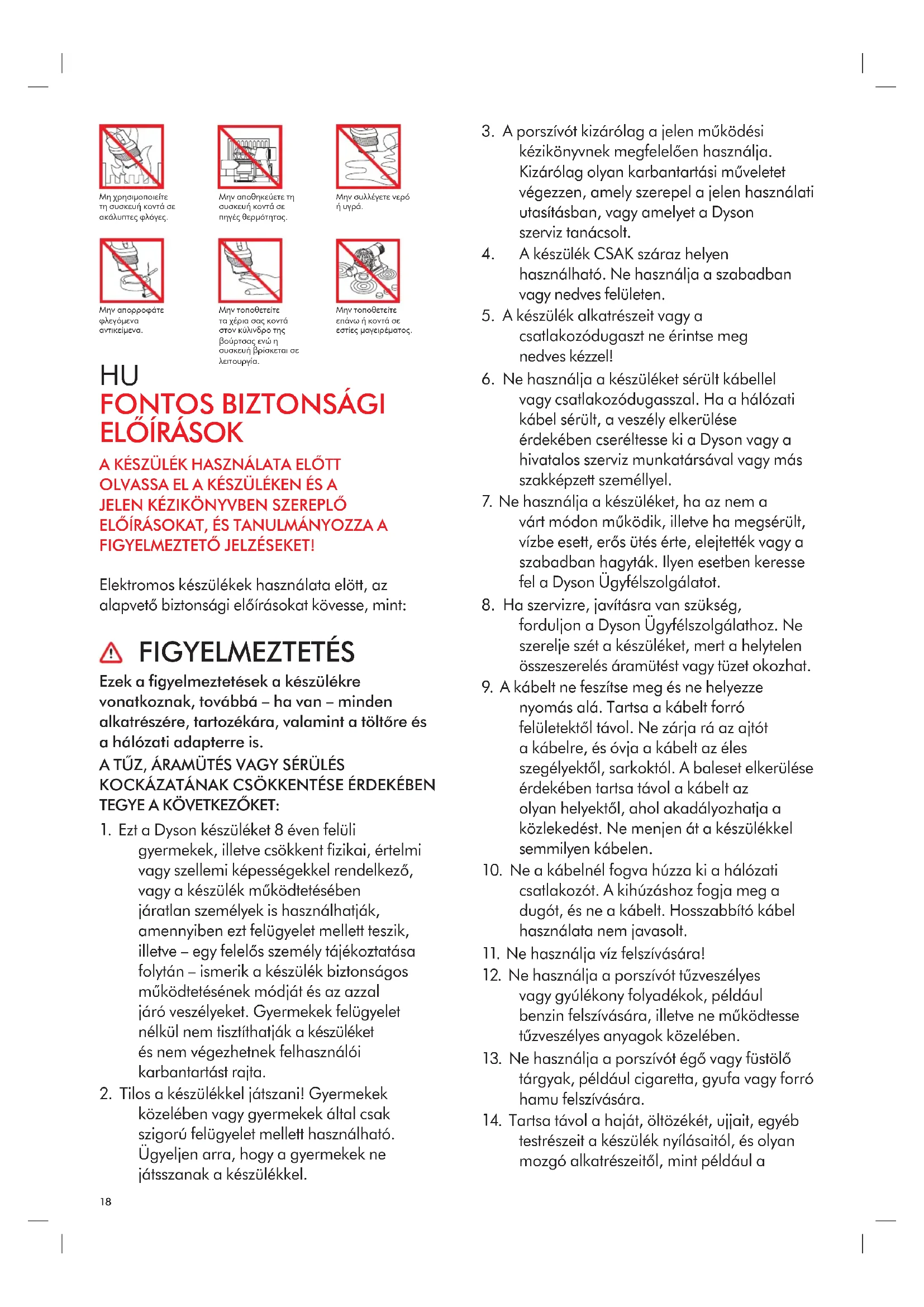 - Baleset következtében történt meghibásodások, gondatlan vagy nem rendeltetésszerű, a Dyson működtetési kézikönyvében leírtakat figyelembe nem vevő vagy azoknak ellentmondó használat miatt bekövetkezett meghibásodások.