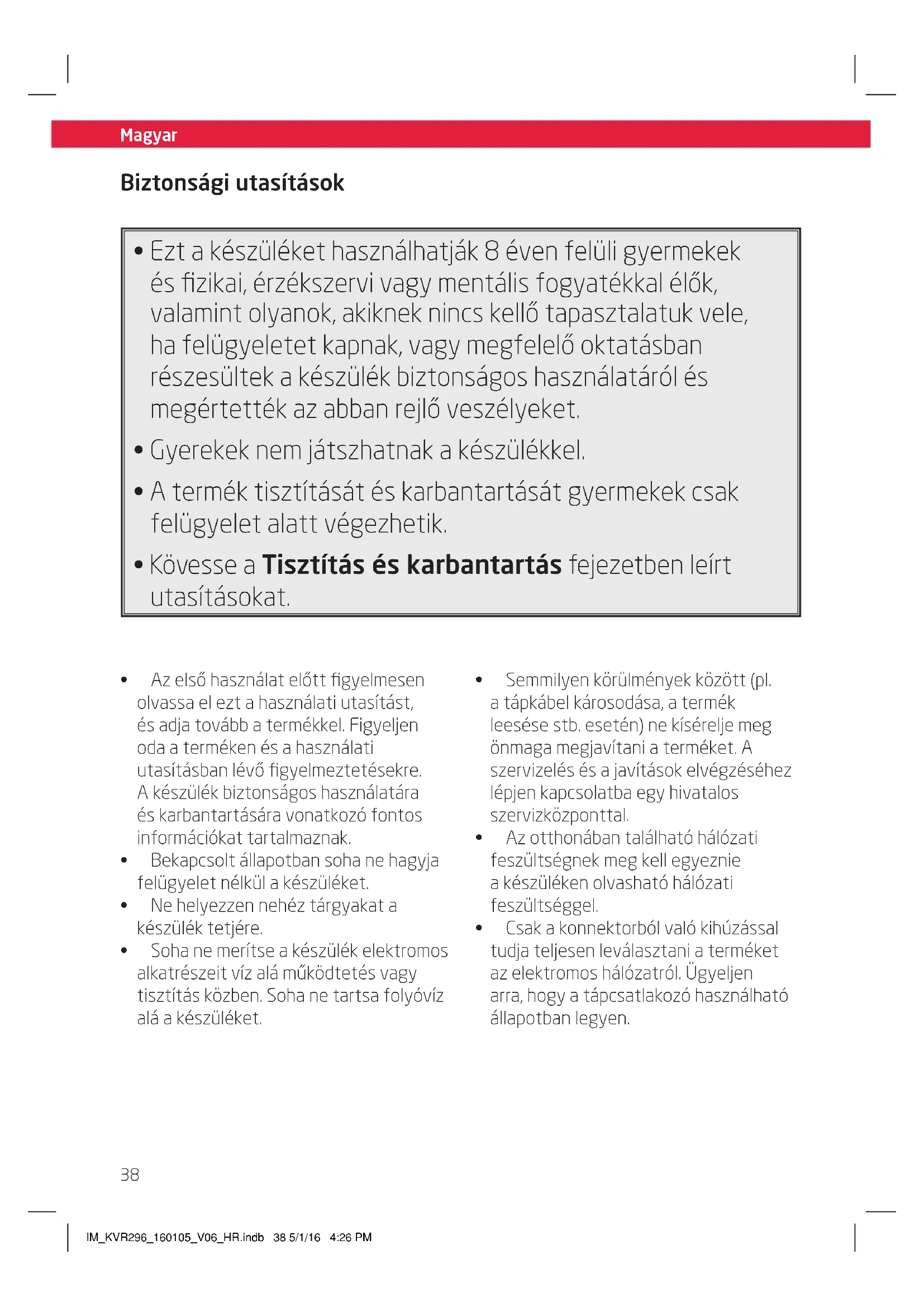 - Csak a konnektorból való kihúzással tudja teljesen leválasztani a terméket az elektromos hálózatról. Ügyeljen arra, hogy a tápcsatlakozó használható állapotban legyen. IM_KVR296_160105_V06_HR.indb 38 5/1/16 4:26 PMMagyar