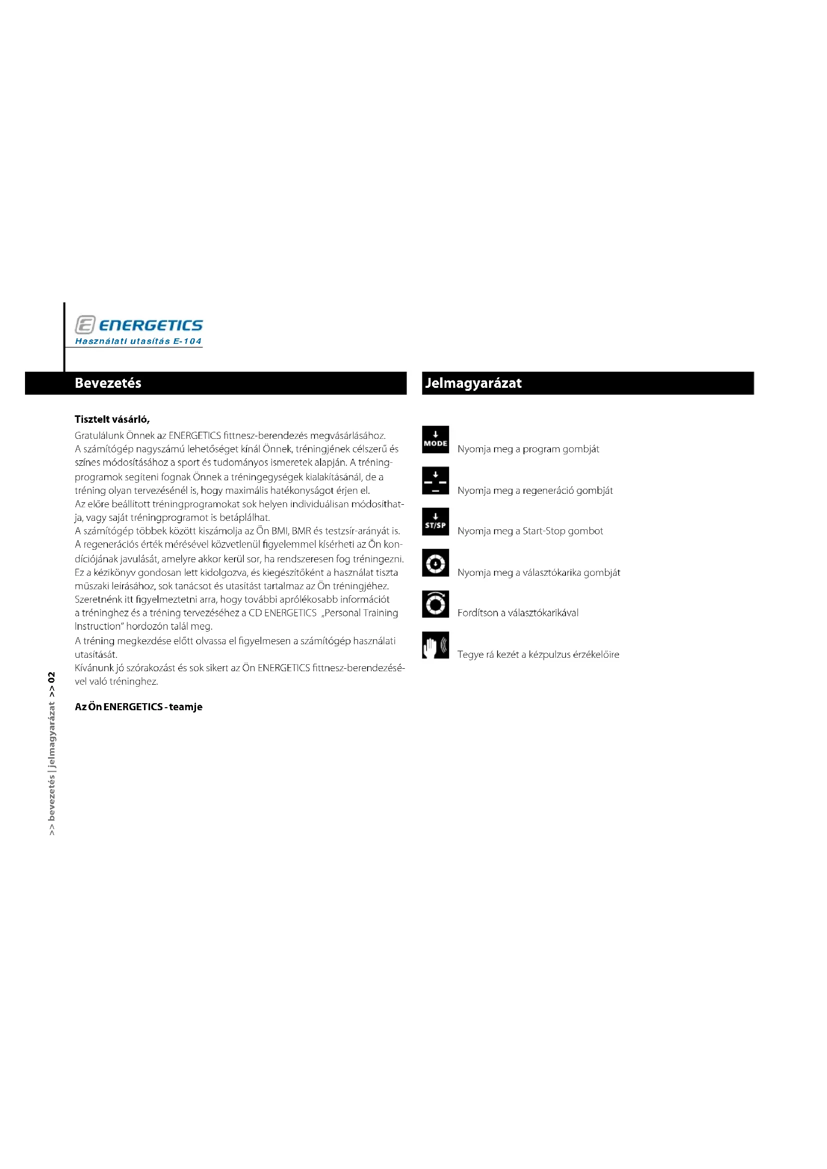 - Baterie v hrudním pásu je příliš slabá nebo je prázdná. Počítač se zhroutil Zřídka, převážně změnou napětí nebo statickými výboji, může docházet ke zhroucení počítače. E-204 se v běžně znovu spouští sám. Pokud by se počítač znovu sám nespustil, proveďte restart. K tomu vytáhněte síťovou zástrčku, několik vteřin počkejte a zástrčku znovu zapojte. Péče Dbejte na to, aby do pouzdra počítače nepronikla žádná kapalina. Počítač čistěte vlhkým hadříkem. Nepoužívejte abrazivní čisticí prostředky. Údržba Počítač nevyžaduje zvláštní údržbu. Pravidelně kontrolujte pevné usazení šroubů a spojů. Vadné díly okamžitě vyměňte. Kontaktujte prodejce ENERGETICS.HU Tartalom Bevezetés ...............................................................02 Jelmagyarázat ...........................................................02 Display és annak mutatói ..........................................03 Tok ................................................................03 Szerelés és elindítás ......................................................04 A számítógép csatlakoztatása ......................................04 A számítógép bekapcsolása .......................................04 Start, kontrol, jelzőhang ...........................................04 Nyugalmi rendszer ................................................04 Gyorsindítás . . . . . . . . . . . . . . . . . . . . . . . . . . . . . . . . . . . . . . . . . . . . . . . . . . . . . . . . . . . . . 05 Alapértékek és alapbeállítás ..............................................06 Tréningprogramok – funkció és beállítás .................................07 Mi az a tréningprogram ...........................................07 Individuális beállítás/a tréning paraméterei ........................07 A tréningprogramok használata ...................................10 Általános információk a programokhoz ............................16 A programok kiválasztása és beállítása ...................................17 Individuális programok ............................................17 Kézi program (P 1) ..........................................17 Használói program (P 13) ....................................19 Előre beállított programok .........................................21 Forduló (P 2) ................................................22 Átjáró (P 3) ..................................................22 Domb (P 4) .................................................23 Hegy (P 5) ...................................................23 Szoros (P 6) .................................................23 Intervallum (P 7) ............................................23 Programok a szívfrekvencia ellenőrzésével .........................24 A szívfrekvencia individuális ellenőrzése (P 9) ................24 A szívfrekvencia ellenőrzése (P 10 – 12) ......................26 BMI-BMR-testzsír mérése (P 8) .....................................28 Regeneráció programja ...........................................31 Tréningszünet/megszakítás és Reset ...............................32 Biztonság .........................................................32 Gyakori kérdések ........................................................33 Szerviz ...................................................................34 Hiba keresése .....................................................34 Gondoskodás .....................................................34 Karbantartás ......................................................34 Használati utasítás E-204 >> tartalom >> 01Használati utasítás E-104 >> bevezetés | jelmagyarázat >> 02 Jelmagyarázat Nyomja meg a program gombját Nyomja meg a regeneráció gombját Nyomja meg a Start-Stop gombot Nyomja meg a választókarika gombját Fordítson a választókarikával Tegye rá kezét a kézpulzus érzékelőire Bevezetés Tisztelt vásárló, Gratulálunk Önnek az ENERGETICS fittnesz-berendezés megvásárlásához. A számítógép nagyszámú lehetőséget kínál Önnek, tréningjének célszerű és színes módosításához a sport és tudományos ismeretek alapján. A tréning- programok segíteni fognak Önnek a tréningegységek kialakításánál, de a tréning olyan tervezésénél is, hogy maximális hatékonyságot érjen el. Az előre beállított tréningprogramokat sok helyen individuálisan módosíthat- ja, vagy saját tréningprogramot is betáplálhat. A számítógép többek között kiszámolja az Ön BMI, BMR és testzsír-arányát is. A regenerációs érték mérésével közvetlenül figyelemmel kísérheti az Ön kon- díciójának javulását, amelyre akkor kerül sor, ha rendszeresen fog tréningezni. Ez a kézikönyv gondosan lett kidolgozva, és kiegészítőként a használat tiszta műszaki leírásához, sok tanácsot és utasítást tartalmaz az Ön tréningjéhez. Szeretnénk itt figyelmeztetni arra, hogy további aprólékosabb információt a tréninghez és a tréning tervezéséhez a CD ENERGETICS „Personal Training Instruction“ hordozón talál meg. A tréning megkezdése előtt olvassa el figyelmesen a számítógép használati utasítását. Kívánunk jó szórakozást és sok sikert az Ön ENERGETICS fittnesz-berendezésé- vel való tréninghez. Az Ön ENERGETICS - teamjeHU >> jelmagyarázat >> 03 Display és annak mutatói (D1) START – indul a program (D2) STOP – a program megszakad vagy térjen át a választásra (D3) PROGRAM – választott program (D4) LEVEL– megterhelés beállított szintje (D5) Nem – nő (D6) Nem – férfi (D7) Időoszlopok/ellenállások oszlopai – 10 fázisra osztott tréningidő, a tréning idejének aránya szerint (D8) ODO– a megtett kilométerek összeg (D9) DIST – tréningprogramban megtett kilométerek száma (D10) SPEED – sebesség (kilométer/óra) (D11) RPM – taposási fre