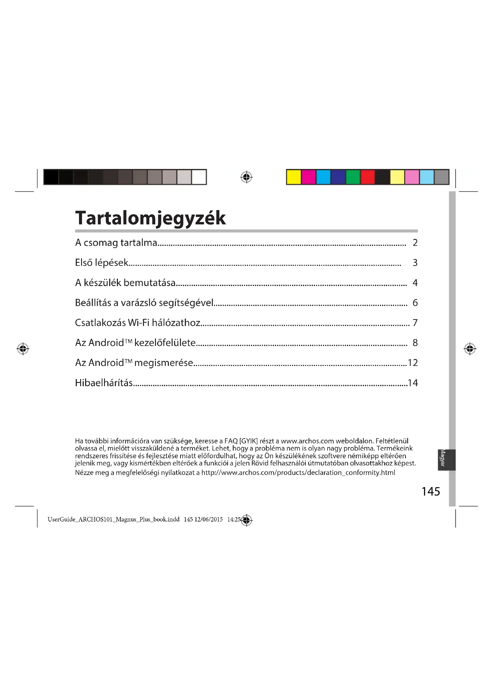 Garancia USB-kábel Töltő Rövid felhasználói útmutató Jótállási, jogi és biztonsági információkat tartalmazó füzet A csomag tartalma ARCHOS 101 Magnus Plus UserGuide_ARCHOS101_Magnus_Plus_book.indd 146 12/06/2015 14:25:54147 Magyar