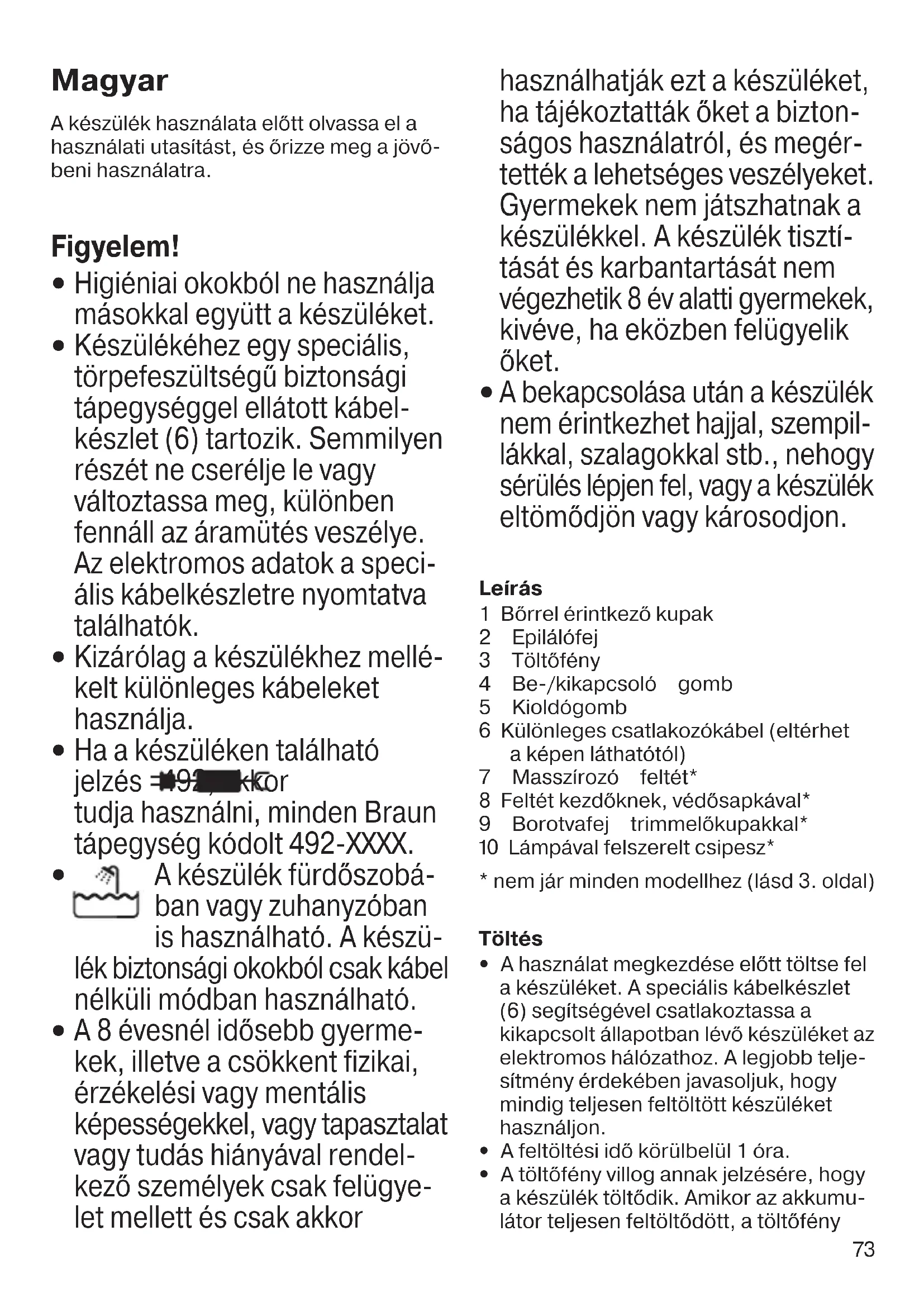 A készülék fürdőszobá- ban vagy zuhanyzóban is használható. A készü- lék biztonsági okokból csak kábel nélküli módban használható.