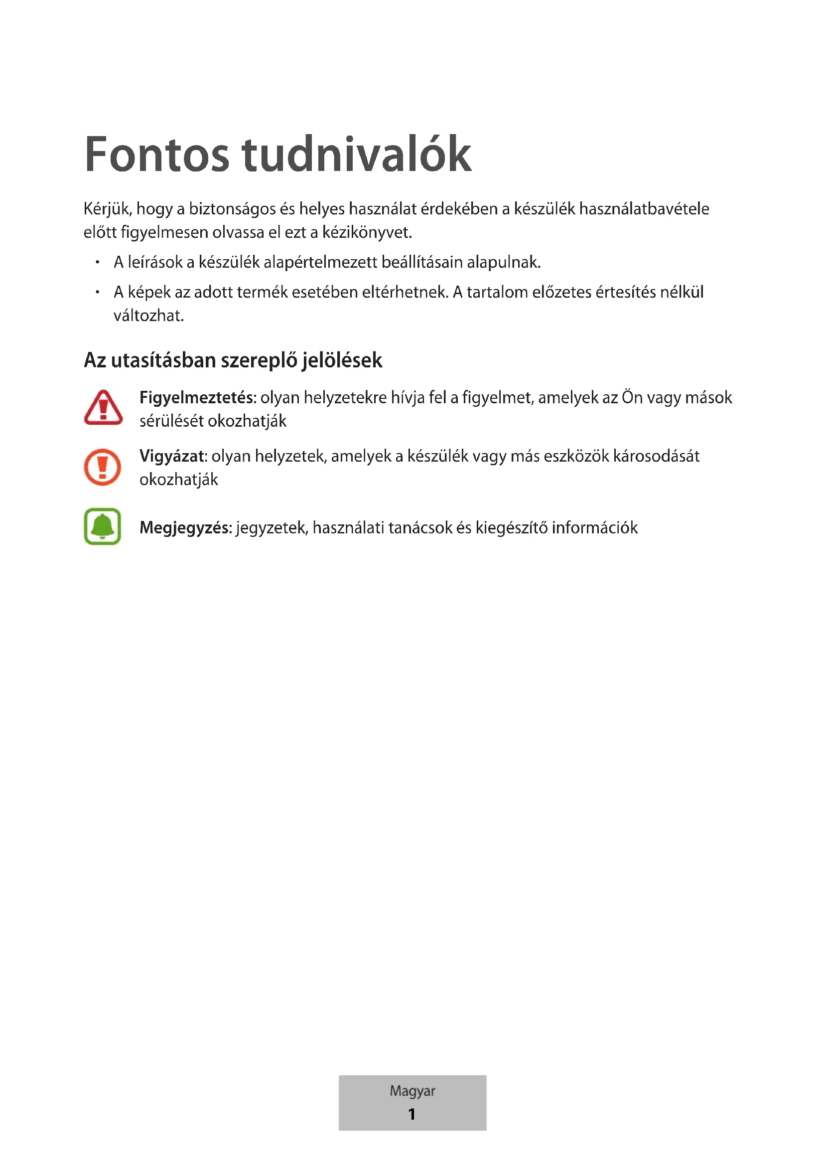 Fontos tudnivalók Kérjük, hogy a biztonságos és helyes használat érdekében a készülék használatbavétele előtt figyelmesen olvassa el ezt a kézikönyvet.