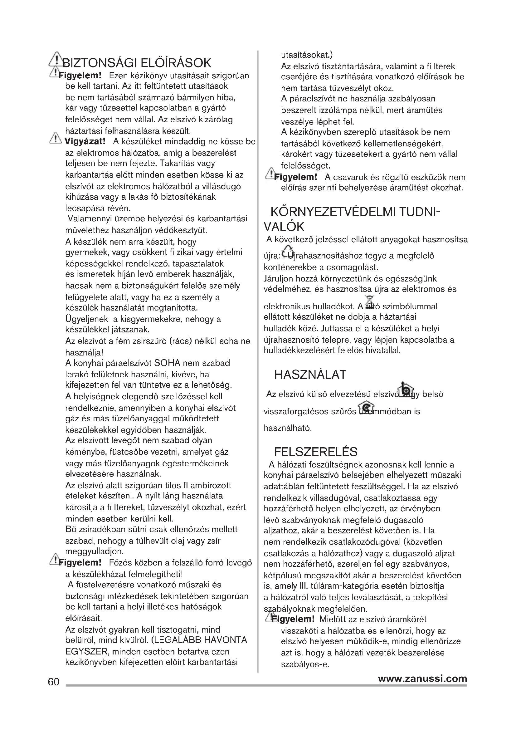 VALÓK A következő jelzéssel ellátott anyagokat hasznosítsa újra: . Újrahasznosításhoz tegye a megfelelő konténerekbe a csomagolást. Járuljon hozzá környezetünk és egészségünk védelméhez, és hasznosítsa újra az elektromos és elektronikus hulladékot. A tiltó szimbólummal ellátott készüléket ne dobja a háztartási hulladék közé. Juttassa el a készüléket a helyi újrahasznosító telepre, vagy lépjen kapcsolatba a hulladékkezelésért felelős hivatallal. HASZNÁLAT Az elszívó külső elvezetésű elszívó vagy belső visszaforgatésos szűrős üzemmódban is használható. FELSZERELÉS A hálózati feszültségnek azonosnak kell lennie a konyhai páraelszívó belsejében elhelyezett műszaki adattáblán feltüntetett feszültséggel. Ha az elszívó rendelkezik villásdugóval, csatlakoztassa egy hozzáférhető helyen elhelyezett, az érvényben lévő szabványoknak megfelelő dugaszoló aljzathoz, akár a beszerelést követően is. Ha nem rendelkezik csatlakozódugóval (közvetlen csatlakozás a hálózathoz) vagy a dugaszoló aljzat nem hozzáférhető, szereljen fel egy szabványos, kétpólusú megszakítót akár a beszerelést követően is, amely III. túláram-kategória esetén biztosítja a hálózatról való teljes leválasztását, a telepítési szabályoknak megfelelően. Figyelem! Mielőtt az elszívó áramkörét visszaköti a hálózatba és ellenőrzi, hogy az elszívó helyesen működik-e, mindig ellenőrizze azt is, hogy a hálózati vezeték beszerelése szabályos-e.61 www.zanussi.com A főzőkészülék felülete és a konyhai szagelszívó legalsó része közötti minimális távolság nem lehet kisebb, mint 43cm elektromos főzőlap, és 65cm gáz vagy vegyes tüzelésű főzőlap esetén. Ha a gázfőzőlap beszerelési utasításában ennél nagyobb távolság szerepel, azt kellfi gyelembe venni. KARBANTARTÁS Figyelem! Takarítás vagy karbantartás előtt minden esetben kösse ki az elszívót az elektromos hálózatból a villásdugó kihúzása vagy a lakás fő biztosítékának lecsapása révén. Az elszívót gyakran kell tisztítani, mind belülről, mind kívülről (legalább olyan gyakran, mint a zsírszűrő fi lterek tisztítását). A tisztításhoz használjon semleges folyékony mosószerrel átitatott nedves ruhát. Kerülje a súrolószert tartalmazó mosószerek használatát. NE HASZNÁLJON ALKOHOLT! Figyelem! Az elszívó tisztán tartására, valamint a fi lterek cseréjére vonatkozó előírások be nem tartása tűzveszélyt okoz. Ezért felhívjuk fi gyelmét, hogy tartsa be az utasításokat. A helytelen karbantartás, vagy a fent említett utasítások be nem tartása miatt a motorban esetleg bekövetkező károk vagy tűzesetek miatt semmiféle felelősséget nem vállalunk. Zsírszűrő fi lter - Havonta egyszer nem agresszív tisztítószerrel, kézzel vagy mosogatógépben, alacsony hőfokon és rövid ciklussal el kell mosogatni. Mosogatógépben történő mosogatás a zsírszűrő elszíneződését okozhatja, de ez nem változtat hatékonyságán. NEM Mosható aktív szénfi lter. A szénfi lter telítődése többé vagy kevésbé hosszú idő alatt történik meg, a tűzhely típusától és a zsírszűrő tisztogatásának rendszerességétől függően. Mind- enképpen cserélni kell a betétet legalább négy- havonként. NEM lehet kimosni vagy regenerálni Clack!