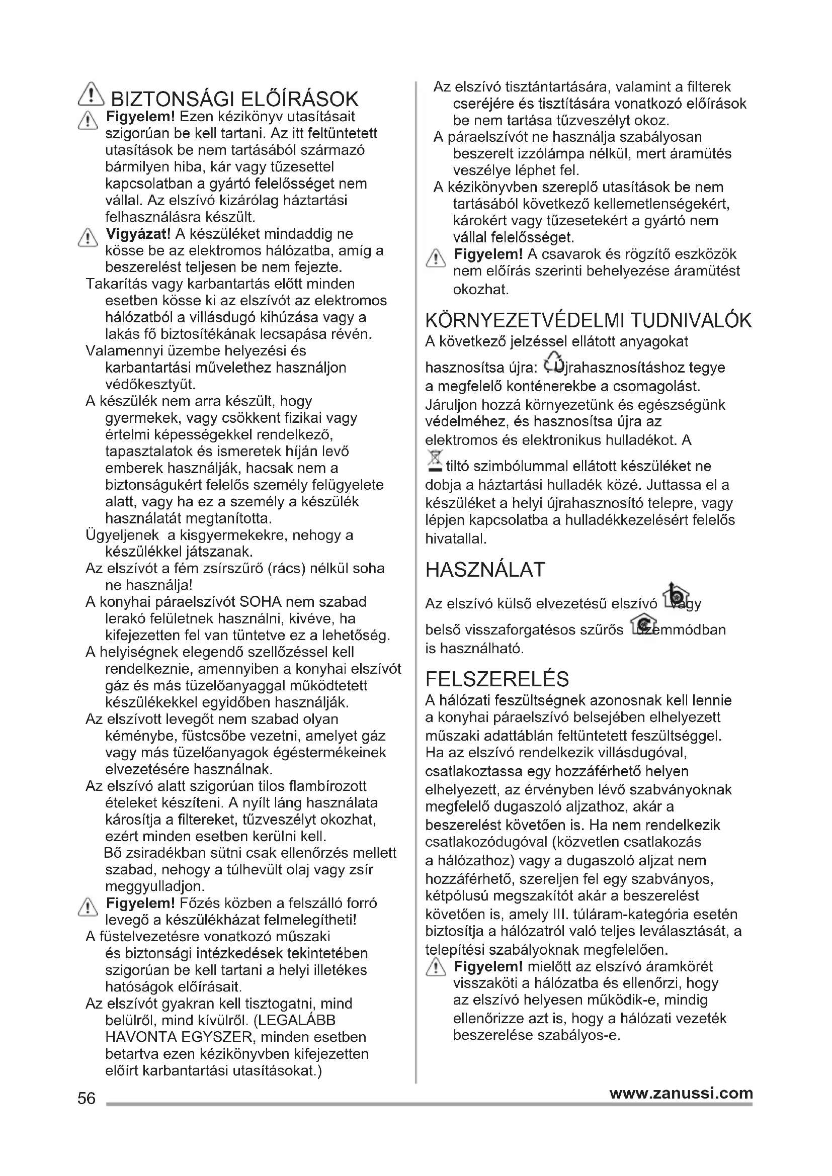 A következő jelzéssel ellátott anyagokat hasznosítsa újra: . Újrahasznosításhoz tegye a megfelelő konténerekbe a csomagolást. Járuljon hozzá környezetünk és egészségünk védelméhez, és hasznosítsa újra az elektromos és elektronikus hulladékot. A tiltó szimbólummal ellátott készüléket ne dobja a háztartási hulladék közé. Juttassa el a készüléket a helyi újrahasznosító telepre, vagy lépjen kapcsolatba a hulladékkezelésért felelős hivatallal. HASZNÁLAT Az elszívó külső elvezetésű elszívó vagy belső visszaforgatésos szűrős üzemmódban is használható. FELSZERELÉS A hálózati feszültségnek azonosnak kell lennie a konyhai páraelszívó belsejében elhelyezett műszaki adattáblán feltüntetett feszültséggel. Ha az elszívó rendelkezik villásdugóval, csatlakoztassa egy hozzáférhető helyen elhelyezett, az érvényben lévő szabványoknak megfelelő dugaszoló aljzathoz, akár a beszerelést követően is. Ha nem rendelkezik csatlakozódugóval (közvetlen csatlakozás a hálózathoz) vagy a dugaszoló aljzat nem hozzáférhető, szereljen fel egy szabványos, kétpólusú megszakítót akár a beszerelést követően is, amely III. túláram-kategória esetén biztosítja a hálózatról való teljes leválasztását, a telepítési szabályoknak megfelelően. Figyelem! mielőtt az elszívó áramkörét visszaköti a hálózatba és ellenőrzi, hogy az elszívó helyesen működik-e, mindig ellenőrizze azt is, hogy a hálózati vezeték beszerelése szabályos-e.57 www.zanussi.com A főzőkészülék felülete és a konyhai szagelszívó legalsó része közötti minimális távolság nem lehet kisebb, mint 50cm elektromos főzőlap, és 65cm gáz vagy vegyes tüzelésű főzőlap esetén. Ha a gázfőzőlap beszerelési utasításában ennél nagyobb távolság szerepel, azt kellfi gyelembe venni. KARBANTARTÁS Figyelem! Takarítás vagy karbantartás előtt minden esetben kösse ki az elszívót az elektromos hálózatból a villásdugó kihúzása vagy a lakás fő biztosítékának lecsapása révén. Az elszívót gyakran kell tisztítani, mind belülről, mind kívülről (legalább olyan gyakran, mint a zsírszűrő fi lterek tisztítását). A tisztításhoz használjon semleges folyékony mosószerrel átitatott nedves ruhát. Kerülje a súrolószert tartalmazó mosószerek használatát. NE HASZNÁLJON ALKOHOLT! Figyelem! Az elszívó tisztán tartására, valamint a filterek cseréjére vonatkozó előírások be nem tartása tűzveszélyt okoz. Ezért felhívjuk figyelmét, hogy tartsa be az utasításokat. A helytelen karbantartás, vagy a fent említett utasítások be nem tartása miatt a motorban esetleg bekövetkező károk vagy tűzesetek miatt semmiféle felelősséget nem vállalunk. Zsírszűrő fi lter - Havonta egyszer nem agresszív tisztítószerrel, kézzel vagy mosogatógépben, alacsony hőfokon és rövid ciklussal el kell mosogatni. Mosogatógépben történő mosogatás a zsírszűrő elszíneződését okozhatja, de ez nem változtat hatékonyságán. Type 20 LONG LIFE - Mosható aktív szénfi lter. A szénfi ltert kéthavonta lehet elmosni meleg vízben és megfelelő mosószerrel, vagy mosogatógépben 65 °C-on (mosogatógépben történő mosás esetén teljes mosogatási ciklust végezzen, edények nélkül). A felesleges vizet a fi lter megrongálása nélkül távolítsa el, majd vegye ki a műanyag keret belsejében található matracszerű betétet és végleges szárítás céljából 10 percre tegye a sütőbe 100 °C-on. A matracszerű betétet 3 évenként, valamint károsodása esetén ki kell cserélni. Type 15 - NEM Mosható aktív szénfi lter. A szénfi lter telítődése többé vagy kevésbé hosszú idő alatt történik meg, a tűzhely típusától és a zsírszűrő tisztogatásának rendszerességétől függően. Mindenképpen cserélni kell a betétet legalább négyhavonként. NEM lehet kimosni vagy regenerálni (1*) (2*) (3**) (4**) (*) Type 20 (**) Type 15 - Type 2058 www.zanussi.com KEZELŐSZERVEK Az elszívó szíváserősség-szabályozóval és főzőlapvilágítás-kapcsolóval ellátott kezelőpanellel rendelkezik.