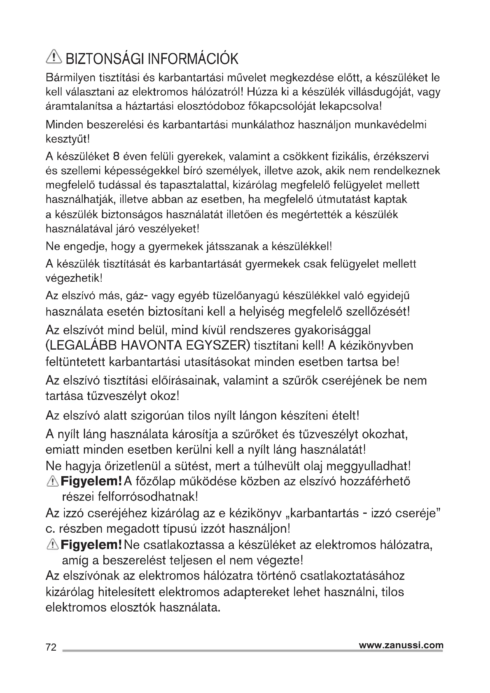 Bármilyen tisztítási és karbantartási művelet megkezdése előtt, a készüléket le kell választani az elektromos hálózatról! Húzza ki a készülék villásdugóját, vagy áramtalanítsa a háztartási elosztódoboz főkapcsolóját lekapcsolva! Minden beszerelési és karbantartási munkálathoz használjon munkavédelmi kesztyűt! A készüléket 8 éven felüli gyerekek, valamint a csökkent fizikális, érzékszervi és szellemi képességekkel bíró személyek, illetve azok, akik nem rendelkeznek megfelelő tudással és tapasztalattal, kizárólag megfelelő felügyelet mellett használhatják, illetve abban az esetben, ha megfelelő útmutatást kaptak a készülék biztonságos használatát illetően és megértették a készülék használatával járó veszélyeket! Ne engedje, hogy a gyermekek játsszanak a készülékkel! A készülék tisztítását és karbantartását gyermekek csak felügyelet mellett végezhetik! Az elszívó más, gáz- vagy egyéb tüzelőanyagú készülékkel való egyidejű használata esetén biztosítani kell a helyiség megfelelő szellőzését! Az elszívót mind belül, mind kívül rendszeres gyakorisággal (LEGALÁBB HAVONTA EGYSZER) tisztítani kell! A kézikönyvben feltüntetett karbantartási utasításokat minden esetben tartsa be! Az elszívó tisztítási előírásainak, valamint a szűrők cseréjének be nem tartása tűzveszélyt okoz! Az elszívó alatt szigorúan tilos nyílt lángon készíteni ételt! A nyílt láng használata károsítja a szűrőket és tűzveszélyt okozhat, emiatt minden esetben kerülni kell a nyílt láng használatát! Ne hagyja őrizetlenül a sütést, mert a túlhevült olaj meggyulladhat! Figyelem! A főzőlap működése közben az elszívó hozzáférhető részei felforrósodhatnak! Az izzó cseréjéhez kizárólag az e kézikönyv „karbantartás - izzó cseréje” c. részben megadott típusú izzót használjon! Figyelem! Ne csatlakoztassa a készüléket az elektromos hálózatra, amíg a beszerelést teljesen el nem végezte! Az elszívónak az elektromos hálózatra történő csatlakoztatásához kizárólag hitelesített elektromos adaptereket lehet használni, tilos elektromos elosztók használata.73 www.zanussi.com