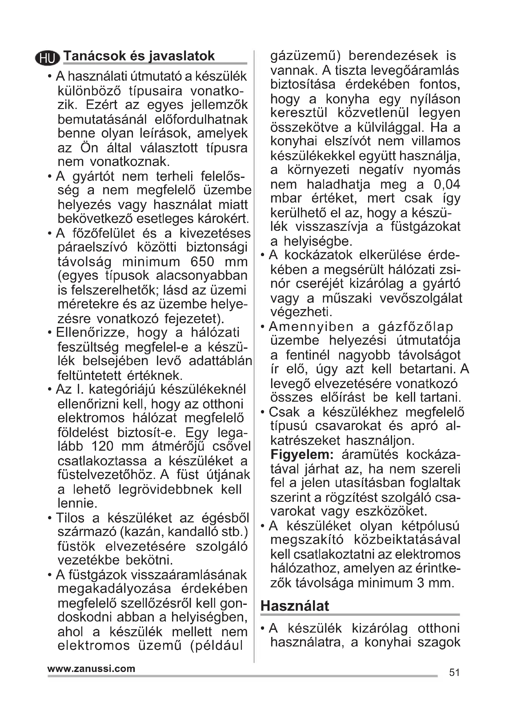 - A készülék kizárólag otthoni használatra, a konyhai szagok HU52 www.zanussi.com eltávolítására szolgál.