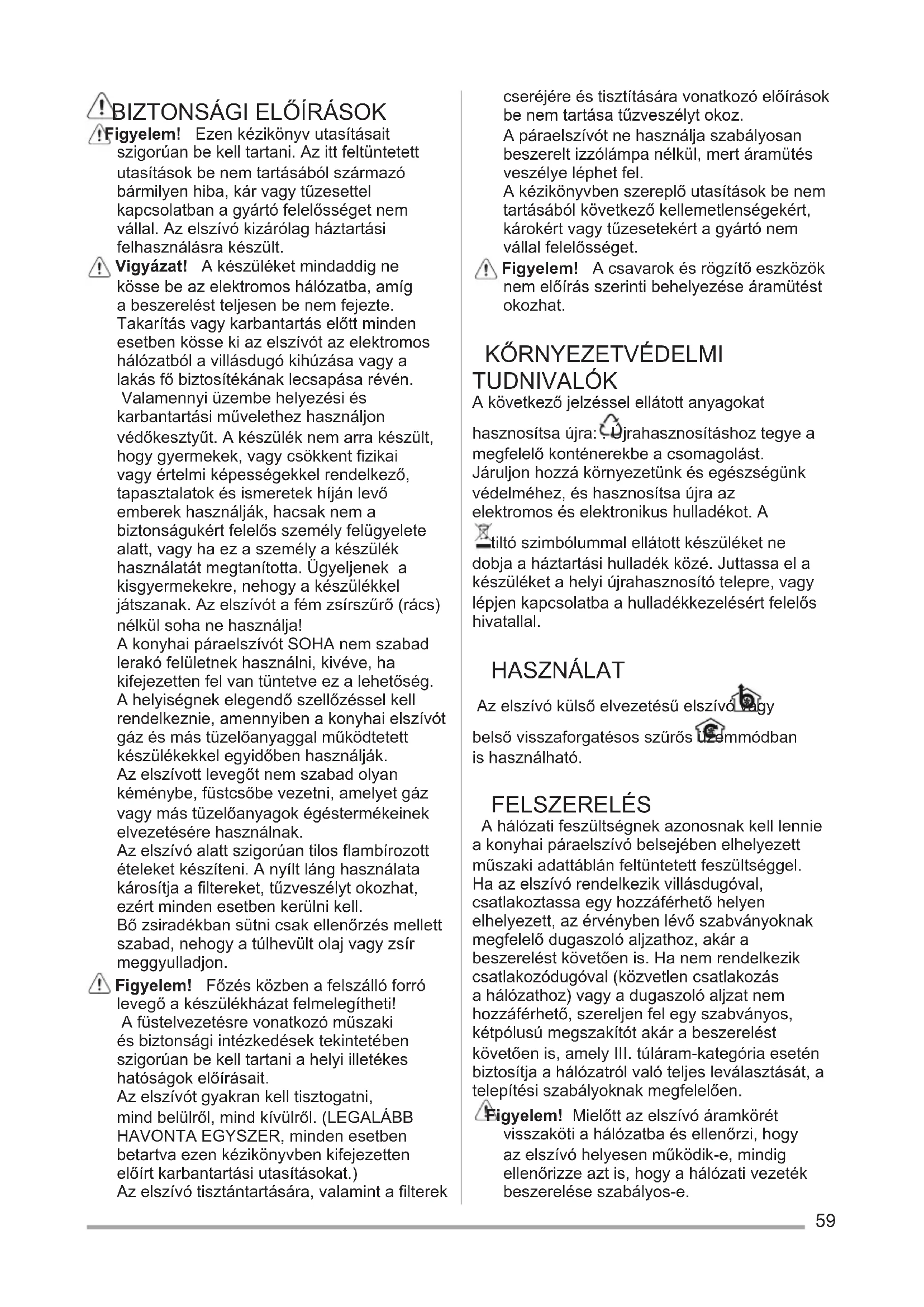 Figyelem! Ezen kézikönyv utasításait szigorúan be kell tartani. Az itt feltüntetett utasítások be nem tartásából származó bármilyen hiba, kár vagy tűzesettel kapcsolatban a gyártó felelősséget nem vállal. Az elszívó kizárólag háztartási felhasználásra készült. Vigyázat! A készüléket mindaddig ne kösse be az elektromos hálózatba, amíg a beszerelést teljesen be nem fejezte. Takarítás vagy karbantartás előtt minden esetben kösse ki az elszívót az elektromos hálózatból a villásdugó kihúzása vagy a lakás fő biztosítékának lecsapása révén. Valamennyi üzembe helyezési és karbantartási művelethez használjon védőkesztyűt. A készülék nem arra készült, hogy gyermekek, vagy csökkent fizikai vagy értelmi képességekkel rendelkező, tapasztalatok és ismeretek híján levő emberek használják, hacsak nem a biztonságukért felelős személy felügyelete alatt, vagy ha ez a személy a készülék használatát megtanította. Ügyeljenek a kisgyermekekre, nehogy a készülékkel játszanak. Az elszívót a fém zsírszűrő (rács) nélkül soha ne használja! A konyhai páraelszívót SOHA nem szabad lerakó felületnek használni, kivéve, ha kifejezetten fel van tüntetve ez a lehetőség. A helyiségnek elegendő szellőzéssel kell rendelkeznie, amennyiben a konyhai elszívót gáz és más tüzelőanyaggal működtetett készülékekkel egyidőben használják. Az elszívott levegőt nem szabad olyan kéménybe, füstcsőbe vezetni, amelyet gáz vagy más tüzelőanyagok égéstermékeinek elvezetésére használnak. Az elszívó alatt szigorúan tilos flambírozott ételeket készíteni. A nyílt láng használata károsítja a filtereket, tűzveszélyt okozhat, ezért minden esetben kerülni kell. Bő zsiradékban sütni csak ellenőrzés mellett szabad, nehogy a túlhevült olaj vagy zsír meggyulladjon. Figyelem! Főzés közben a felszálló forró levegő a készülékházat felmelegítheti! A füstelvezetésre vonatkozó műszaki és biztonsági intézkedések tekintetében szigorúan be kell tartani a helyi illetékes hatóságok előírásait. Az elszívót gyakran kell tisztogatni, mind belülről, mind kívülről. (LEGALÁBB HAVONTA EGYSZER, minden esetben betartva ezen kézikönyvben kifejezetten előírt karbantartási utasításokat.) Az elszívó tisztántartására, valamint a filterek cseréjére és tisztítására vonatkozó előírások be nem tartása tűzveszélyt okoz. A páraelszívót ne használja szabályosan beszerelt izzólámpa nélkül, mert áramütés veszélye léphet fel. A kézikönyvben szereplő utasítások be nem tartásából következő kellemetlenségekért, károkért vagy tűzesetekért a gyártó nem vállal felelősséget. Figyelem! A csavarok és rögzítő eszközök nem előírás szerinti behelyezése áramütést okozhat.