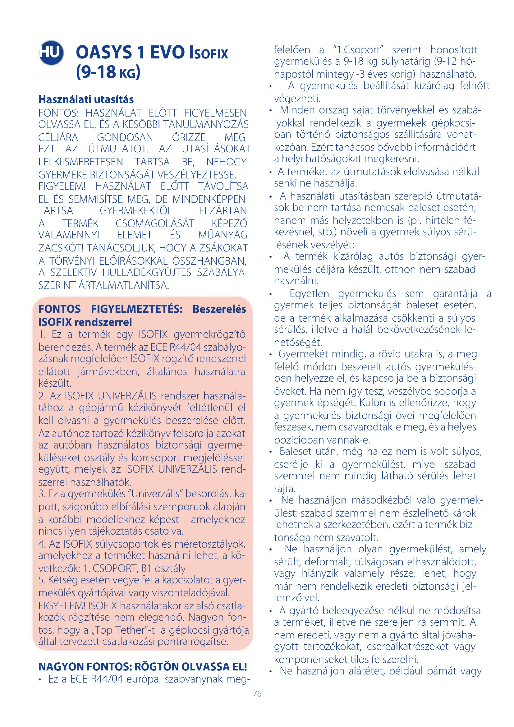 FIGYELEM! A termékre és az autósülésre vo- natkozó, következő korlátozásokat és haszná- lati feltételeket gondosan tartsa be: ellenkező esetben a biztonság nem garantált.