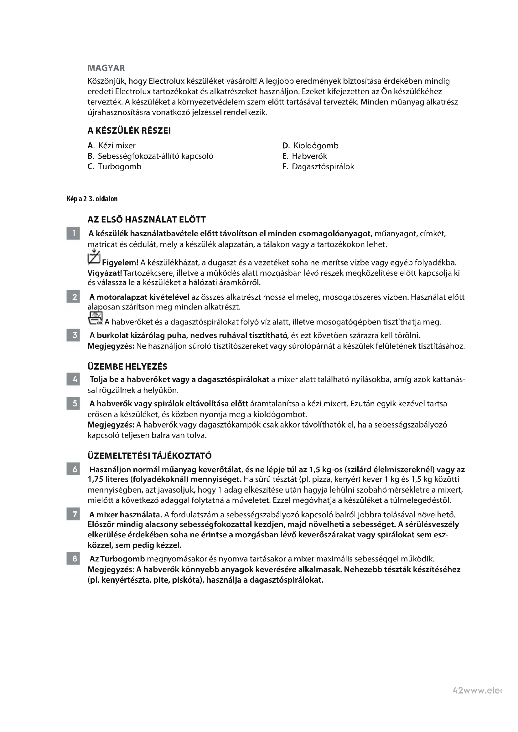 9 Kapcsolja ki a berendezést, húzza ki a dugót a konnektorból, és várjon, amíg a különböző eszközök teljesen le nem állnak. Figyelem! A készülékházat, a dugaszt és a vezetéket soha ne merítse vízbe vagy egyéb folyadékba. 10 A motoralapzat kivételével az összes alkatrészt mossa el meleg, mosogatószeres vízben. Használat előtt alaposan szárítson meg minden alkatrészt. A habverőket és a dagasztóspirálokat folyó víz alatt, illetve mosogatógépben tisztíthatja meg. 11 A burkolat kizárólag puha, nedves ruhával tisztítható, és ezt követően szárazra kell törölni. Megjegyzés: Ne használjon súroló tisztítószereket vagy súrolópárnát a készülék felületének tisztításához. Tárolás előtt húzza ki a hálózati dugaszt a hálózati aljzatból. Győződjön meg arról, hogy a készülék tiszta és teljesen megszáradt. Használja örömmel új Electrolux készülékét!