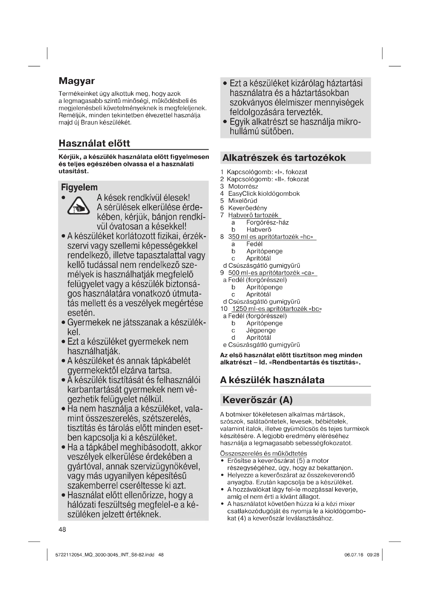 - A használatot követően húzza ki a kézi mixer csatlakozódugóját és nyomja le a kioldógombo- kat (4) a keverőszár leválasztásához. 5722112054_MQ_3000-3045_INT_S6-82.indd 485722112054_MQ_3000-3045_INT_S6-82.indd 48 06.07.16 09:2806.07.16 09:2849 Figyelem