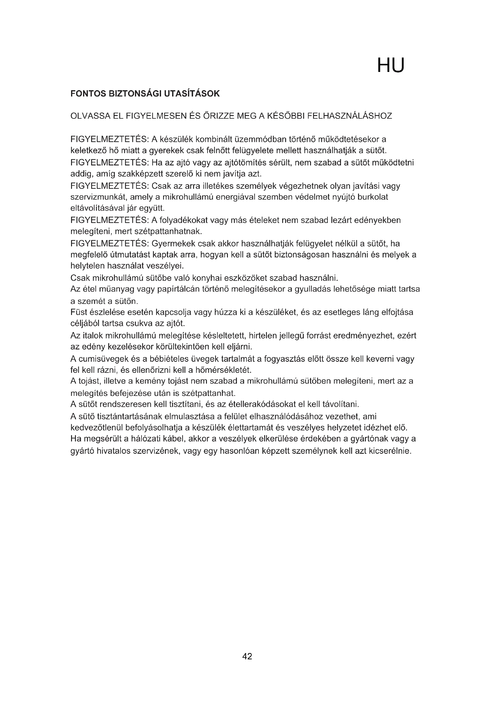 OLVASSA EL FIGYELMESEN ÉS RIZZE MEG A KÉSBBI FELHASZNÁLÁSHOZ FIGYELMEZTETÉS: A készülék kombinált üzemmódban történ mködtetésekor a keletkez h miatt a gyerekek csak felntt felügyelete mellett használhatják a sütt. FIGYELMEZTETÉS: Ha az ajtó vagy az ajtótömítés sérült, nem szabad a sütt mködtetni addig, amíg szakképzett szerel ki nem javítja azt. FIGYELMEZTETÉS: Csak az arra illetékes személyek végezhetnek olyan javítási vagy szervizmunkát, amely a mikrohullámú energiával szemben védelmet nyújtó burkolat eltávolításával jár együtt. FIGYELMEZTETÉS: A folyadékokat vagy más ételeket nem szabad lezárt edényekben melegíteni, mert szétpattanhatnak. FIGYELMEZTETÉS: Gyermekek csak akkor használhatják felügyelet nélkül a sütt, ha megfelel útmutatást kaptak arra, hogyan kell a sütt biztonságosan használni és melyek a helytelen használat veszélyei. Csak mikrohullámú sütbe való konyhai eszközöket szabad használni. Az étel manyag vagy papírtálcán történ melegítésekor a gyulladás lehetsége miatt tartsa a szemét a sütn. Füst észlelé se esetén kapcsolja vagy húzza ki a készüléket, és az esetleges láng elfojtása céljából tartsa csukva az ajtót. Az italok mikrohullámú melegítése késleltetett, hirtelen jelleg forrást eredményezhet, ezért az edény kezelésekor körültekinten kell eljárni. A cumisüvegek és a bébiételes üvegek tartalmát a fogyasztás eltt össze kell keverni vagy fel kell rázni, és ellenrizni kell a hmérsékletét. A tojást, illetve a kemény tojást nem szabad a mikrohullámú sütben melegíteni, mert az a melegítés befejezése után is szétpattanhat. A sütt rendszeresen kell tisztítani, és az étellerakódásokat el kell távolítani. A süt tisztántartásának elmulasztása a felület elhasználódásához vezethet, ami kedveztlenül befolyásolhatja a készülék élettartamát és veszélyes helyzetet idézhet el. Ha megsérült a hálózati kábel, akkor a veszélyek elkerülése érdekében a gyártónak vagy a gyártó hivatalos szervizének, vagy egy hasonlóan képzett személynek kell azt kicserélnie.
