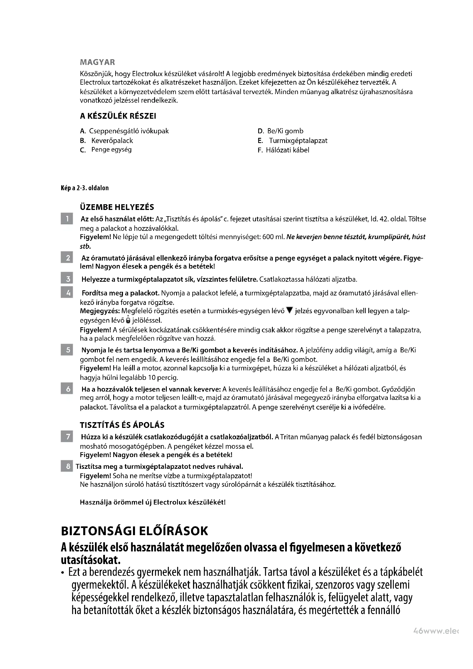 7 Húzza ki a készülék csatlakozódugóját a csatlakozóaljzatból. A Tritan műanyag palack és fedél biztonságosan mosható mosogatógépben. A pengéket kézzel mossa el. Figyelem! Nagyon élesek a pengék és a betétek! 8 Tisztítsa meg a turmixgéptalapzatot nedves ruhával. Figyelem! Soha ne merítse vízbe a turmixgéptalapzatot! Ne használjon súroló hatású tisztítószert vagy súrolópárnát a készülék tisztításához. Használja örömmel új Electrolux készülékét!