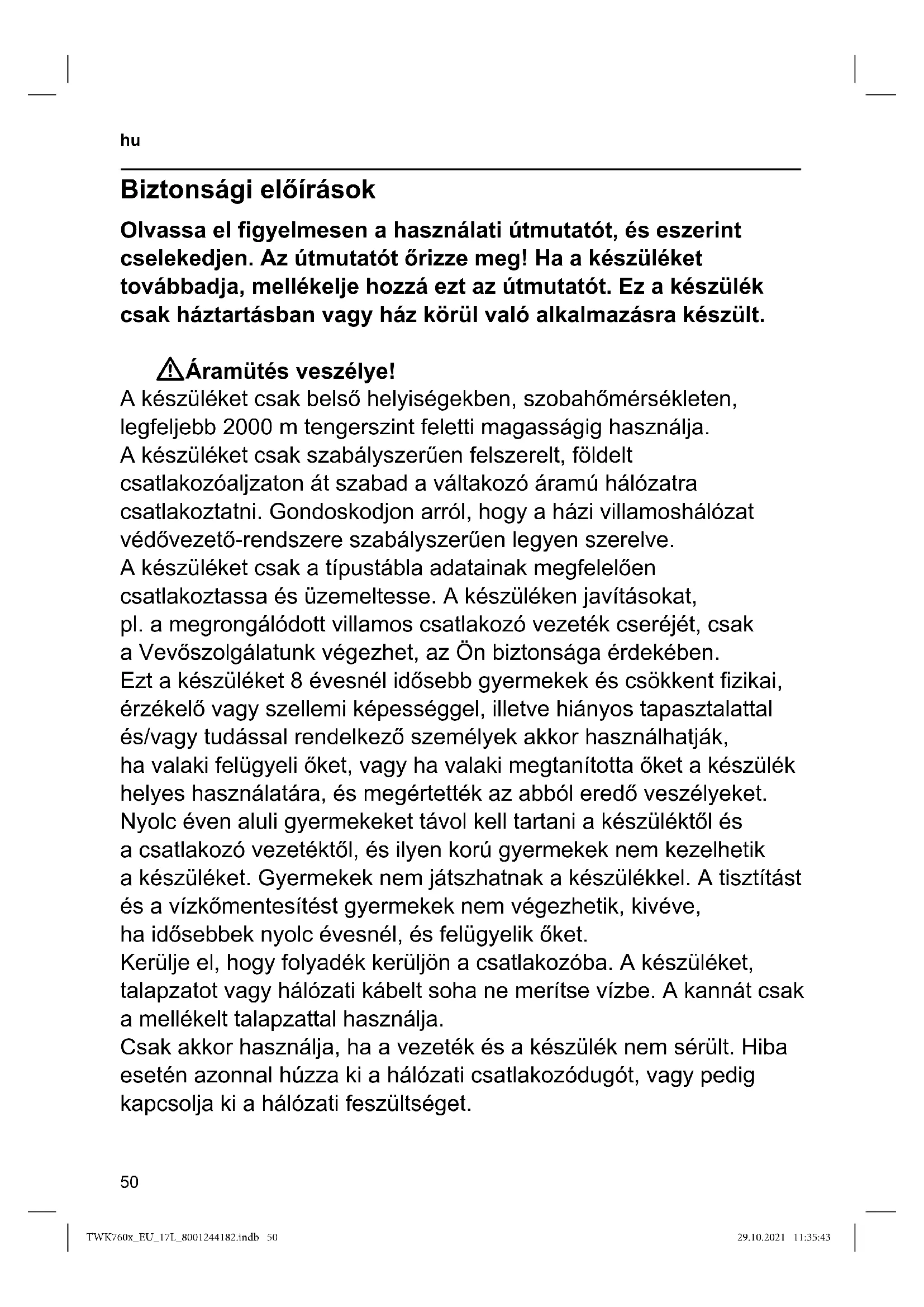 tym celu oraz w celu skorzystania z uprawnień z gwarancji prosimy o kontakt z infolinią: +48 42 271 5555 (opłata wg. stawek operatora). Zmiany zastrzeżone. TWK760x_EU_17L_8001244182.indb 49TWK760x_EU_17L_8001244182.indb 49 29.10.2021 11:35:4329.10.2021 11:35:43Biztonsági előírások Olvassa el gyelmesen a használati útmutatót, és eszerint cselekedjen. Az útmutatót őrizze meg! Ha a készüléket továbbadja, mellékelje hozzá ezt az útmutatót. Ez a készülék csak háztartásban vagy ház körül való alkalmazásra készült. WÁramütés veszélye! A készüléket csak belső helyiségekben, szobahőmérsékleten, legfeljebb 2000 m tengerszint feletti magasságig használja. A készüléket csak szabályszerűen felszerelt, földelt csatlakozóaljzaton át szabad a váltakozó áramú hálózatra csatlakoztatni. Gondoskodjon arról, hogy a házi villamoshálózat védővezető-rendszere szabályszerűen legyen szerelve. A készüléket csak a típustábla adatainak megfelelően csatlakoztassa és üzemeltesse. A készüléken javításokat, pl. a megrongálódott villamos csatlakozó vezeték cseréjét, csak a Vevőszolgálatunk végezhet, az Ön biztonsága érdekében. Ezt a készüléket 8 évesnél idősebb gyermekek és csökkent zikai, érzékelő vagy szellemi képességgel, illetve hiányos tapasztalattal és/vagy tudással rendelkező személyek akkor használhatják, ha valaki felügyeli őket, vagy ha valaki megtanította őket a készülék helyes használatára, és megértették az abból eredő veszélyeket. Nyolc éven aluli gyermekeket távol kell tartani a készüléktől és a csatlakozó vezetéktől, és ilyen korú gyermekek nem kezelhetik a készüléket. Gyermekek nem játszhatnak a készülékkel. A tisztítást és a vízkőmentesítést gyermekek nem végezhetik, kivéve, ha idősebbek nyolc évesnél, és felügyelik őket. Kerülje el, hogy folyadék kerüljön a csatlakozóba. A készüléket, talapzatot vagy hálózati kábelt soha ne merítse vízbe. A kannát csak a mellékelt talapzattal használja. Csak akkor használja, ha a vezeték és a készülék nem sérült. Hiba esetén azonnal húzza ki a hálózati csatlakozódugót, vagy pedig kapcsolja ki a hálózati feszültséget. WTűzveszély! A talapzatot vagy kannát ne állítsa forró felületekre, pl. főzőlapokra, vagy azok közelébe. Ügyeljen rá, hogy ne fröccsenjen ki zsír, a műanyag megsérülhet. WForrázásveszély! Használat közben a készülék felforrósodik. Ezért csak a fogantyút fogja meg, a fedelet pedig csak hideg állapotban nyissa ki. A készüléket csak a helyére bepattant fedéllel használja. Ha a készüléket a „max.” jelzést meghaladóan tölti meg, a kifröccsenő forróvíz veszélyhelyzetet okozhat. WMegégetés veszélye! Használat után a fűtőelem felülete még egy ideig forró lehet.