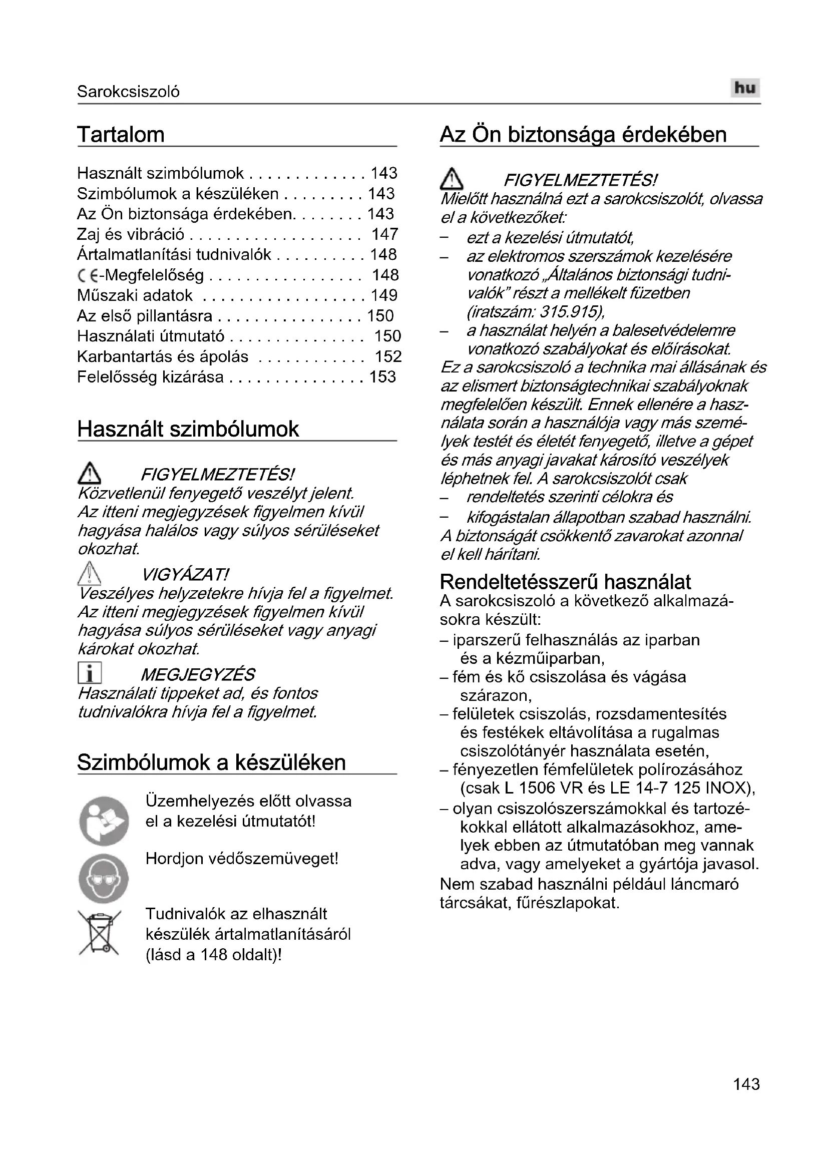 kifogástalan állapotban szabad használni. A biztonságát csökkentő zavarokat azonnal el kell hárítani. Rendeltetésszerű használat A sarokcsiszoló a következő alkalmazá- sokra készült: – iparszerű felhasználás az iparban és a kézműiparban, – fém és kő csiszolása és vágása szárazon, – felületek csiszolás, rozsdamentesítés és festékek eltávolítása a rugalmas csiszolótányér használata esetén, – fényezetlen fémfelületek polírozásához (csak L 1506 VR és LE 14-7 125 INOX), – olyan csiszolószerszámokkal és tartozé- kokkal ellátott alkalmazásokhoz, ame- lyek ebben az útmutatóban meg vannak adva, vagy amelyeket a gyártója javasol. Nem szabad használni például láncmaró tárcsákat, fűrészlapokat.Sarokcsiszoló