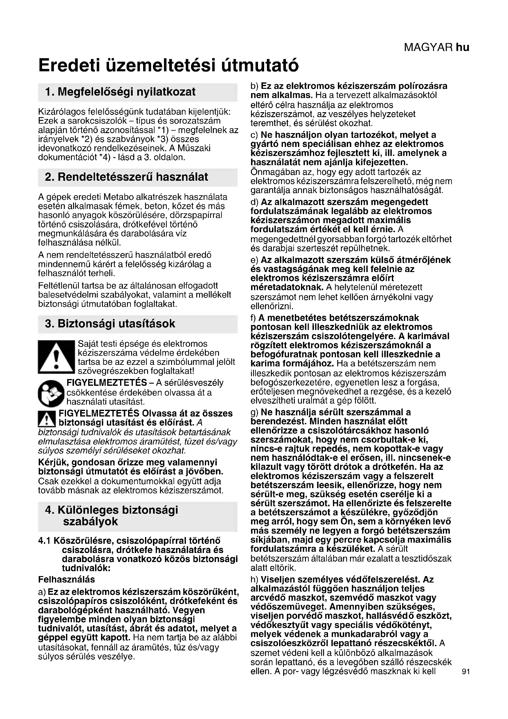 Eredeti üzemeltetési útmutató Kizárólagos felelősségünk tudatában kijelentjük: Ezek a sarokcsiszolók – típus és sorozatszám alapján történő azonosítással *1) – megfelelnek az irányelvek *2) és szabványok *3) összes idevonatkozó rendelkezéseinek. A Műszaki dokumentációt *4) - lásd a 3. oldalon. A gépek eredeti Metabo alkatrészek használata esetén alkalmasak fémek, beton, kőzet és más hasonló anyagok köszörülésére, dörzspapírral történő csiszolására, drótkefével történő megmunkálására és darabolására víz felhasználása nélkül. A nem rendeltetésszerű használatból eredő mindennemű kárért a felelősség kizárólag a felhasználót terheli. Feltétlenül tartsa be az általánosan elfogadott balesetvédelmi szabályokat, valamint a mellékelt biztonsági útmutatóban foglaltakat. Saját testi épsége és elektromos kéziszerszáma védelme érdekében tartsa be az ezzel a szimbólummal jelölt szövegrészekben foglaltakat! FIGYELMEZTETÉS – A sérülésveszély csökkentése érdekében olvassa át a használati utasítást. FIGYELMEZTETÉS Olvassa át az összes biztonsági utasítást és előírást. A biztonsági tudnivalók és utasítások betartásának elmulasztása elektromos áramütést, tüzet és/vagy súlyos személyi sérüléseket okozhat. Kérjük, gondosan őrizze meg valamennyi biztonsági útmutatót és előírást a jövőben. Csak ezekkel a dokumentumokkal együtt adja tovább másnak az elektromos kéziszerszámot.