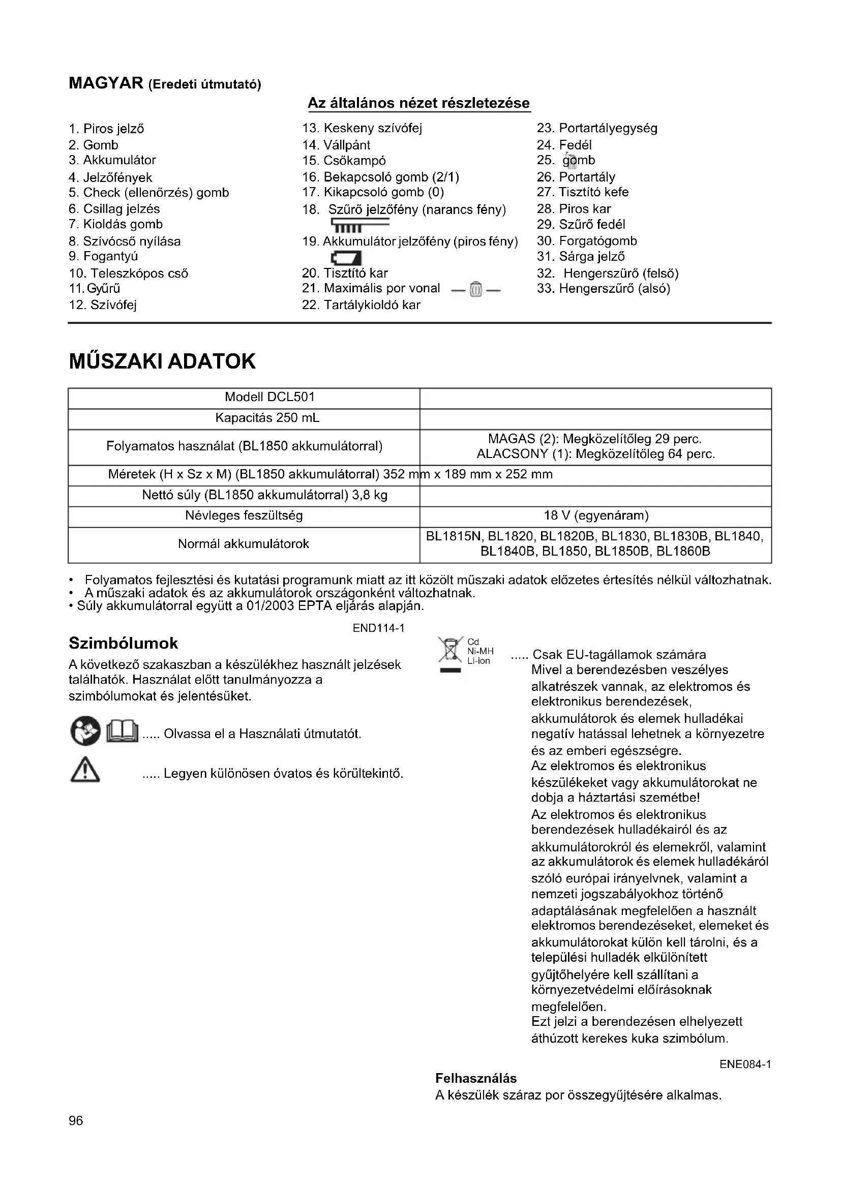 - Súly akkumulátorral együtt a 01/2003 EPTA eljárás alapján. END114-1 Szimbólumok A következő szakaszban a készülékhez használt jelzések találhatók. Használat előtt tanulmányozza a szimbólumokat és jelentésüket. ..... Olvassa el a Használati útmutatót. ..... Legyen különösen óvatos és körültekintő. ..... Csak EU-tagállamok számára Mivel a berendezésben veszélyes alkatrészek vannak, az elektromos és elektronikus berendezések, akkumulátorok és elemek hulladékai negatív hatással lehetnek a környezetre és az emberi egészségre. Az elektromos és elektronikus készülékeket vagy akkumulátorokat ne dobja a háztartási szemétbe! Az elektromos és elektronikus berendezések hulladékairól és az akkumulátorokról és elemekről, valamint az akkumulátorok és elemek hulladékáról szóló európai irányelvnek, valamint a nemzeti jogszabályokhoz történő adaptálásának megfelelően a használt elektromos berendezéseket, elemeket és akkumulátorokat külön kell tárolni, és a települési hulladék elkülönített gyűjtőhelyére kell szállítani a környezetvédelmi előírásoknak megfelelően. Ezt jelzi a berendezésen elhelyezett áthúzott kerekes kuka szimbólum. ENE084-1 Felhasználás A készülék száraz por összegyűjtésére alkalmas.