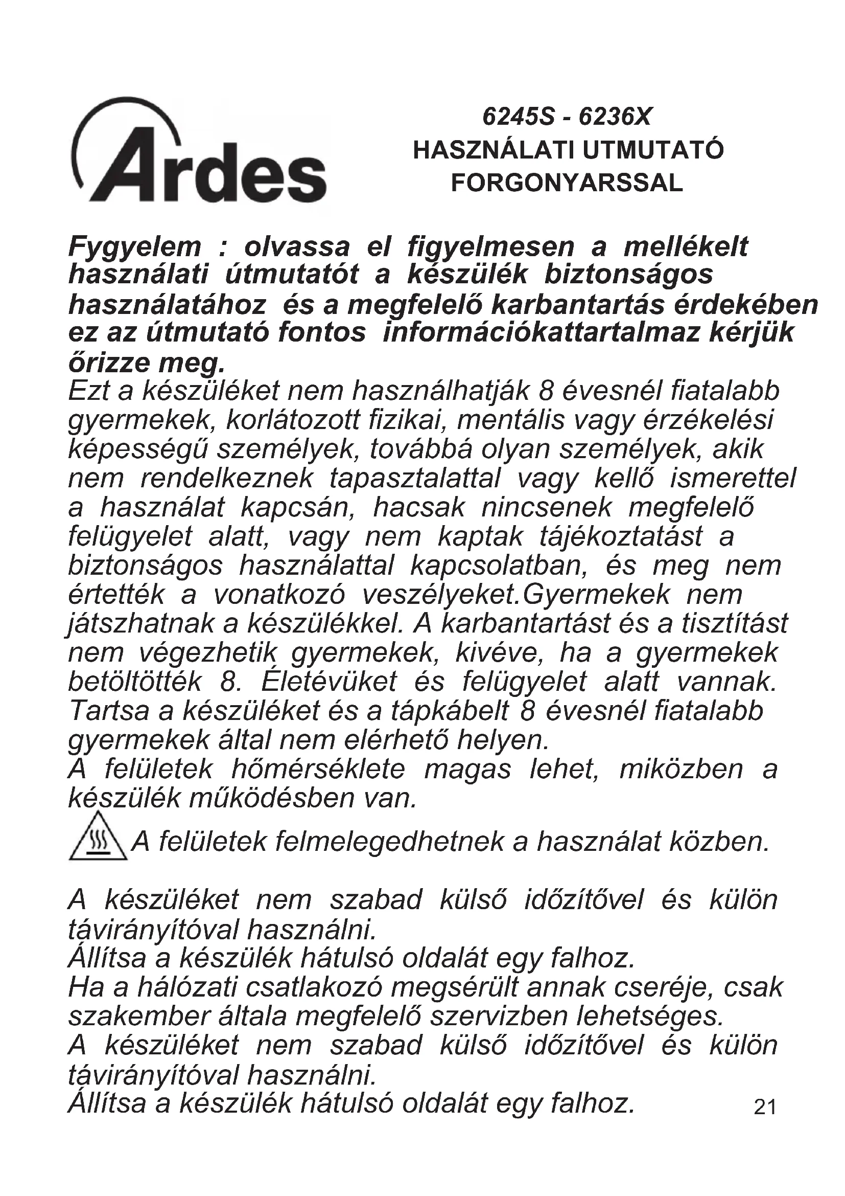 FORGONYARSSAL Fygyelem : olvassa el gyelmesen a mellékelt használati útmutatót a készülék biztonságos használatához és a megfelelő karbantartás érdekében ez az útmutató fontos információkattartalmaz kérjük őrizze meg. Ezt a készüléket nem használhatják 8 évesnél atalabb gyermekek, korlátozott zikai, mentális vagy érzékelési képességű személyek, továbbá olyan személyek, akik nem rendelkeznek tapasztalattal vagy kellő ismerettel a használat kapcsán, hacsak nincsenek megfelelő felügyelet alatt, vagy nem kaptak tájékoztatást a biztonságos használattal kapcsolatban, és meg nem értették a vonatkozó veszélyeket.Gyermekek nem játszhatnak a készülékkel. A karbantartást és a tisztítást nem végezhetik gyermekek, kivéve, ha a gyermekek betöltötték 8. Életévüket és felügyelet alatt vannak. Tartsa a készüléket és a tápkábelt 8 évesnél atalabb gyermekek által nem elérhető helyen. A felületek hőmérséklete magas lehet, miközben a készülék működésben van. A felületek felmelegedhetnek a használat közben. A készüléket nem szabad külső időzítővel és külön távirányítóval használni. Állítsa a készülék hátulsó oldalát egy falhoz. Ha a hálózati csatlakozó megsérült annak cseréje, csak szakember általa megfelelő szervizben lehetséges. A készüléket nem szabad külső időzítővel és külön távirányítóval használni. Állítsa a készülék hátulsó oldalát egy falhoz.22
