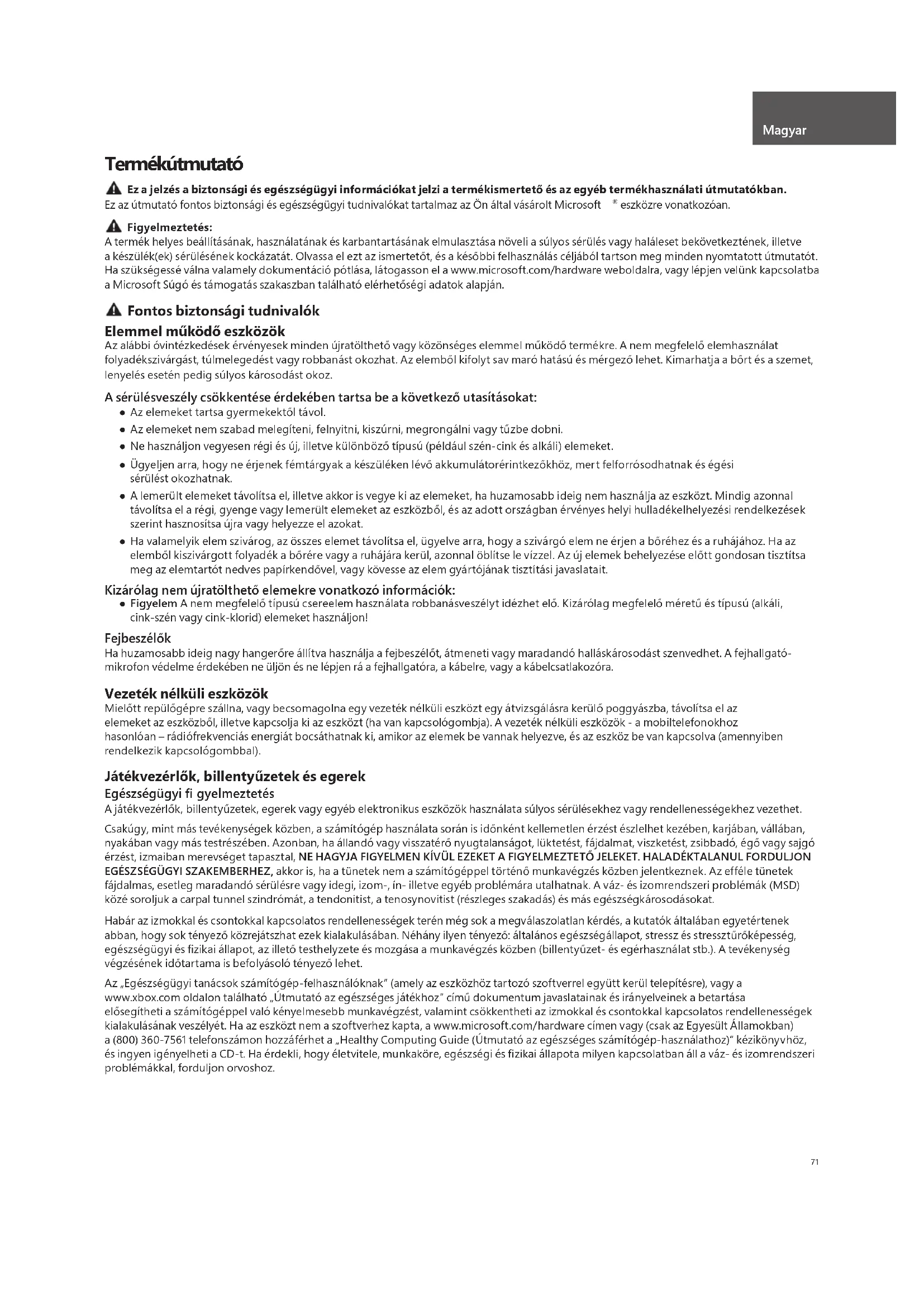 eszközre vonatkozóan. Figyelmeztetés: A termék helyes beállításának, használatának és karbantartásának elmulasztása növeli a súlyos sérülés vagy haláleset bekövetkeztének, illetve a készülék(ek) sérülésének kockázatát. Olvassa el ezt az ismertetőt, és a későbbi felhasználás céljából tartson meg minden nyomtatott útmutatót. Ha szükségessé válna valamely dokumentáció pótlása, látogasson el a www.microsoft.com/hardware weboldalra, vagy lépjen velünk kapcsolatba a Microsoft Súgó és támogatás szakaszban található elérhetőségi adatok alapján. Fontos biztonsági tudnivalók Elemmel működő eszközök Az alábbi óvintézkedések érvényesek minden újratölthető vagy közönséges elemmel működő termékre. A nem megfelelő elemhasználat folyadékszivárgást, túlmelegedést vagy robbanást okozhat. Az elemből kifolyt sav maró hatású és mérgező lehet. Kimarhatja a bőrt és a szemet, lenyelés esetén pedig súlyos károsodást okoz. A sérülésveszély csökkentése érdekében tartsa be a következő utasításokat: ● Az elemeket tartsa gyermekektől távol. ● Az elemeket nem szabad melegíteni, felnyitni, kiszúrni, megrongálni vagy tűzbe dobni. ● Ne használjon vegyesen régi és új, illetve különböző típusú (például szén-cink és alkáli) elemeket. ● Ügyeljen arra, hogy ne érjenek fémtárgyak a készüléken lévő akkumulátorérintkezőkhöz, mert felforrósodhatnak és égési sérülést okozhatnak. ● A lemerült elemeket távolítsa el, illetve akkor is vegye ki az elemeket, ha huzamosabb ideig nem használja az eszközt. Mindig azonnal távolítsa el a régi, gyenge vagy lemerült elemeket az eszközből, és az adott országban érvényes helyi hulladékelhelyezési rendelkezések szerint hasznosítsa újra vagy helyezze el azokat. ● Ha valamelyik elem szivárog, az összes elemet távolítsa el, ügyelve arra, hogy a szivárgó elem ne érjen a bőréhez és a ruhájához. Ha az elemből kiszivárgott folyadék a bőrére vagy a ruhájára kerül, azonnal öblítse le vízzel. Az új elemek behelyezése előtt gondosan tisztítsa meg az elemtartót nedves papírkendővel, vagy kövesse az elem gyártójának tisztítási javaslatait. Kizárólag nem újratölthető elemekre vonatkozó információk: ● Figyelem A nem megfelelő típusú csereelem használata robbanásveszélyt idézhet elő. Kizárólag megfelelő méretű és típusú (alkáli, cink-szén vagy cink-klorid) elemeket használjon! Fejbeszélők Ha huzamosabb ideig nagy hangerőre állítva használja a fejbeszélőt, átmeneti vagy maradandó halláskárosodást szenvedhet. A fejhallgató- mikrofon védelme érdekében ne üljön és ne lépjen rá a fejhallgatóra, a kábelre, vagy a kábelcsatlakozóra. Vezeték nélküli eszközök Mielőtt repülőgépre szállna, vagy becsomagolna egy vezeték nélküli eszközt egy átvizsgálásra kerülő poggyászba, távolítsa el az elemeket az eszközből, illetve kapcsolja ki az eszközt (ha van kapcsológombja). A vezeték nélküli eszközök - a mobiltelefonokhoz hasonlóan – rádiófrekvenciás energiát bocsáthatnak ki, amikor az elemek be vannak helyezve, és az eszköz be van kapcsolva (amennyiben rendelkezik kapcsológombbal). Játékvezérlők, billentyűzetek és egerek Egészségügyi fi gyelmeztetés A játékvezérlők, billentyűzetek, egerek vagy egyéb elektronikus eszközök használata súlyos sérülésekhez vagy rendellenességekhez vezethet. Csakúgy, mint más tevékenységek közben, a számítógép használata során is időnként kellemetlen érzést észlelhet kezében, karjában, vállában, nyakában vagy más testrészében. Azonban, ha állandó vagy visszatérő nyugtalanságot, lüktetést, fájdalmat, viszketést, zsibbadó, égő vagy sajgó érzést, izmaiban merevséget tapasztal, NE HAGYJA FIGYELMEN KÍVÜL EZEKET A FIGYELMEZTETŐ JELEKET. HALADÉKTALANUL FORDULJON EGÉSZSÉGÜGYI SZAKEMBERHEZ, akkor is, ha a tünetek nem a számítógéppel történő munkavégzés közben jelentkeznek. Az efféle tünetek fájdalmas, esetleg maradandó sérülésre vagy idegi, izom-, ín- illetve egyéb problémára utalhatnak. A váz- és izomrendszeri problémák (MSD) közé soroljuk a carpal tunnel szindrómát, a tendonitist, a tenosynovitist (részleges szakadás) és más egészségkárosodásokat. Habár az izmokkal és csontokkal kapcsolatos rendellenességek terén még sok a megválaszolatlan kérdés, a kutatók általában egyetértenek abban, hogy sok tényező közrejátszhat ezek kialakulásában. Néhány ilyen tényező: általános egészségállapot, stressz és stressztűrőképesség, egészségügyi és fi zikai állapot, az illető testhelyzete és mozgása a munkavégzés közben (billentyűzet- és egérhasználat stb.). A tevékenység végzésének időtartama is befolyásoló tényező lehet. Az „Egészségügyi tanácsok számítógép-felhasználóknak” (amely az eszközhöz tartozó szoftverrel együtt kerül telepítésre), vagy a www.xbox.com oldalon található „Útmutató az egészséges játékhoz” című dokumentum javaslatainak és irányelveinek a betartása elősegítheti a számítógéppel való kényelmesebb munkavégzést, valamint csökkentheti az izmokkal és csontokkal kapcsolatos rendellenességek kialakulásának veszélyét. Ha az eszközt nem a szoftverhez kapta, a www.microsoft.com/hardware címen vagy (csak az Egyesült Államokban) a (800) 360-7561 telefonszámon hozzáférhet a „Healthy Computing Guide (Útmutató az egészséges számítógép-használathoz)” kézikönyvhöz, és ingyen igényelheti a CD-t. Ha érdekli, hogy életvitele, munkaköre, egészségi és fi zikai állapota milyen kapcsolatban áll a váz- és izomrendszeri problémákkal, forduljon orvoshoz. Magyar72 Fényérzékenységi rohamok Az emberek egy kis százaléka villogó fényeket vagy videojáté