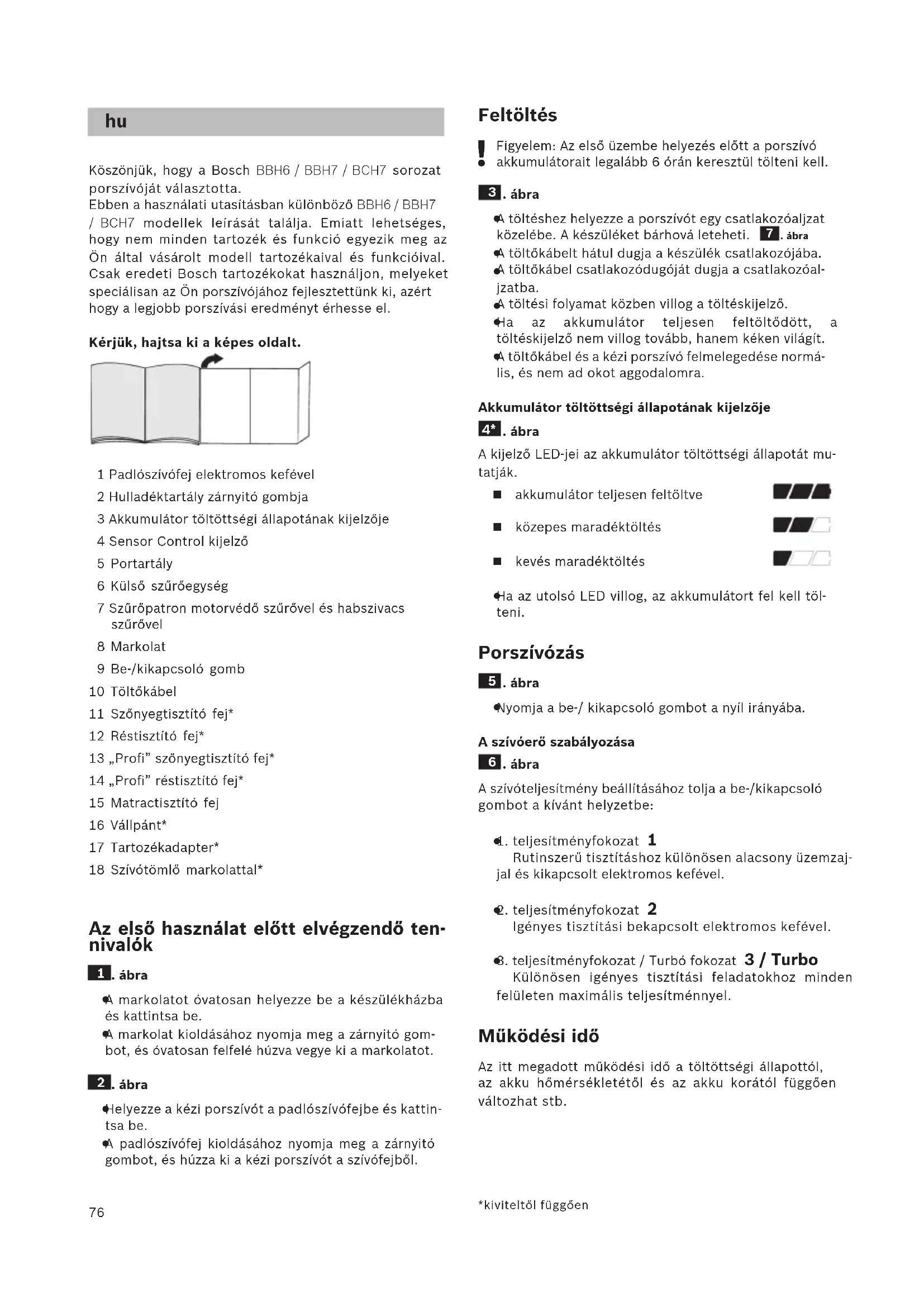 Köszönjük, hogy a Bosch BBH6 / BBH7 / BCH7 sorozat porszívóját választotta. Ebben a használati utasításban különböző BBH6 / BBH7 / BCH7 modellek leírását találja. Emiatt lehetséges, hogy nem minden tartozék és funkció egyezik meg az Ön által vásárolt modell tartozékaival és funkcióival. Csak eredeti Bosch tartozékokat használjon, melyeket speciálisan az Ön porszívójához fejlesztettünk ki, azért hogy a legjobb porszívási eredményt érhesse el. Kérjük, hajtsa ki a képes oldalt. 1 Padlószívófej elektromos kefével 2 Hulladéktartály zárnyitó gombja 3 Akkumulátor töltöttségi állapotának kijelzője 4 Sensor Control kijelző 5 Portartály 6 Külső szűrőegység 7 Szűrőpatron motorvédő szűrővel és habszivacs szűrővel 8 Markolat 9 Be-/kikapcsoló gomb 10 Töltőkábel 11 Szőnyegtisztító fej* 12 Réstisztító fej* 13 „Profi” szőnyegtisztító fej* 14 „Profi” réstisztító fej* 15 Matractisztító fej 16 Vállpánt* 17 Tartozékadapter* 18 Szívótömlő markolattal* Az első használat előtt elvégzendő ten- nivalók