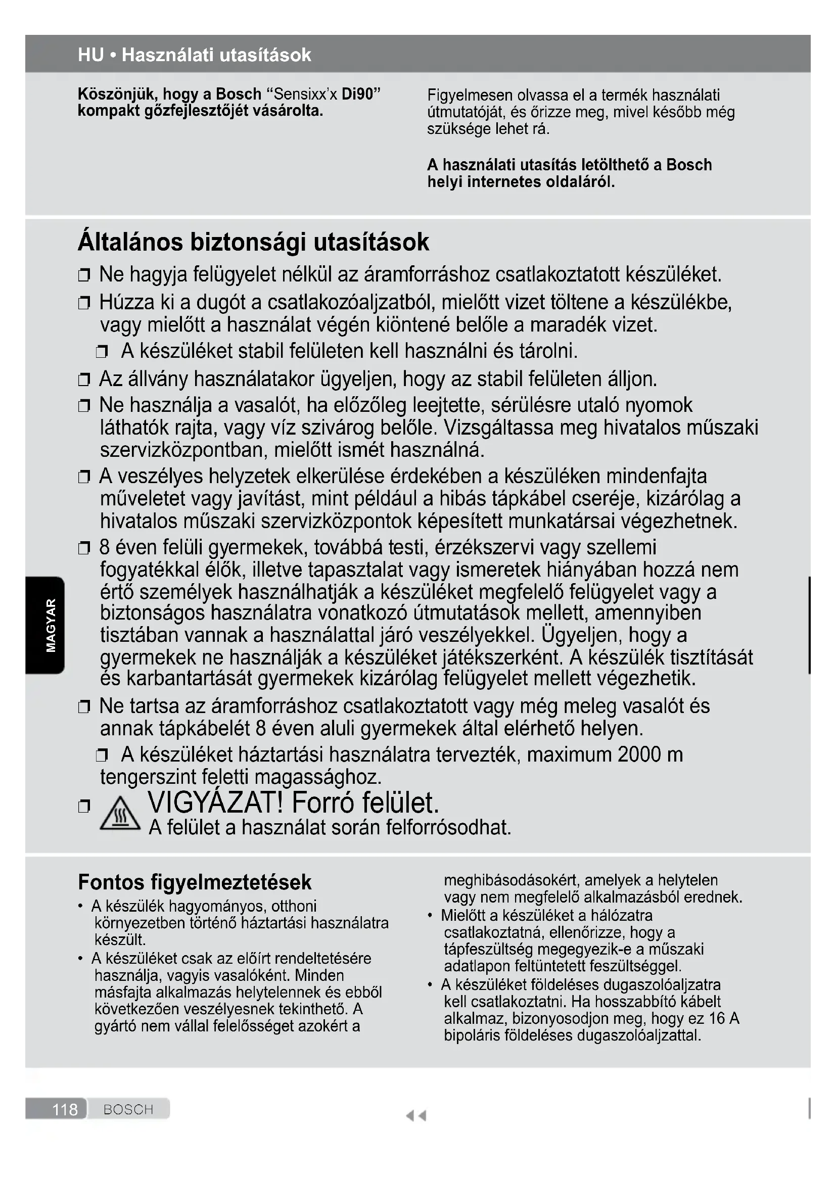 BOSCHMAGYARKöszönjük, hogy a Bosch “Sensixx’x Di90” Figyelmesen olvassa el a termék használati útmutatóját, és őrizze meg, mivel később még szüksége lehet rá.helyi internetes oldaláról. Általános biztonsági utasítások ❐ Ne hagyja felügyelet nélkül az áramforráshoz csatlakoztatott készüléket. ❐ Húzza ki a dugót a csatlakozóaljzatból, mielőtt vizet töltene a készülékbe, vagy mielőtt a használat végén kiöntené belőle a maradék vizet. ❐ A készüléket stabil felületen kell használni és tárolni. ❐ Az állvány használatakor ügyeljen, hogy az stabil felületen álljon. ❐ Ne használja a vasalót, ha előzőleg leejtette, sérülésre utaló nyomok láthatók rajta, vagy víz szivárog belőle. Vizsgáltassa meg hivatalos műszaki szervizközpontban, mielőtt ismét használná. ❐ A veszélyes helyzetek elkerülése érdekében a készüléken mindenfajta műveletet vagy javítást, mint például a hibás tápkábel cseréje, kizárólag a hivatalos műszaki szervizközpontok képesített munkatársai végezhetnek. ❐ 8 éven felüli gyermekek, továbbá testi, érzékszervi vagy szellemi fogyatékkal élők, illetve tapasztalat vagy ismeretek hiányában hozzá nem értő személyek használhatják a készüléket megfelelő felügyelet vagy a biztonságos használatra vonatkozó útmutatások mellett, amennyiben tisztában vannak a használattal járó veszélyekkel. Ügyeljen, hogy a gyermekek ne használják a készüléket játékszerként. A készülék tisztítását és karbantartását gyermekek kizárólag felügyelet mellett végezhetik. ❐ Ne tartsa az áramforráshoz csatlakoztatott vagy még meleg vasalót és annak tápkábelét 8 éven aluli gyermekek által elérhető helyen. ❐ A készüléket háztartási használatra tervezték, maximum 2000 m tengerszint feletti magassághoz. ❐ VIGYÁZAT! Forró felület. A felület a használat során felforrósodhat.