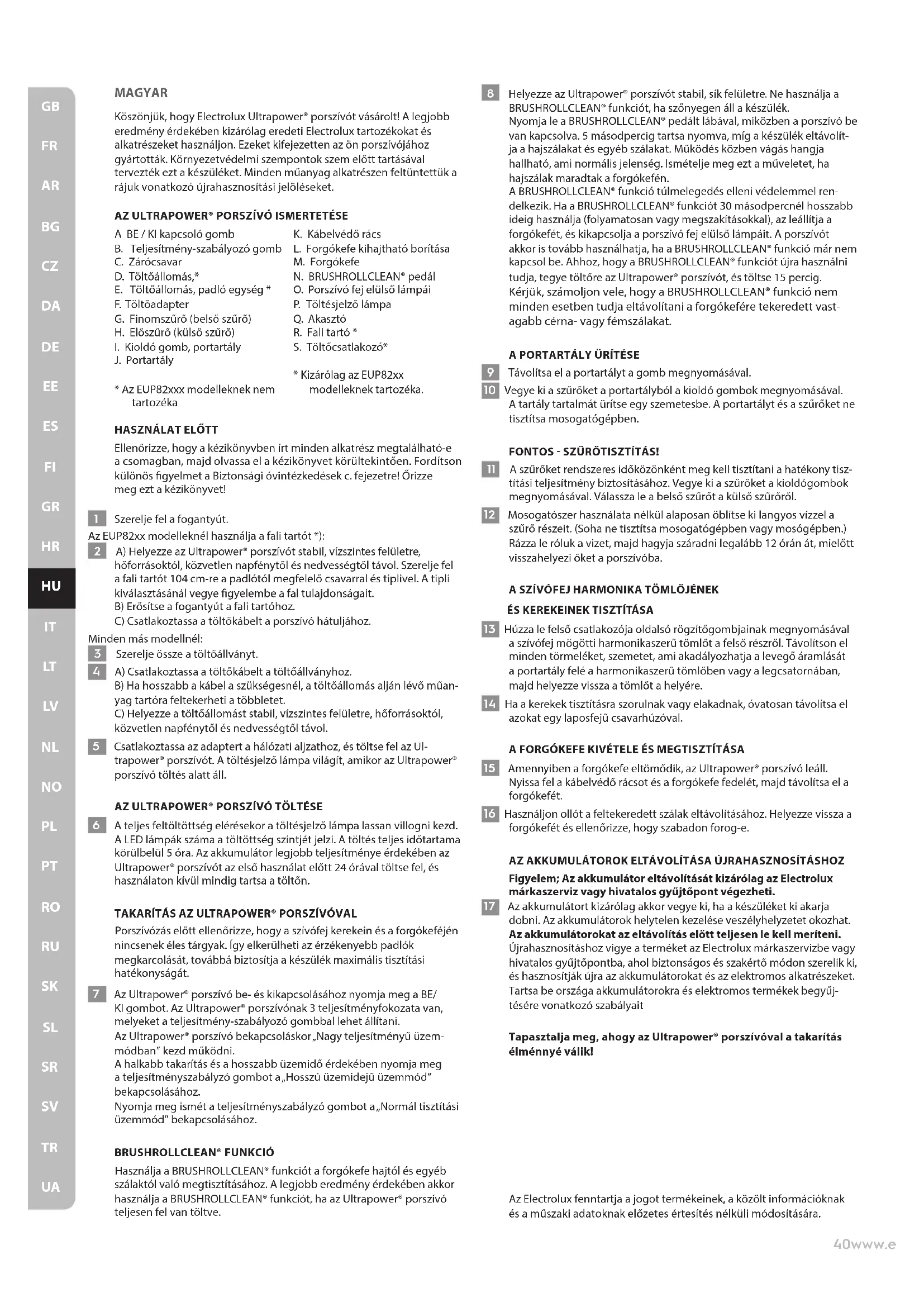 13 Húzza le felső csatlakozója oldalsó rögzítőgombjainak megnyomásával a szívófej mögötti harmonikaszerű tömlőt a felső részről. Távolítson el minden törmeléket, szemetet, ami akadályozhatja a levegő áramlását a portartály felé a harmonikaszerű tömlőben vagy a legcsatornában, majd helyezze vissza a tömlőt a helyére. 14 Ha a kerekek tisztításra szorulnak vagy elakadnak, óvatosan távolítsa el azokat egy laposfejű csavarhúzóval. A FORGÓKEFE KIVÉTELE ÉS MEGTISZTÍTÁSA 15 Amennyiben a forgókefe eltömődik, az Ultrapower® porszívó leáll. Nyissa fel a kábelvédő rácsot és a forgókefe fedelét, majd távolítsa el a forgókefét. 16 Használjon ollót a feltekeredett szálak eltávolításához. Helyezze vissza a forgókefét és ellenőrizze, hogy szabadon forog-e. AZ AKKUMULÁTOROK ELTÁVOLÍTÁSA ÚJRAHASZNOSÍTÁSHOZ Figyelem; Az akkumulátor eltávolítását kizárólag az Electrolux márkaszerviz vagy hivatalos gyűjtőpont végezheti. 17 Az akkumulátort kizárólag akkor vegye ki, ha a készüléket ki akarja dobni. Az akkumulátorok helytelen kezelése veszélyhelyzetet okozhat. Az akkumulátorokat az eltávolítás előtt teljesen le kell meríteni. Újrahasznosításhoz vigye a terméket az Electrolux márkaszervizbe vagy hivatalos gyűjtőpontba, ahol biztonságos és szakértő módon szerelik ki, és hasznosítják újra az akkumulátorokat és az elektromos alkatrészeket. Tartsa be országa akkumulátorokra és elektromos termékek begyűj- tésére vonatkozó szabályait Tapasztalja meg, ahogy az Ultrapower® porszívóval a takarítás élménnyé válik!41www.electrolux.com