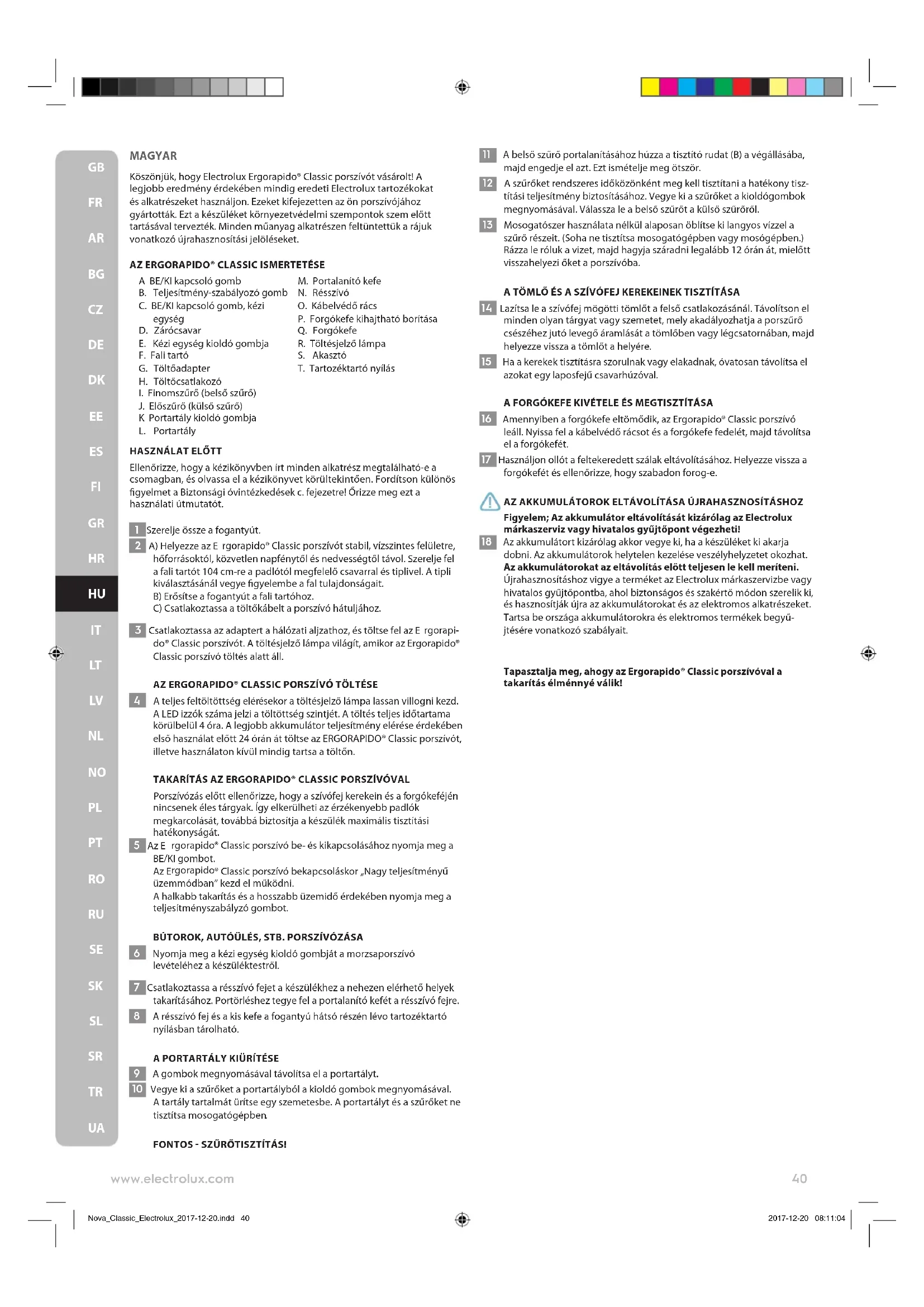 Nova_Classic_Electrolux_2017-12-20.indd 39 2017-12-20 08:11:03MAGYAR Köszönjük, hogy Electrolux Ergorapido® Classic porszívót vásárolt! A legjobb eredmény érdekében mindig eredeti Electrolux tartozékokat és alkatrészeket használjon. Ezeket kifejezetten az ön porszívójához gyártották. Ezt a készüléket környezetvédelmi szempontok szem előtt tartásával tervezték. Minden műanyag alkatrészen feltüntettük a rájuk vonatkozó újrahasznosítási jelöléseket.