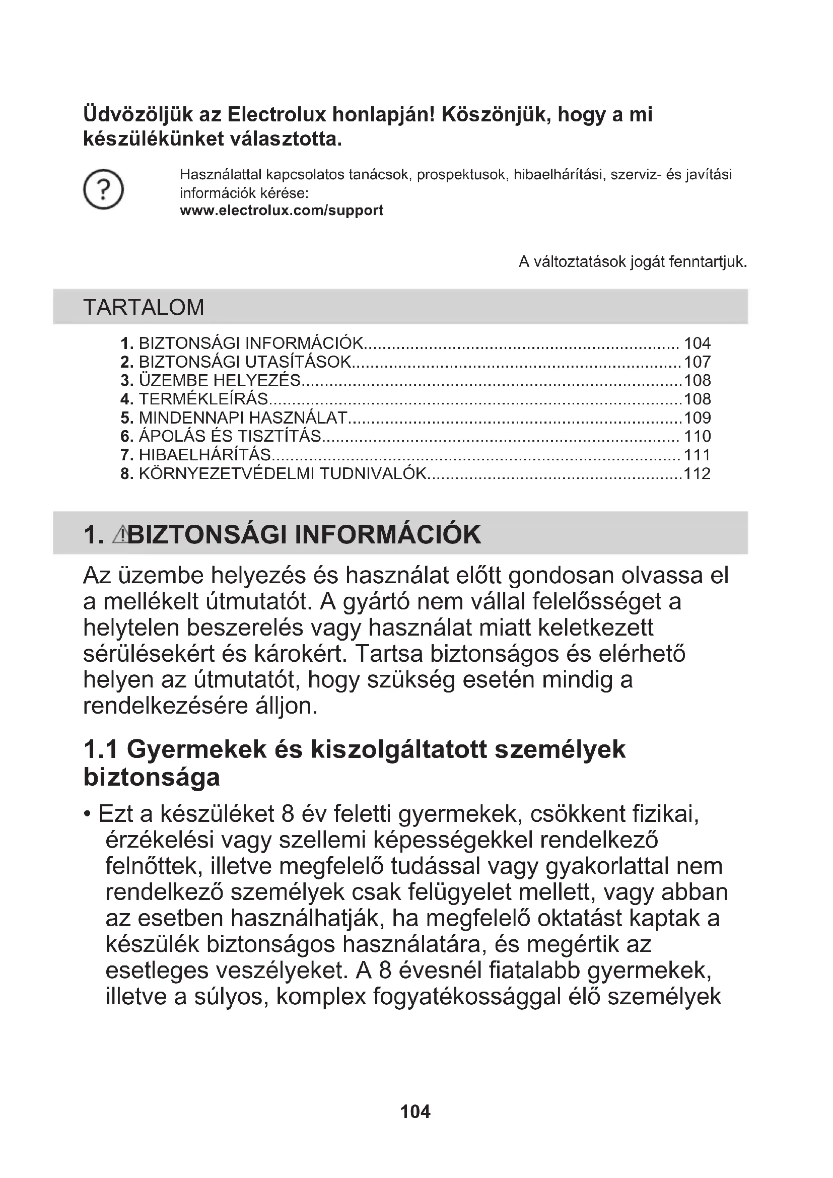 Reciklirajte materijale sa simbolom . Ambalažu za recikliranje odložite u prikladne spremnike. Pomozite u zaštiti okoliša i ljudskog zdravlja, kao i u recikliranju otpada od električnih i elektroničkih uređaja. Uređaje označene simbolom ne bacajte zajedno s kućnim otpadom. Proizvod odnesite na lokalno reciklažno mjesto ili kontaktirajte nadležnu službu. 103Üdvözöljük az Electrolux honlapján! Köszönjük, hogy a mi készülékünket választotta. Használattal kapcsolatos tanácsok, prospektusok, hibaelhárítási, szerviz- és javításiinformációk kérése:www.electrolux.com/supportA változtatások jogát fenntartjuk. TARTALOM