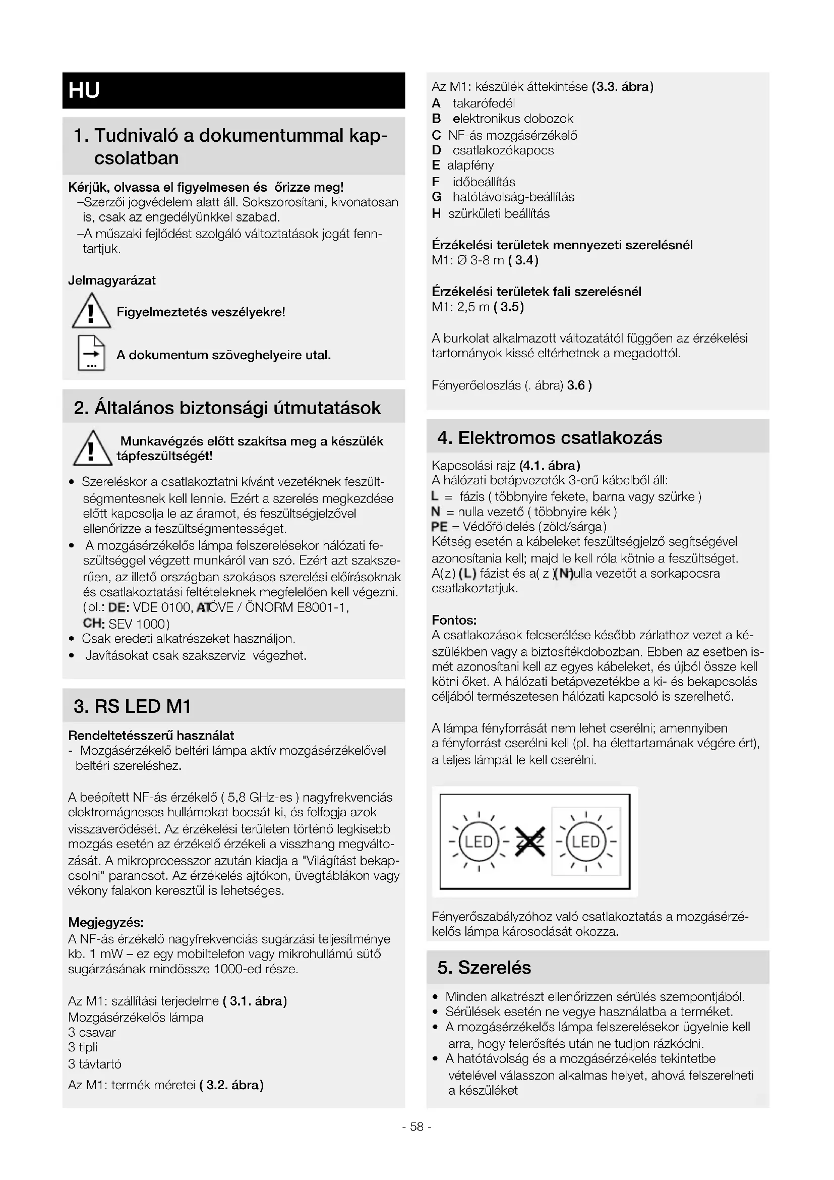 Rendeltetésszerű használat - Mozgásérzékelő beltéri lámpa aktív mozgásérzékelővel beltéri szereléshez. A beépített NF-ás érzékelő ( 5,8 GHz-es ) nagyfrekvenciás elektromágneses hullámokat bocsát ki, és felfogja azok visszaverődését. Az érzékelési területen történő legkisebb mozgás esetén az érzékelő érzékeli a visszhang megválto- zását. A mikroprocesszor azután kiadja a "Világítást bekap- csolni" parancsot. Az érzékelés ajtókon, üvegtáblákon vagy vékony falakon keresztül is lehetséges. Megjegyzés: A NF-ás érzékelő nagyfrekvenciás sugárzási teljesítménye kb. 1 mW – ez egy mobiltelefon vagy mikrohullámú sütő sugárzásának mindössze 1000-ed része. Az M1: szállítási terjedelme ( 3.1. ábra ) Mozgásérzékelős lámpa 3 csavar 3 tipli 3 távtartó Az M1: termék méretei ( 3.2. ábra ) !- 59 - A szerelés lépései