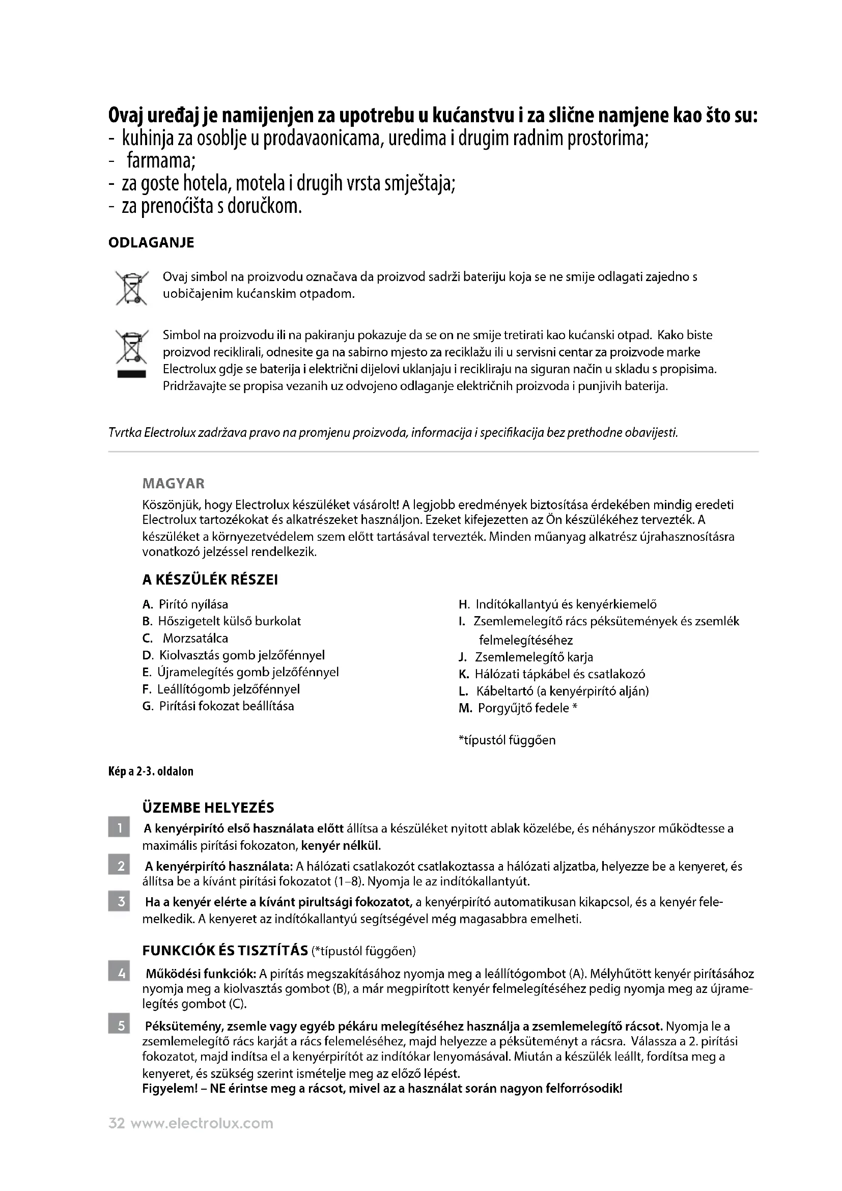 - Površine se mogu zagrijati tijekom upotrebe .32 www.electrolux.com Ovaj uređaj je namijenjen za upotrebu u kućanstvu i za slične namjene kao što su: - kuhinja za osoblje u prodavaonicama, uredima i drugim radnim prostorima; - farmama; - za goste hotela, motela i drugih vrsta smještaja; - za prenoćišta s doručkom. ODLAGANJE Ovaj simbol na proizvodu označava da proizvod sadrži bateriju koja se ne smije odlagati zajedno s uobičajenim kućanskim otpadom. Simbol na proizvodu ili na pakiranju pokazuje da se on ne smije tretirati kao kućanski otpad. Kako biste proizvod reciklirali, odnesite ga na sabirno mjesto za reciklažu ili u servisni centar za proizvode marke Electrolux gdje se baterija i električni dijelovi uklanjaju i recikliraju na siguran način u skladu s propisima. Pridržavajte se propisa vezanih uz odvojeno odlaganje električnih proizvoda i punjivih baterija. Tvrtka Electrolux zadržava pravo na promjenu proizvoda, informacija i specikacija bez prethodne obavijesti. MAGYAR Köszönjük, hogy Electrolux készüléket vásárolt! A legjobb eredmények biztosítása érdekében mindig eredeti Electrolux tartozékokat és alkatrészeket használjon. Ezeket kifejezetten az Ön készülékéhez tervezték. A készüléket a környezetvédelem szem előtt tartásával tervezték. Minden műanyag alkatrész újrahasznosításra vonatkozó jelzéssel rendelkezik. A KÉSZÜLÉK RÉSZEI A. Pirító nyílása B. Hőszigetelt külső burkolat C. Morzsatálca D. Kiolvasztás gomb jelzőfénnyel E. Újramelegítés gomb jelzőfénnyel F. Leállítógomb jelzőfénnyel G. Pirítási fokozat beállítása H. Indítókallantyú és kenyérkiemelő