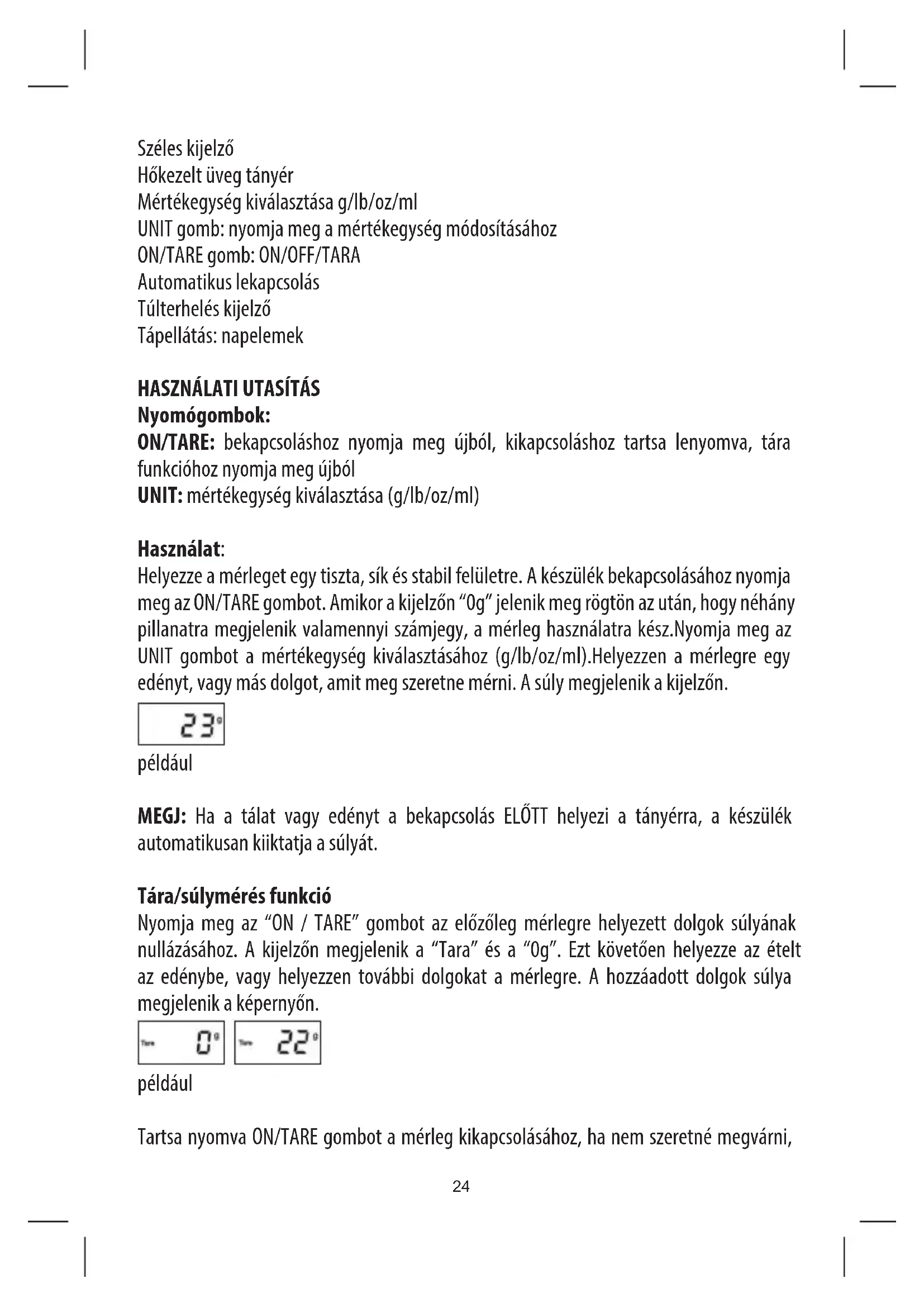 Nyomógombok: ON/TARE: bekapcsoláshoz nyomja meg újból, kikapcsoláshoz tartsa lenyomva, tára funkcióhoz nyomja meg újból UNIT: mértékegység kiválasztása (g/lb/oz/ml) Használat: Helyezze a mérleget egy tiszta, sík és stabil felületre. A készülék bekapcsolásához nyomja meg az ON/TARE gombot. Amikor a kijelzőn “0g” jelenik meg rögtön az után, hogy néhány pillanatra megjelenik valamennyi számjegy, a mérleg használatra kész.Nyomja meg az UNIT gombot a mértékegység kiválasztásához (g/lb/oz/ml).Helyezzen a mérlegre egy edényt, vagy más dolgot, amit meg szeretne mérni. A súly megjelenik a kijelzőn. például MEGJ: Ha a tálat vagy edényt a bekapcsolás ELŐTT helyezi a tányérra, a készülék automatikusan kiiktatja a súlyát. Tára/súlymérés funkció Nyomja meg az “ON / TARE” gombot az előzőleg mérlegre helyezett dolgok súlyának nullázásához. A kijelzőn megjelenik a “Tara” és a “0g”. Ezt követően helyezze az ételt az edénybe, vagy helyezzen további dolgokat a mérlegre. A hozzáadott dolgok súlya megjelenik a képernyőn. például Tartsa nyomva ON/TARE gombot a mérleg kikapcsolásához, ha nem szeretné megvárni,24
